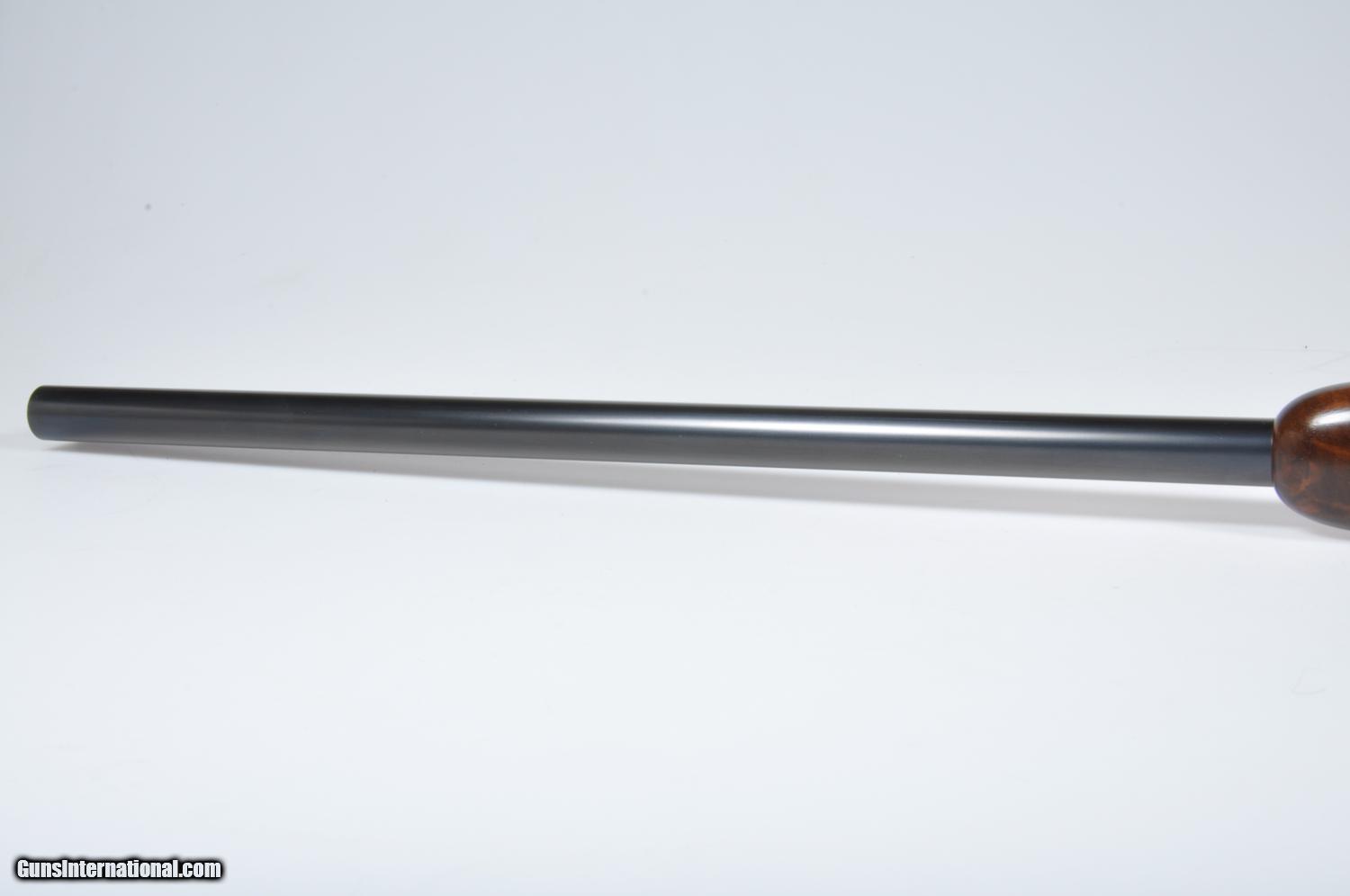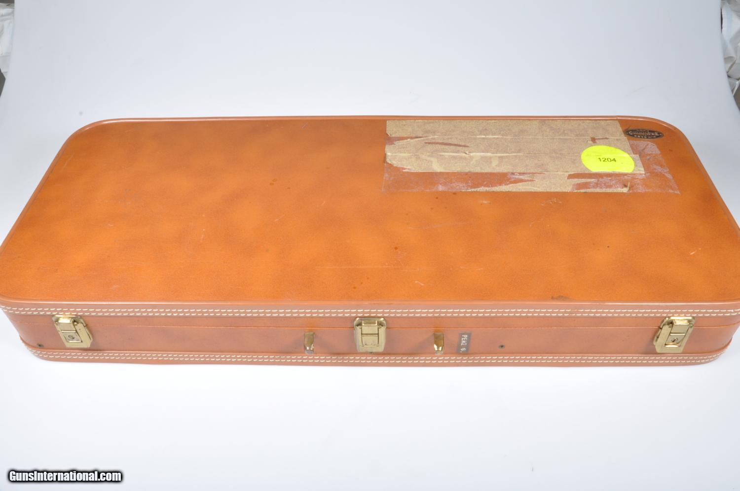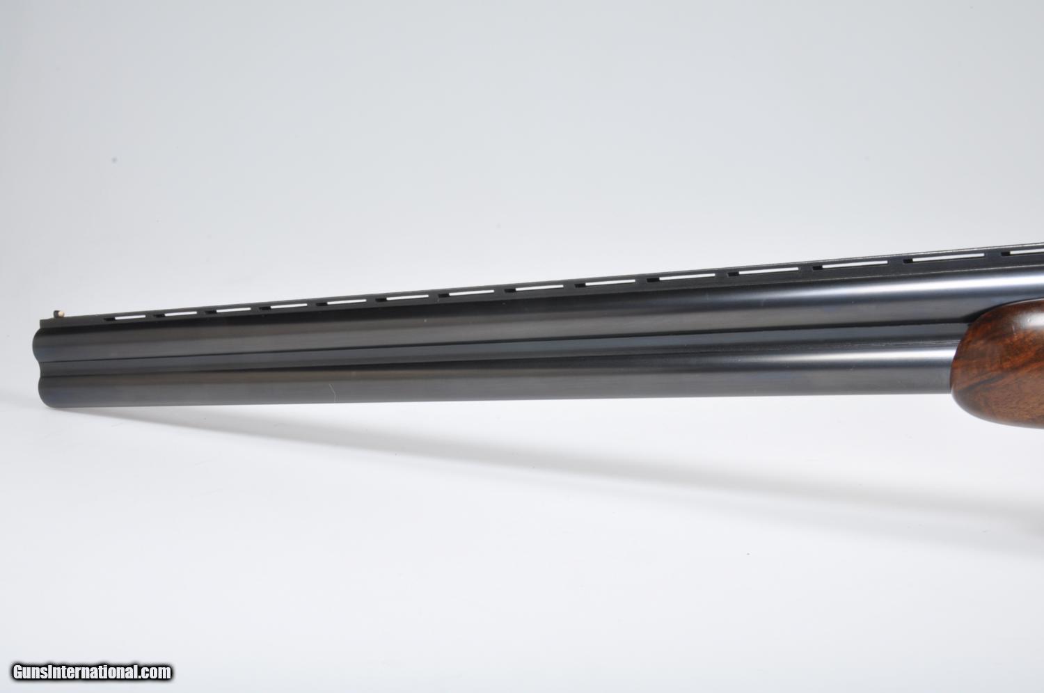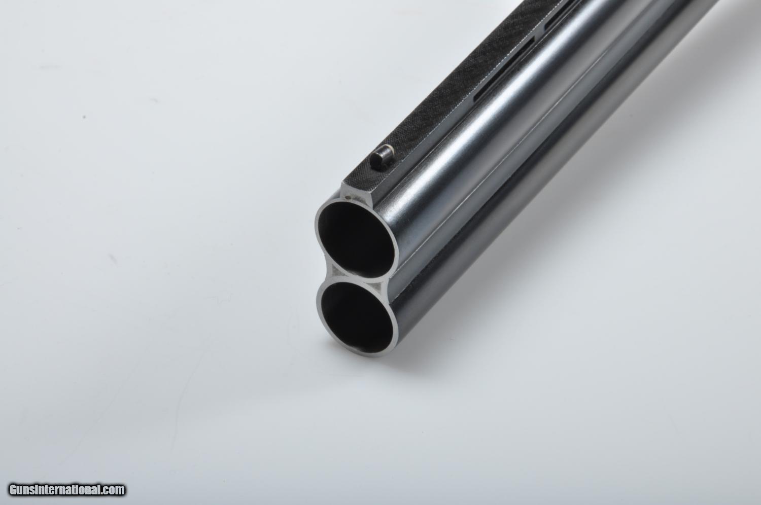 Description: 12 gauge, 2-3/4″ chambers. Three sets of 29″ demi-bloc barrels marked with “I”, “II”, and “II” over a lazy “I” are choked IC and Mod, Mod and full, and Full and full, and are each fitted with concave, matted, ventilated rib. Top rights of barrels are engraved “PERAZZI BRESCIA”, and top lefts with “MADE ESPECIALLY FOR GEORGE NEARY”. Bottoms of mono-blocs are stamped with matching serial numbers, makers initials (MAP), and 1967 Italian nitro proofs. Bottoms of barrels are engraved “ACCIAIO PHONIX DEMIBLOC”. All barrels are served by a single forend. Coin finished, low profile, full sidelock, OU action features non-automatic safety (S inlaid in gold), gold line tumbler end cocking indicators, and single non-selective trigger. Action is engraved with full coverage semi relief, boldly shaded, open scrolling acanthus, highlighted by a mixture of mythological beasts including gargoyles, griffins, and chickens peering through foliage in classic baroque style. Central motifs on sideplates are of bulldogs heads. Bottom of action portrays a face-on griffin, wings outstretched over a fox and some other noxious beast. “PERAZZI BRESCIA” is engraved on forend iron cutout. Blued top lever has matching foliage, and thumb piece is pierced and in the form of a crouching griffin. Foliage and beasts continue onto the trigger guard which has the serial number at grip. This very fine classic engraving is by noted engraver to Perazzi, Abbiatico & Salvinelli, Fabbri et al, Angelo Galeazzi, whose signature is on trigger plate. Fine exhibition quality marbled and stump figured European walnut straight grip buttstock with slight Monte Carlo, measures 14-5/8″ over leather faced Silver type pad. Very closely spaced, perhaps 36 LPI, point pattern checkering with mullered borders is at grip. A gold oval engraved “JCB” is on toe line. Matching semi-beavertail one piece forend has Anson type release with catch in central escutcheon similar in appearance to a Deeley release. Barrel set “I”: Bore diameter: top -.731, bottom -.728. Bore restrictions: top -.007 (IC), bottom -.032 (full). Barrel set “II”: Bore diameter: top -.725, bottom -.724. Bore restrictions: top -.027 (mod), bottom -.038 (full). Barrel set “II” over lazy “I”: Bore diameter: top -.728, bottom -.729. Bore restrictions: top -.028 (Imod), bottom -.045 (extra full). Drop at heel: 2-1/16″, drop at comb: 1-5/16″. Weight: 7 lbs 13 oz. Length of pull: 14-5/8″. Browning vinyl case with space for action and three sets of barrels contains a set of four rosewood handled turnscrews, and a 3-pc rosewood and brass cleaning rod with black leather case containing mop, jag, and brush. Provenance: Internet info on Galeazzi. Condition: Excellent. Barrels retain nearly all of their original blue with slight silvering at muzzles and sharp edges, with a few light marks. Action retains essentially all of its coin finish. Breech faces show very faint firing halos. Stocks retain most of what appears to be their original oil finish, thinning, with some light marks, checkering lightly worn. Action is very slightly loose with barrel set “I” and barrels are very slightly off face. Action is tight as a tick with barrel sets “II” and “II” with lazy “I”. Bores are excellent. Mechanically crisp. Bottom ejector is a little weak. Case is good. Accessories are like new. A fine early collectible Perazzi embellished by one of the all time great Italian “new renaissance” engravers. No California Sales My office hours are 7am-4pm CST Monday through Thursday and 7am-11am Friday. Emails or phone calls received after hours and on the weekend will be answered on the following business day. SOLD Manufacturer: Perazzi Model: Extra Lusso Serial Number: 5284 Gauge Info: 12 |