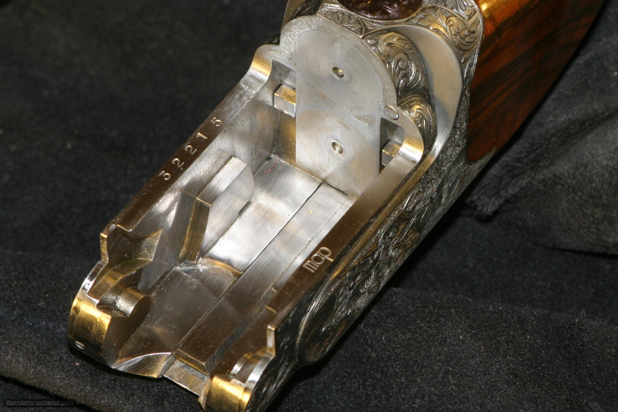 Description: Built in 1968, SO style engraving(Game Scene), 30" vent rib barrel with .025 and .040 chokes , Drop-out non- selective trigger group w/ v-springs. French Walnut,fine checkering 8 1/4 lbs. LOP 14 1/4"-1 1/2"-1 1/2" Excellent condition overall. SOLD |