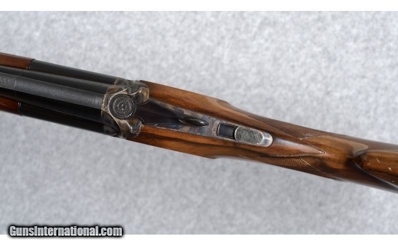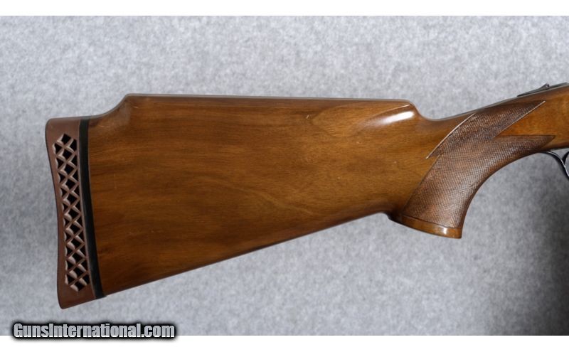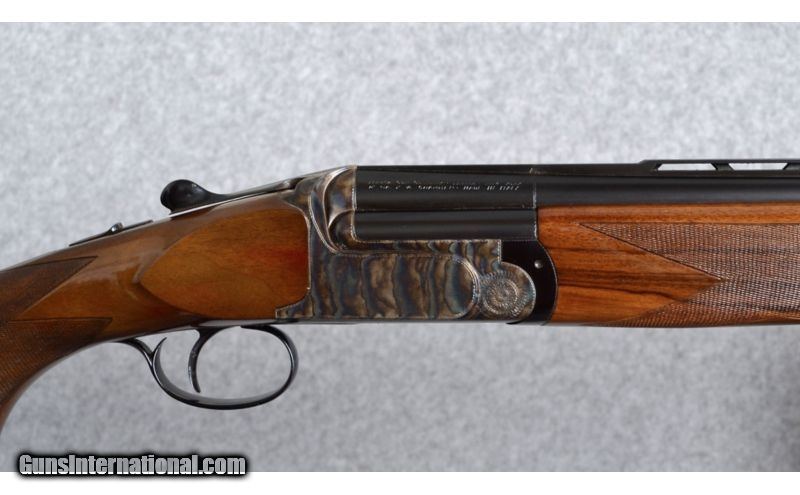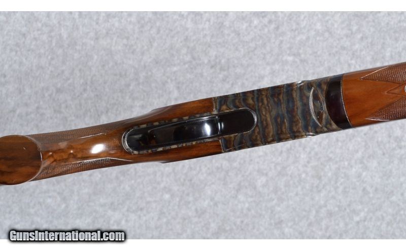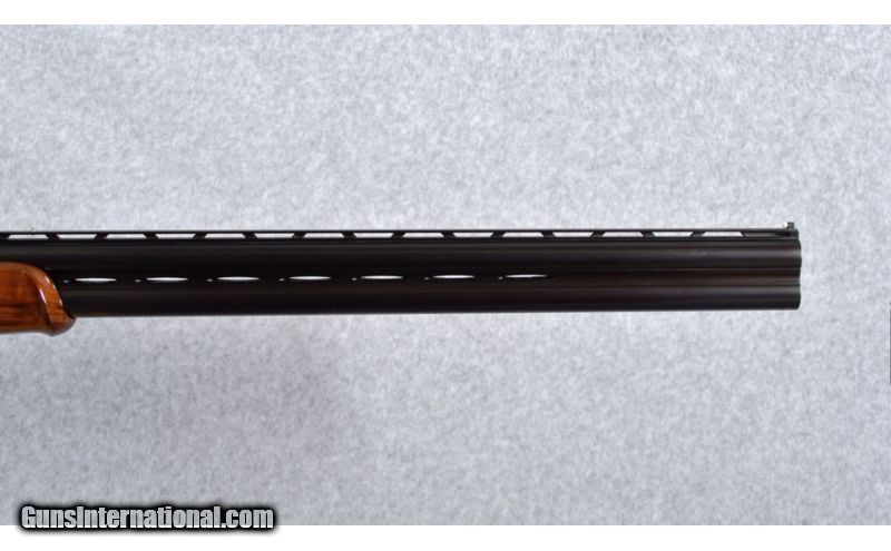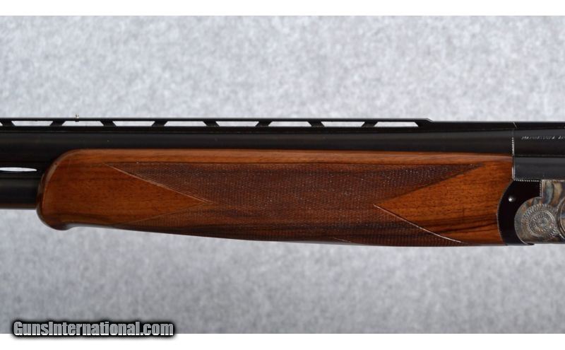 Description: Perrazi Mirage 12 Gauge. Features include 28" barrels with ejectors, 2 3/4" chambers, vented rib with a small silver intermediate bead and a white front bead, fixed choked in modified (.019) and light full (.033); thumb actuated, single selective trigger and trigger group is removable; Checkered walnut stocks, schnabel forend and raised comb butt-stock with a Perazzi factory recoil pad; 14 1/2 inch length of pull. The shotgun weighs 7 Lbs., 14 Oz. The shotgun was imported and marketed by Ithaca Gun Company, Ithaca, New York. See bullet points for condition. SOLD Caliber Info: 12 Gauge Chambers: 2 3/4" Chambers. Metal Condition: Very good blue and case colors with some fading of the case color on the left side of the receiver. The action release lever favors right of center. Wood Condition: There are scattered scratches and dings in the butt-stock, where the forend has just a few light scratches. Bore Condition: Very good bore. Barrels: 28" Barrels. Triggers: Detachable trigger group. Stock: Walnut, checkered and with a raised comb. Stock Dimensions: 14 1/2" Length of pull. Fore End: Schnable, checkered walnut. Butt Pad: Perazzi recoil pad. Weight: 7 Lbs. 14 Oz. Sights: Matted, tapered vent rib with a intermediate and front bead sights. Chokes: Fixed: Mod. (.019) & Lt. Full (.033) Extras: Includes a vintage/time period Perazzi travel case. Brown leather-grain exterior with gold cloth interior. Item Location: Boise, ID |