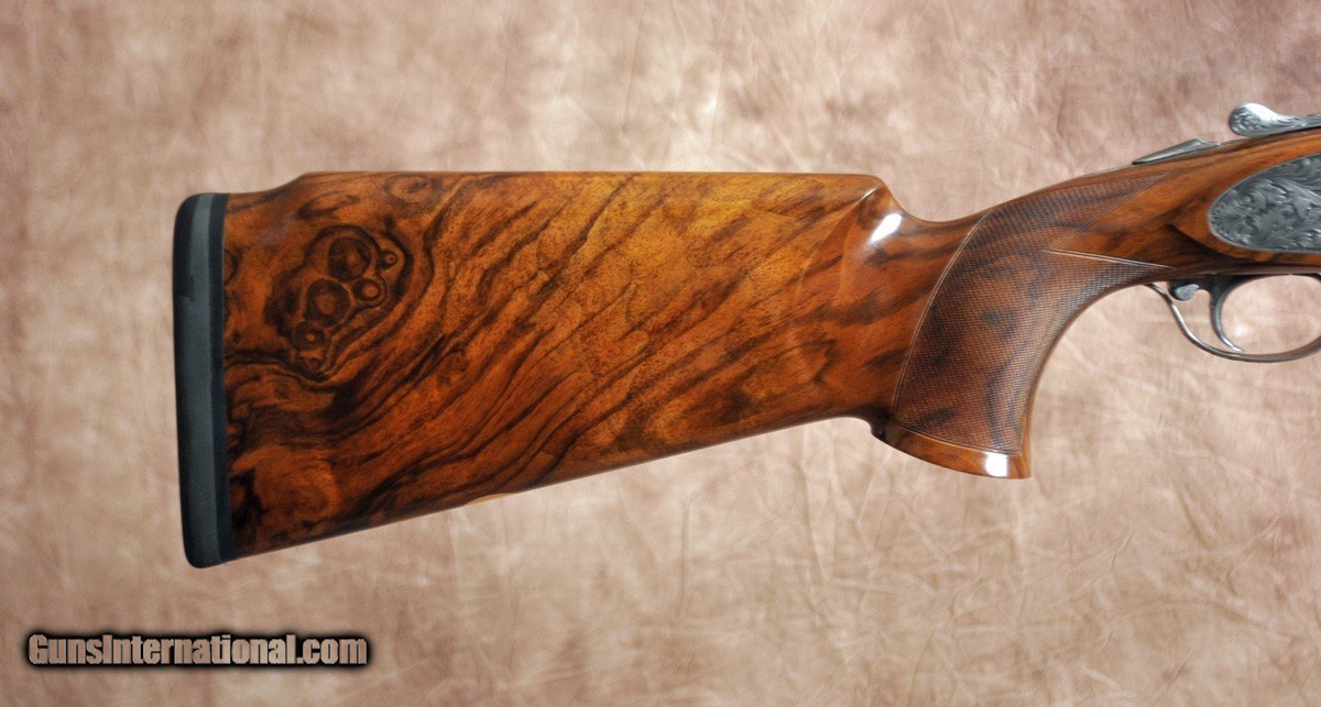 Description: New P&V Maestro Acanthus Scroll Sporter 12ga. Features factory choke tube 34" barrels with flat hand filed sporting rib. Side plate receiver with selectable removable trigger. Incredible deep Acanthus scroll engraving pattern hand engraved by Italian Master engraver G. Arici. Outstanding right handed Monte Carlo sporting stock with slim Beavertail forend complete with gold P&V crest inlaid in forend. Comes in factory leather presentation case. SOLD Shotgun Gauge: 12 Gauge |