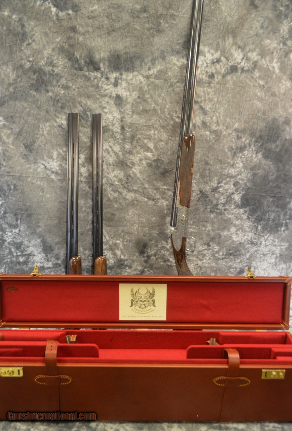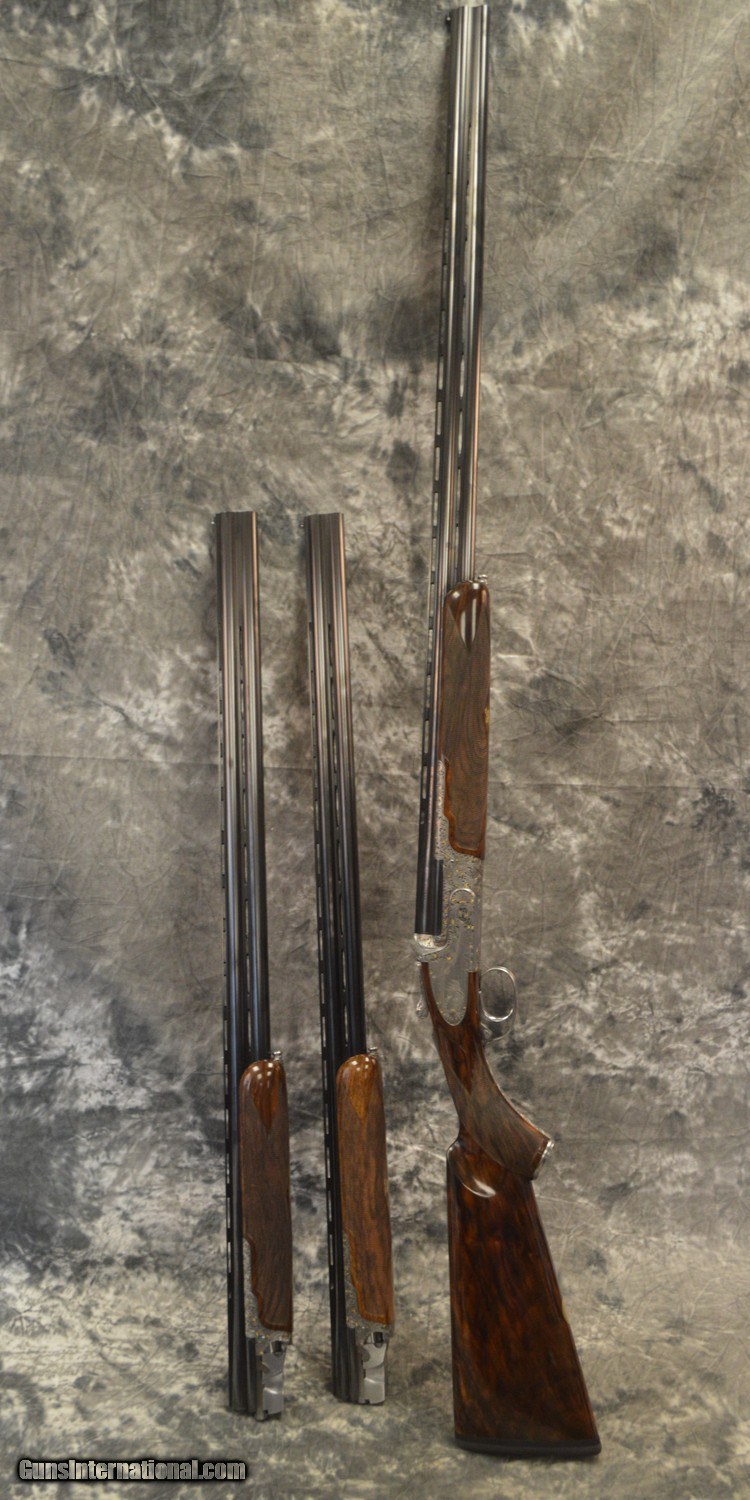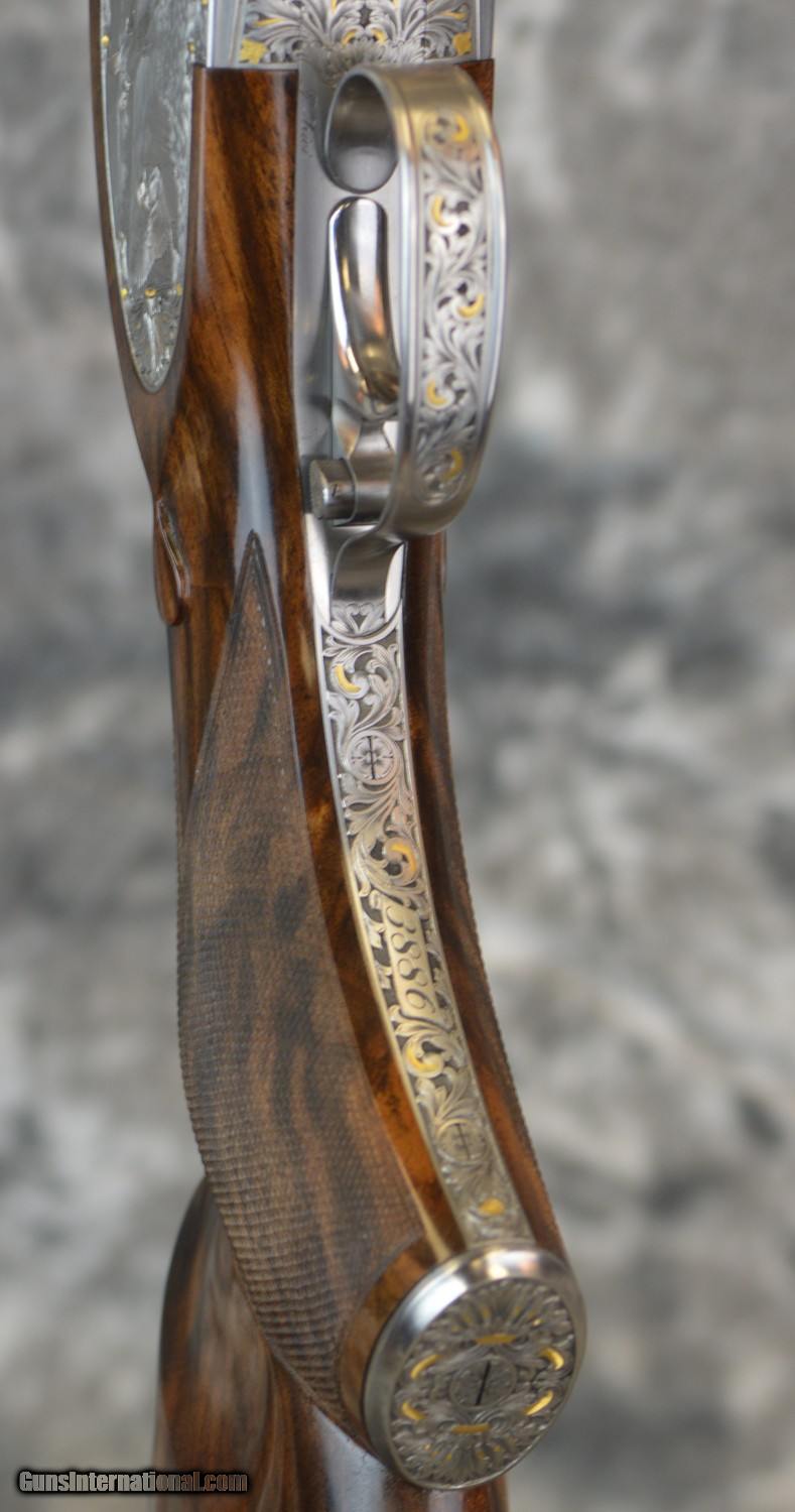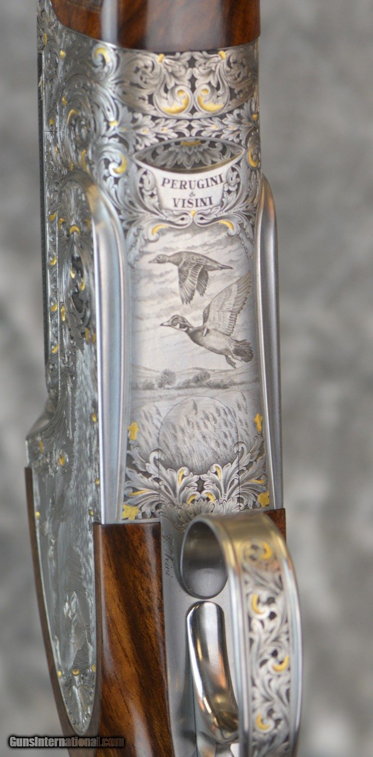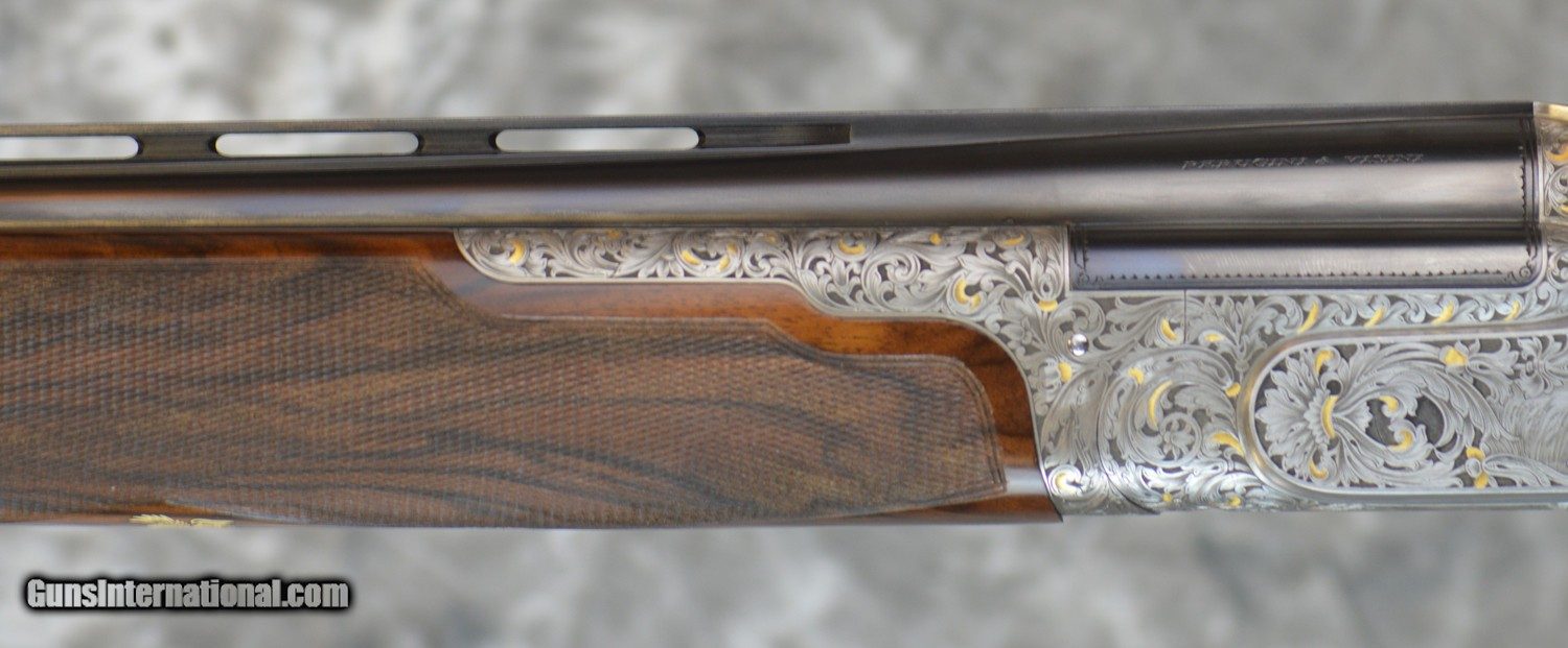 Description: New Perugini & Visini Maestro Extra Gold Sporting Combo 20GA/28GA/.410 Bore with 32" fixed choke (M/IM) barrels, hand filed 7x7 ventilated top ribs, each barrel set includes a fully checkered round forearm with fully engraved and gold inlaid Boss style irons, push button releases. Factory removable, selective coil spring trigger. Coin finished side-plates with highly detailed game scenes in fine Bulino, framed by highly intricate and detailed scrolls inlaid in gold, engraved long tang and fully engraved grip cap. Factory Purdey style pistol grip stock with right-hand palmswell, forearms are round and fully checkered, built on scaled 20GA action. Phenomenal sporting or game gun. Includes leather multi-barrel Motor presentation case. SOLD Shotgun Gauge: 20 Gauge, 28 Gauge, .410 Gauge |