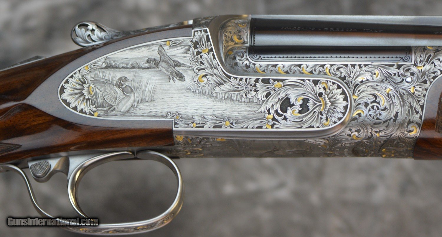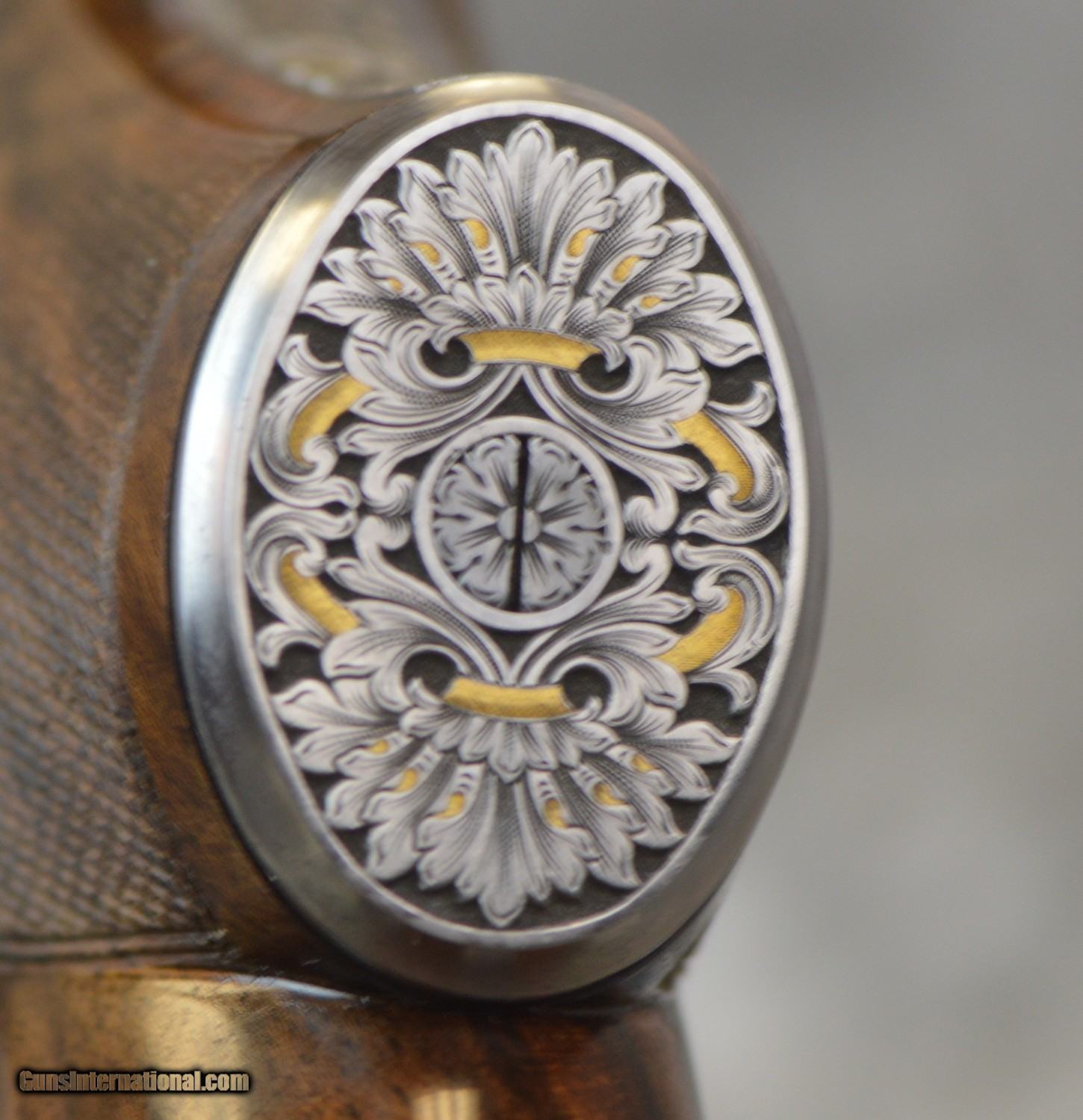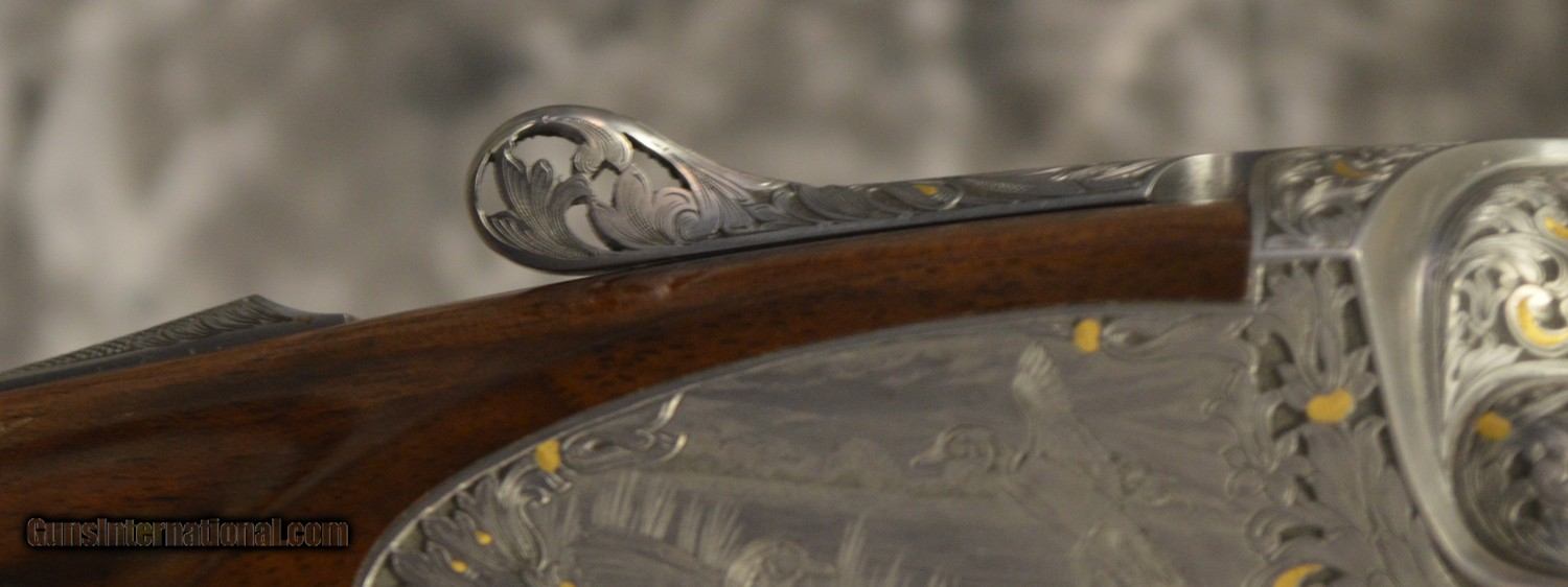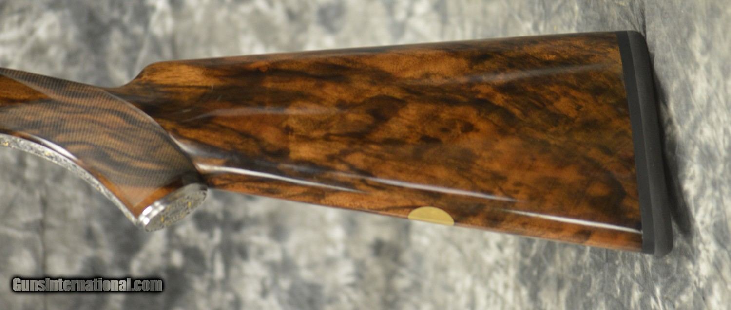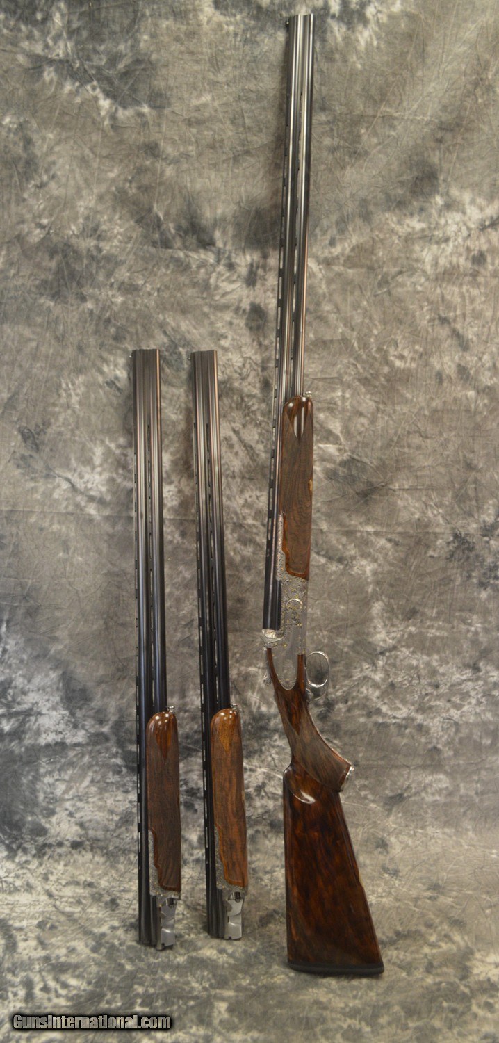 Description: New Perugini & Visini Maestro Extra Gold Sporting Combo 20GA/28GA/.410 Bore with 32" fixed choke (M/IM) barrels, hand filed 7x7 ventilated top ribs, each barrel set includes a fully checkered round forearm with fully engraved and gold inlaid Boss style irons, push button releases. Factory removable, selective coil spring trigger. Coin finished side-plates with highly detailed game scenes in fine Bulino, framed by highly intricate and detailed scrolls inlaid in gold, engraved long tang and fully engraved grip cap. Factory Purdey style pistol grip stock with right-hand palmswell, forearms are round and fully checkered, built on scaled 20GA action. Phenomenal sporting or game gun. Includes leather multi-barrel Motor presentation case. SOLD Shotgun Gauge: 20 Gauge, 28 Gauge, .410 Gauge |