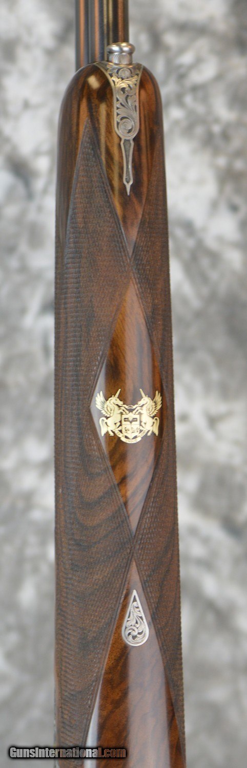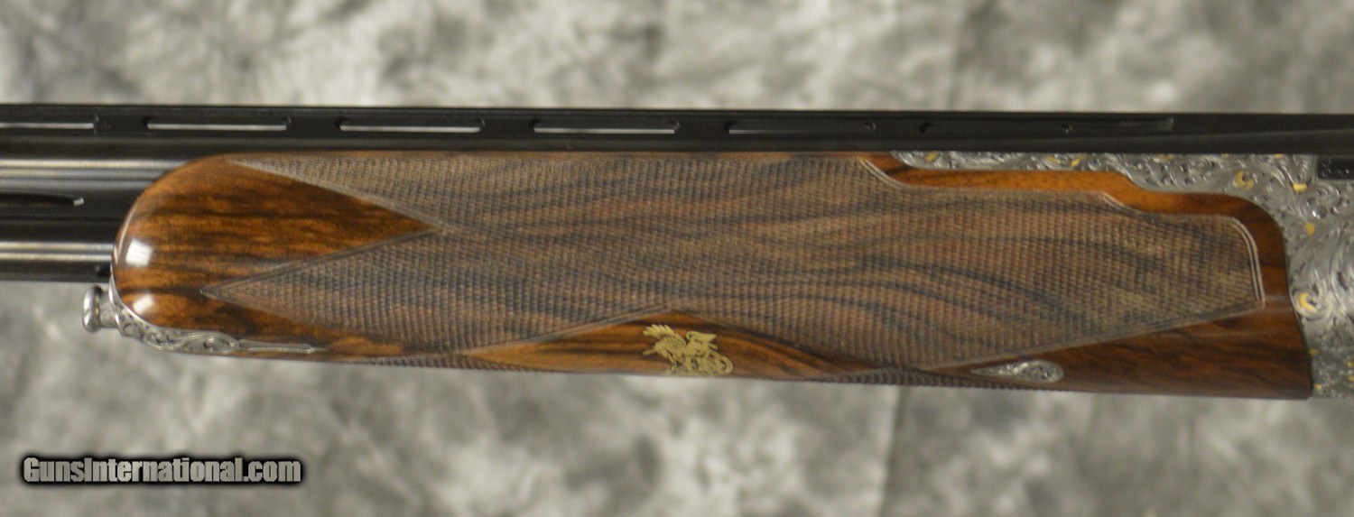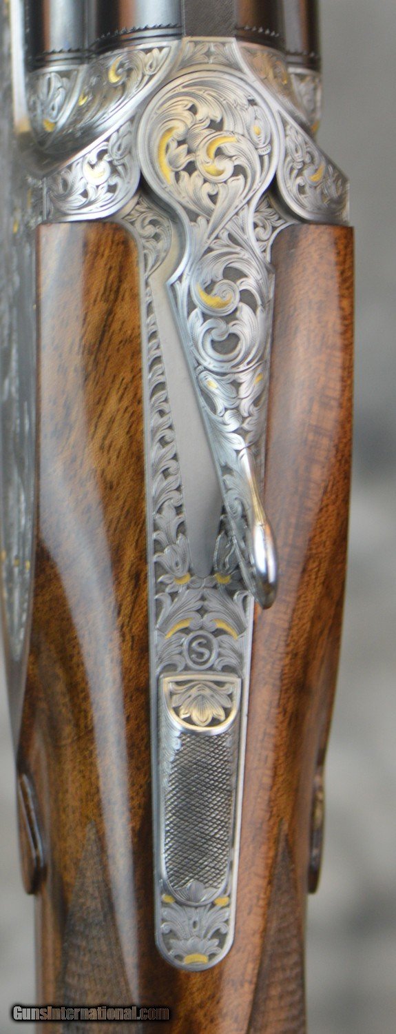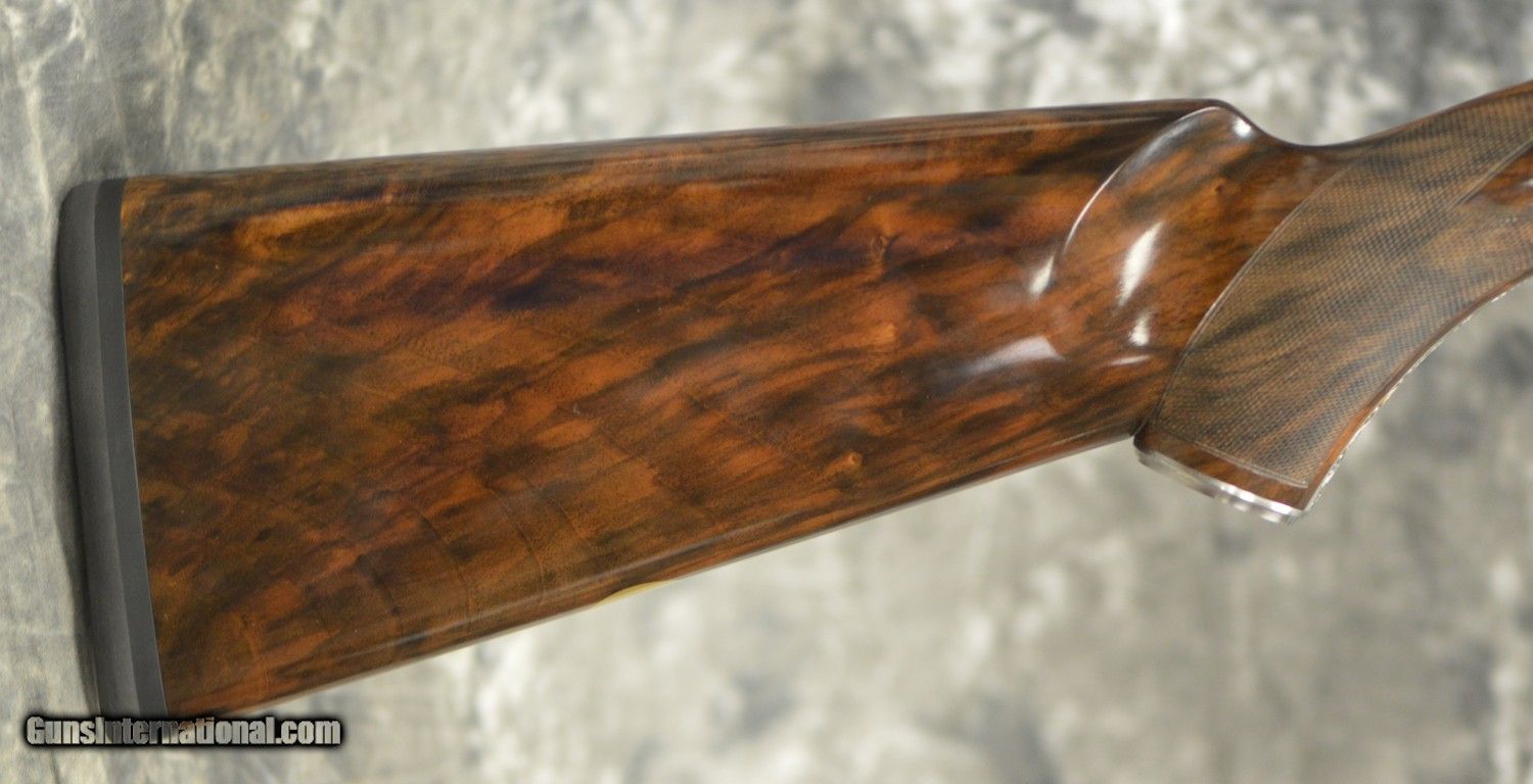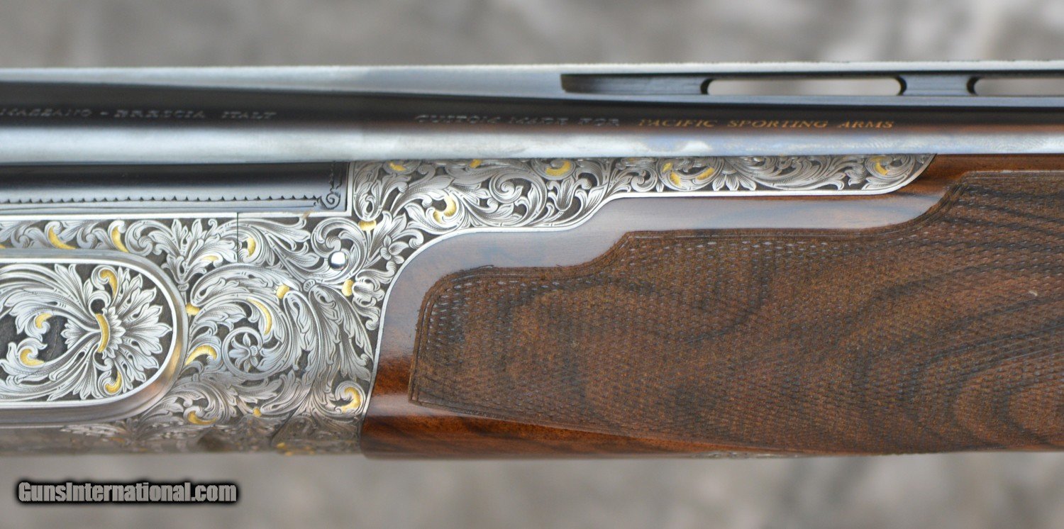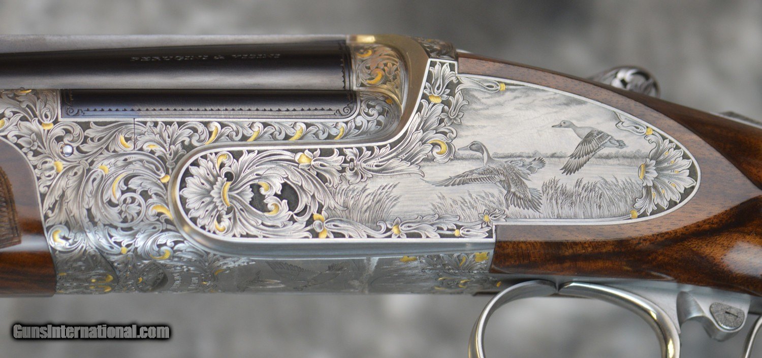 Description: New Perugini & Visini Maestro Extra Gold Sporting Combo 20GA/28GA/.410 Bore with 32" fixed choke (M/IM) barrels, hand filed 7x7 ventilated top ribs, each barrel set includes a fully checkered round forearm with fully engraved and gold inlaid Boss style irons, push button releases. Factory removable, selective coil spring trigger. Coin finished side-plates with highly detailed game scenes in fine Bulino, framed by highly intricate and detailed scrolls inlaid in gold, engraved long tang and fully engraved grip cap. Factory Purdey style pistol grip stock with right-hand palmswell, forearms are round and fully checkered, built on scaled 20GA action. Phenomenal sporting or game gun. Includes leather multi-barrel Motor presentation case. SOLD Shotgun Gauge: 20 Gauge, 28 Gauge, .410 Gauge |