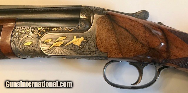 Description: Pre-Owned Perugini & Visini Maestro 12 Gauge Over / Under Shotgun Kennedy Competition Model 30" Barrels w/Briley Removeable Chokes PRICE REDUCED $1500 Description: Beautiful P&V Maestro Model Sporting Shotgun. This 12 Gauge features 2-3/4″ chambers, with 30″ Demi-bloc barrels fitted with a matted, ventilated top andventilated side ribs. Barrels are marked “KENNEDY COMPETITION” and “MADE BY PERUGINI & VISINI ITALY” at left rear. Barrel flats are stamped with 2000 Italian nitro proofs and SN 2634. Low profile, coin finished, O/U action with extensively engraved game scene lockplates with a removable trigger group featuring a non-automatic safety and coin finished single non-selective adjustable trigger. The action is hand engraved with exceptionally well cut, large, open shaded, game scene vignettes featuring semi-relief gold inlaid quail flushing from cover on both sides of the action and bottom. Bottom of action is also inlaid “PERUGINI & VISINI”. The left lockplate depicts a covey of 5 quail flushing away from the viewer and from brush toward an open field. Top of the left side action also features gold inlaid acanthus style scroll. The right side depicts 4 more quail also departing toward an open field, one quail appearing to veer toward the viewer. The bottom of the action and trigger guard continue the quail theme with additional inlaid quail and acanthus style scroll. This beautiful and well done engraving is by “R. Greco” the reknowned Belgian engraver, whose signature appears on left side of trigger group. The stock and fore end features fine exhibition quality, dramatically marbled and nicely flame figured European walnut with a pistol grip buttstock (no palm swell) which measures 14 7/8″ (from approximately the middle trigger position) over a black KICKEEZ pad w/spacer. Note the stock measures approximately 13 7/16" to the end of the walnut stock from the same middle trigger position. This stock can be readily shortened for a shooter needing a bit less length. Point pattern checkering with line borders at the grip. Matching schnabel forend has a Deeley type release. The barrels feature black oxide 1" extended Briley removable choke tubes (xxx and xxx). Other Specifications: DAC:1 1/2″ DAH:1 3/4" LOP: 14 7/8" (from middle trigger position) Approximate Weight: 8 lbs 4 oz. Case: Negrini ABS leather trimmed case (not original to gun) with three combination locks, lined in a blue velvet like material. There are no spares, accessories or tools included in the case. Condition: Excellent, showing light moderate use, with only a hint of sharp edge wear on barrels and other surfaces. Coin finish is excellent and engraving remains sharp. Exhibition walnut stock has a few minor marks in the rubbed oil finish. Fore end shows some handling marks (most likely from use at clays course) and some wear to the oil finish. Bores are bright and appear excellent. Mechanically excellent and action / lockup remains tight. Ejectors work and are in time. Case is excellent, with minimal of marks. SAFETY NOTICE: Buyer is solely responsible for determining that a pre-owned firearms is safe to shoot. The firearms offered has been given a visual inspection for collection purpose only. It is a requirement that any used firearm be inspected by a qualified gunsmith before firing. By purchasing the firearm, the Buyer agrees to hold seller New London Arms Company harmless against damages, injury, or death caused by defective merchandise Payment The listed price is for payment by certified funds, like money orders and certified checks. Most major credit cards are accepted for a 4% processing fee based on the price of the item(s) purchased. North Carolina residents are subject to applicable state sales and local sales taxes. Shipping and Handling New London Arms Company charges a fixed rate on all Shipments. The charge for long guns is $75 each. Insurance may be added at 1.75% of the total purchase price. We do not ship handguns or semi-auto long guns to California, Massachusetts, Maryland or New York state and we may exclude other states without notice. Buyers should know the applicable laws and regulations in their state and city to ensure this item(s) is legal in their area. Other For questions visit New London Arms com We are a Premium firearms dealer and are open to the general public by appointment only. For buyers, this ensures you get a pristine, mint condition firearm that has not been ‘manhandled’. Our inventory is usually shipped in the same box it arrived in. All Firearms are new in box unless otherwise specified. All firearms, magazines, receivers and restricted law enforcement items are sold and shipped in accordance with all existing federal, state and local laws and regulations. Many of the firearms, magazines and parts for sale on this may be restricted or prohibited in your area. Please check your local and state regulations before purchasing. SOLD |