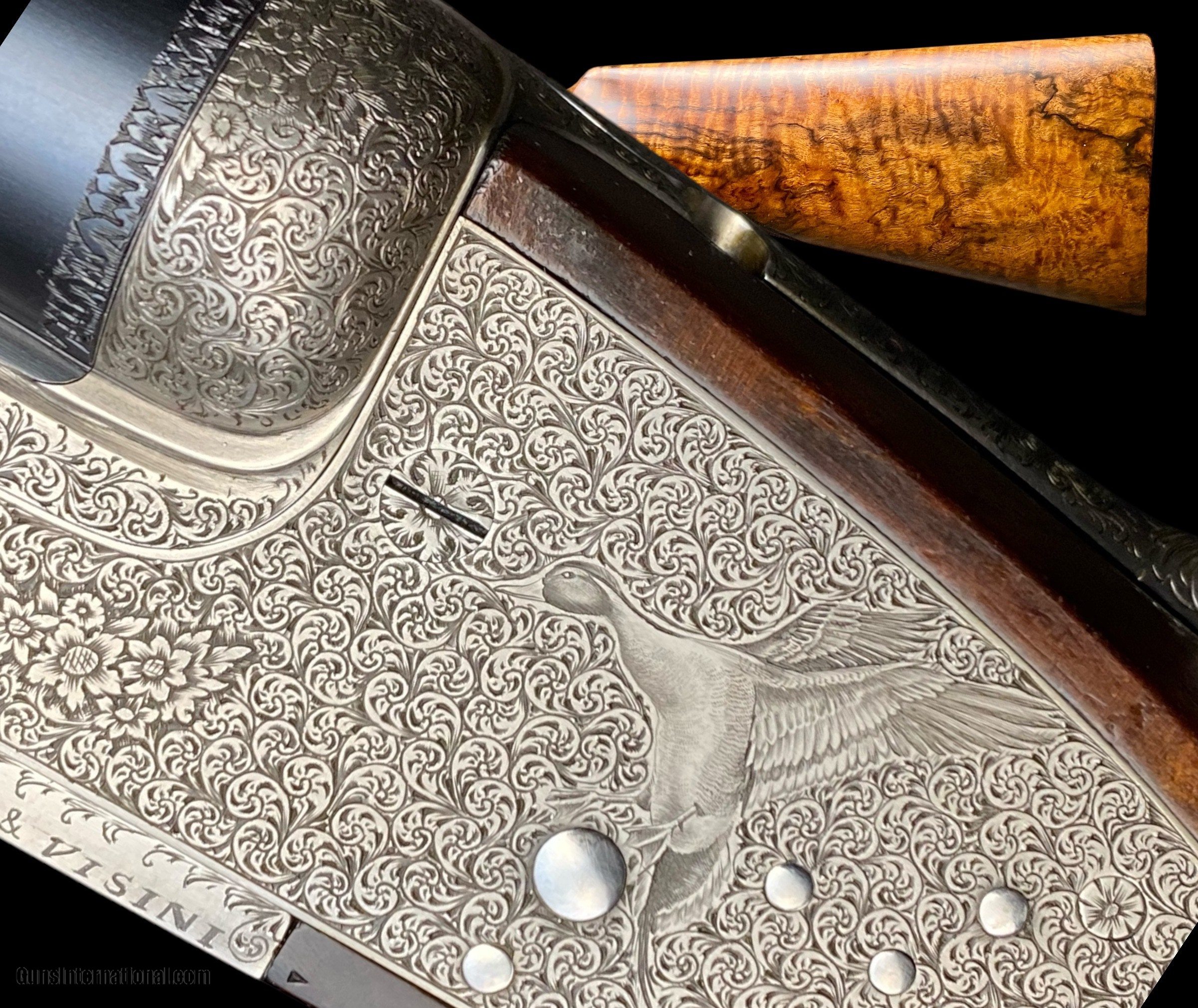 Description: THIS BEAUTIFUL P&V HAS SOLD TO A SATISFIED CLIENT! PLEASE SEE OUR OTHER FINE FIREARM LISTINGS! PERUGIN & VISINI - ITALY MODEL: DELUXE SIDELOCK EJECTOR - MADE 2000 SIDELOCK ACTION EXQUISITELY ENGRAVED BY ITALIAN MASTER ENGRAVER SALVATORE PANTEGHINI 27" - 70MM / 2/34" CHAMBERS BBLS W/ HAND-FILE CUT RIB CHOKES: .016" / .026" SINGLE TRIGGER W/ ROLLED TRIGGER GUARD EJECTORS NON-AUTO SAFETY WITH "S" IN GOLD DELUXE TURKISH WALNUT STRAIGHT GRIP STOCK AND SPLINTER FOREND. CHECKERED BUTT DIMS: LOP: 14 1/2", DAC: 1 1/2", DAH: 2 1/4" WEIGHT: 6LBS 5OZ CONDITION: GUN IS IN EXCELLENT ORIGINAL CONDITION SHOWING LITTLE SIGNS OF USE. BORES CLEARS. EJECTORS STRONG AND IN-TIME. ALL ORIGINAL FINISHED REMAIN IN EXCELLENT ORDER. GENTLEMEN, THIS IS ONE OF THE FINEST P&V SHOTGUNS WE HAVE SEEN. P&V IS CONSIDERED AMONGST THE TOP ITALIAN MAKERS LIKE BERETTA, FABBRI, RIZZINI, AND BOSIS. THE ENGRAVING IS STUNNING AND RARELY SEEN FROM THIS ENGRAVER. YOU WILL BE PLEASED WITH THIS FINE FIREARM. PLEASE CALL NOW! FFL REQUIRED FLAT $50 S/H/I CARD FEE APPLIES SOLD Manufacturer: PERUGINI & VISINI Model: SLE Barrel Length: 27 Chambers: 70MM / 2 3/4 Ejectors: YES Condition: EXC Metal Condition: EXC Wood Condition: EXC Bore Condition: EXC Action: SLE Triggers: SINGLE Proof:Nitro: YES |