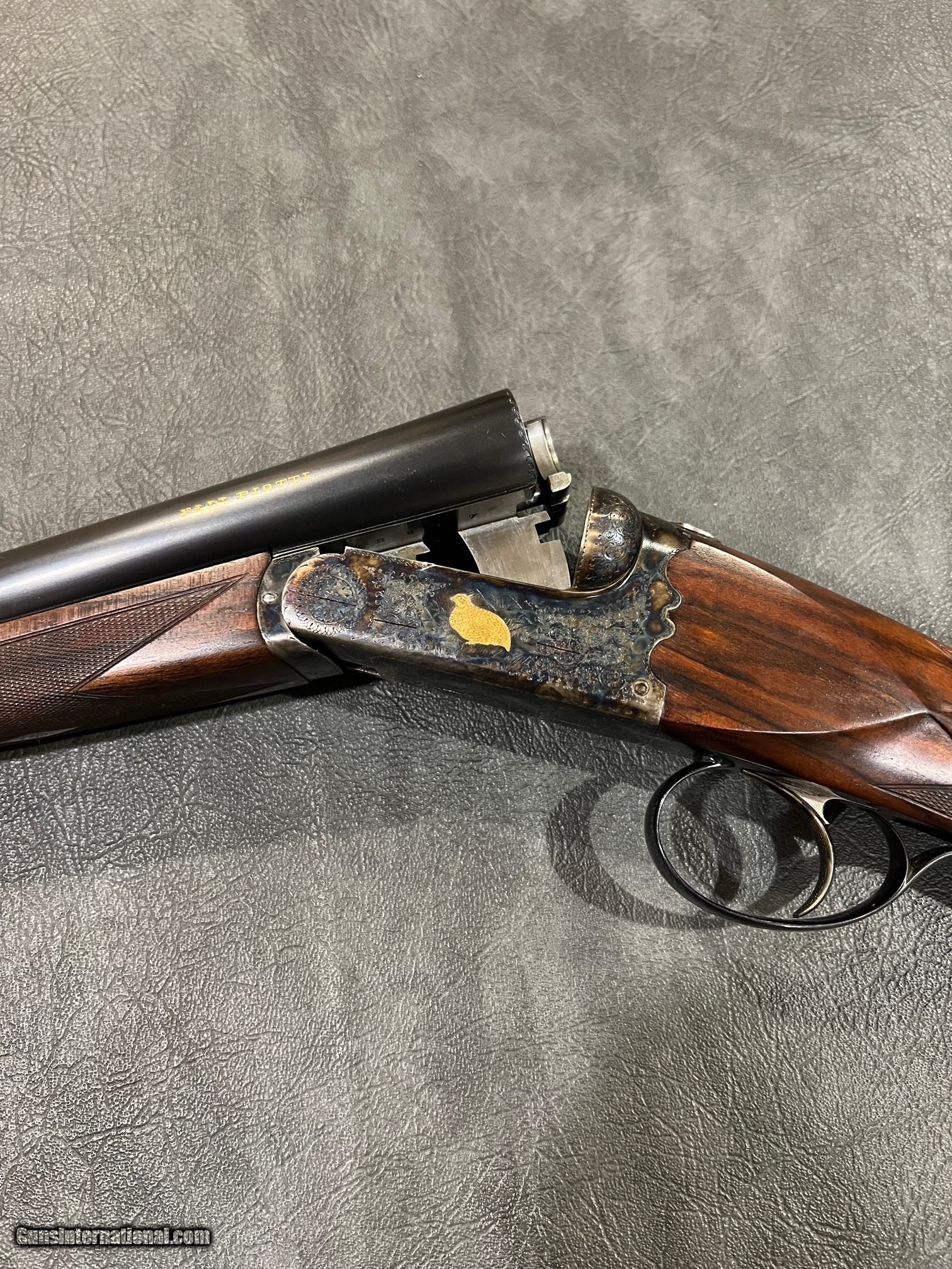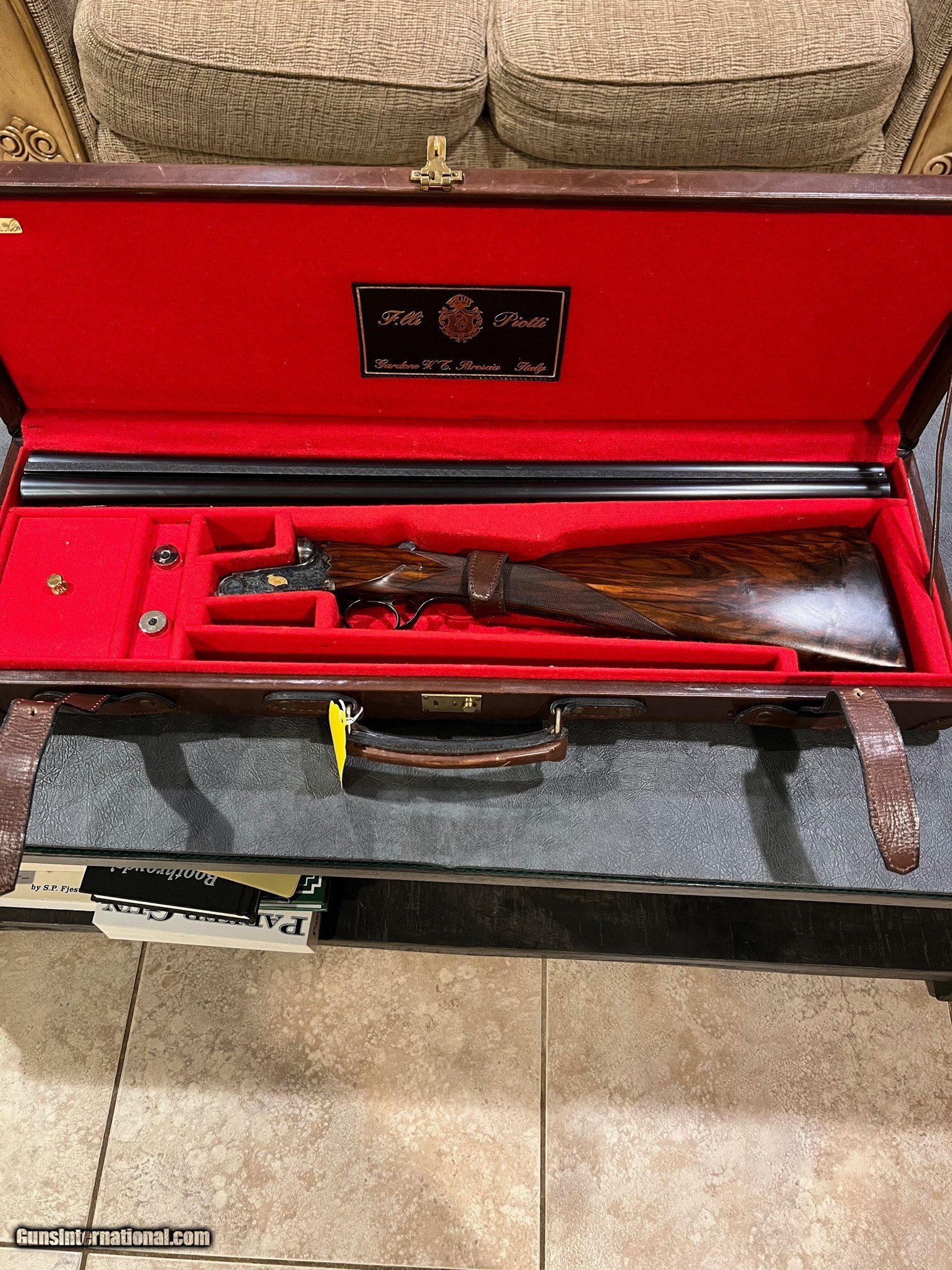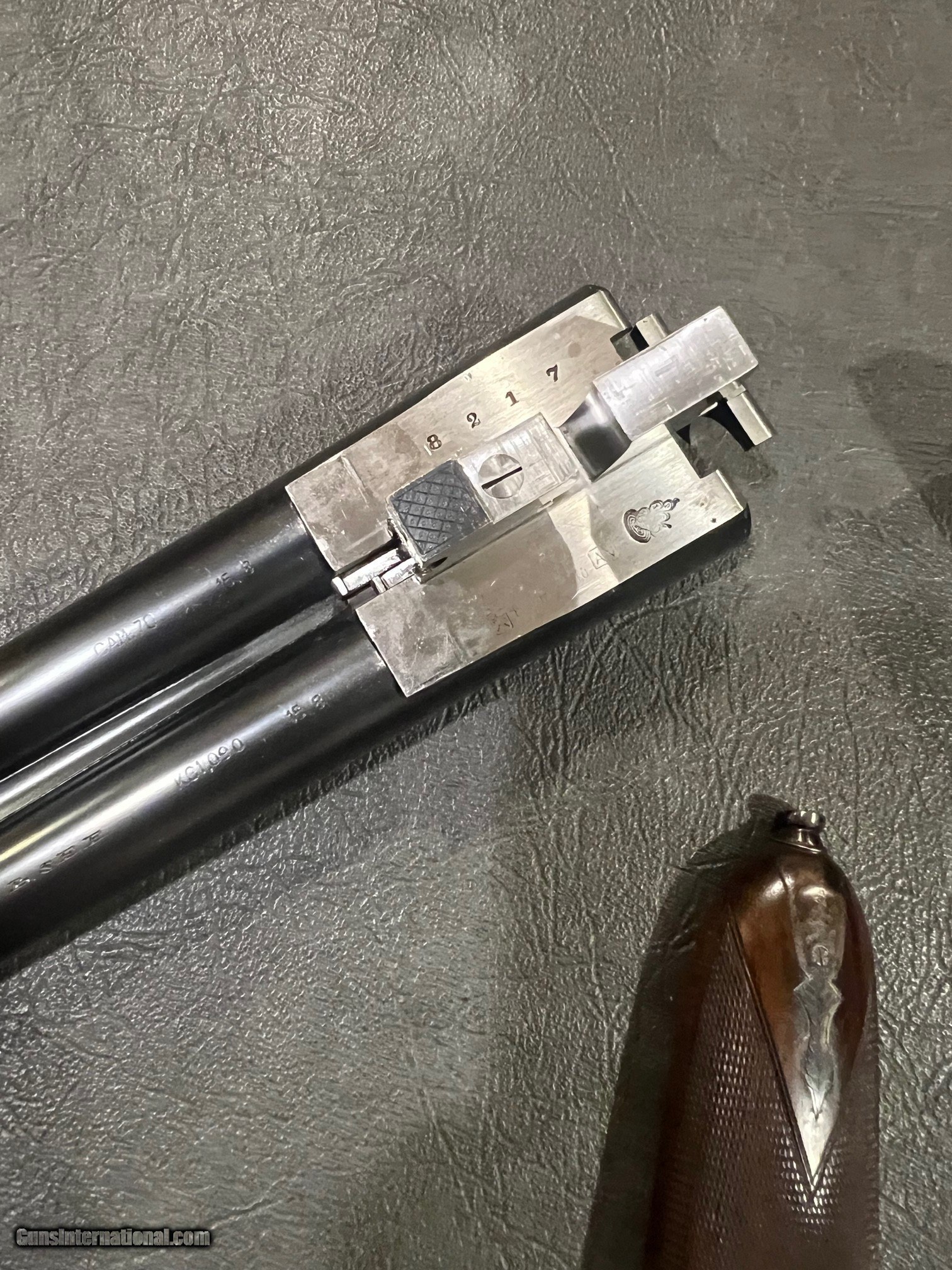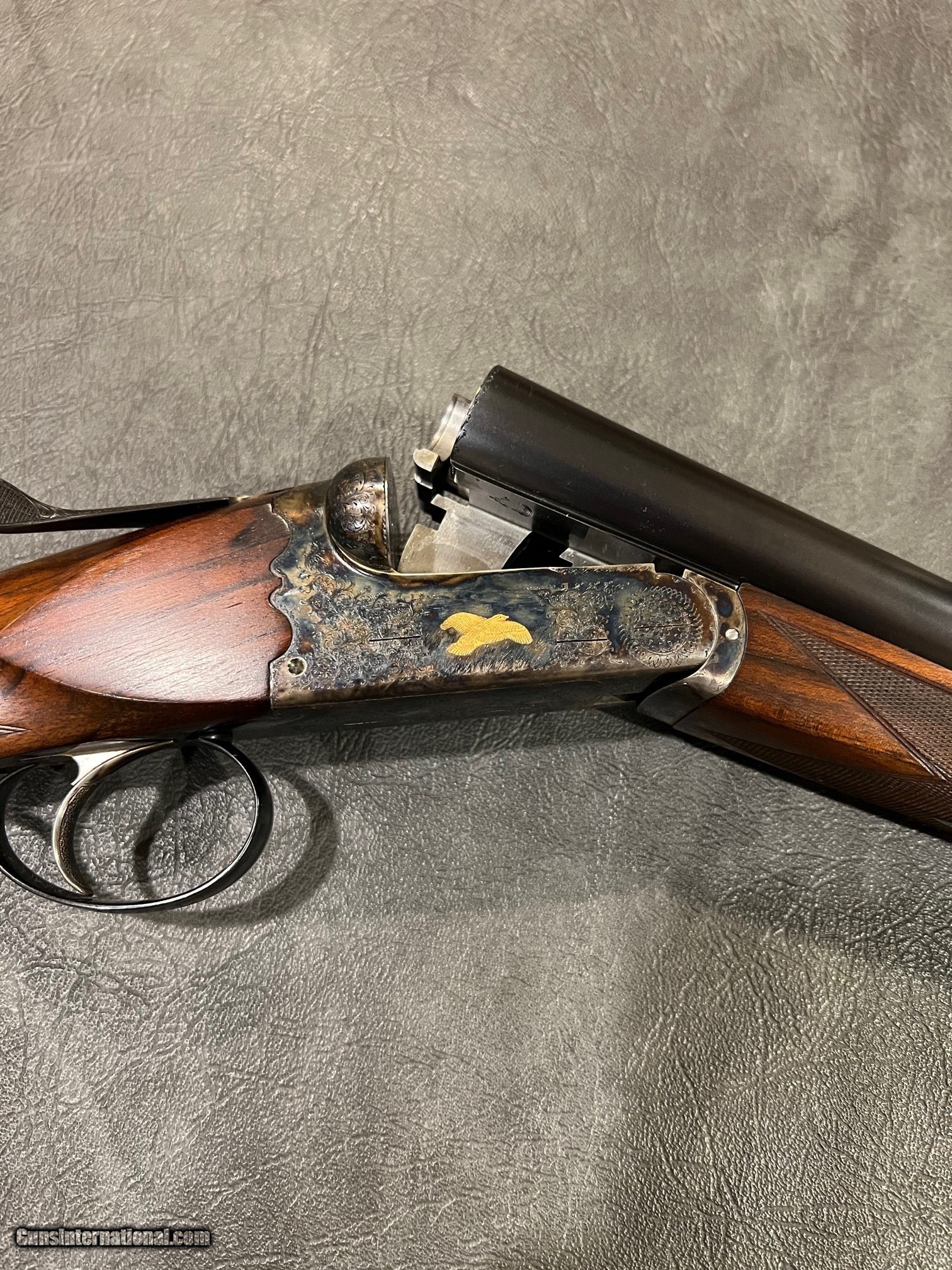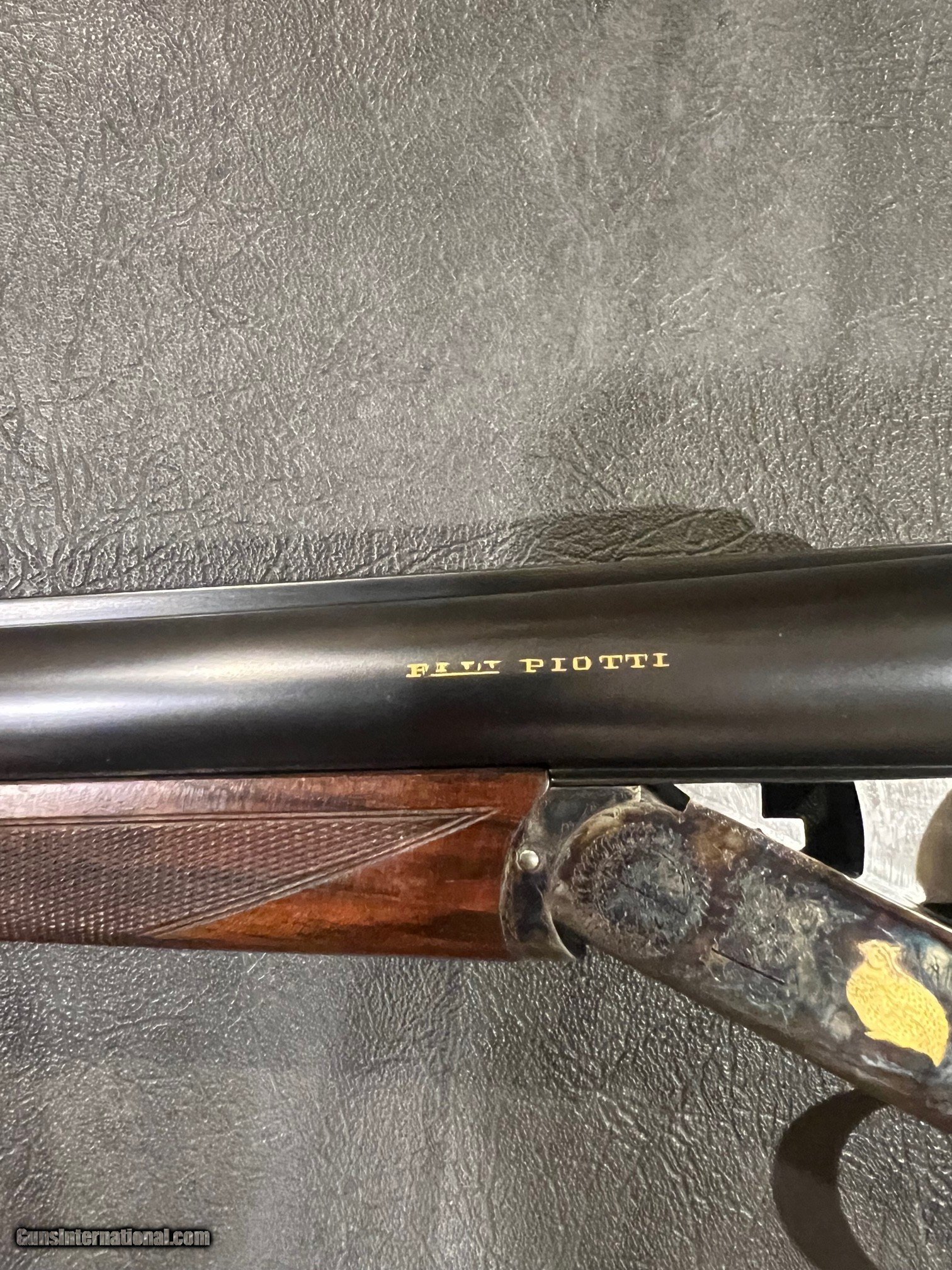 Description: GUN IS CASED IN ORIGINAL PIOTTI CASE PHOTO ADDED.20 Gauge Piotti sxs Puma BSEE Lusso 26" ST Straight Grip, splinter Forearm,File Cut Flat file Rib with case color Receiver with rose and scroll engraving and gold birds(quail and grouse) signed by Grannetti.The dark streaked English stock measures 14 1/4 by 1 1/2 by 2 1/4 with a 1/4 inch cast off has checkered butt gun is absolutely stunning, with a single trigger chokes are .005(IC) and .018(M) weight is 5lbs 10oz has single trigger and chopper lump barells, has very fine checkering, buyer pays actual shipping through my FFL to yours thank you. SOLD Shotgun Gauge: 20 Gauge Manufacturer: Piotti Model: BSEE Lusso Barrel Length: 26 Bore: 20 Chambers: 2 3/4 Ejectors: YES Condition: NEW Metal Condition: NEW Wood Condition: NEW Triggers: SINGLE Stock Comb: 1 1/2 Stock Heel: 2 1/4 Stock Cast: 1/4 cast off Butt Pad: CHECKERED LOP: 14 1/4 Rib: flat file Finish: oil finish Weight: 5lbs 10oz Manufacture Date: 1985 Choke Left: .018 Choke Right: .005 |
