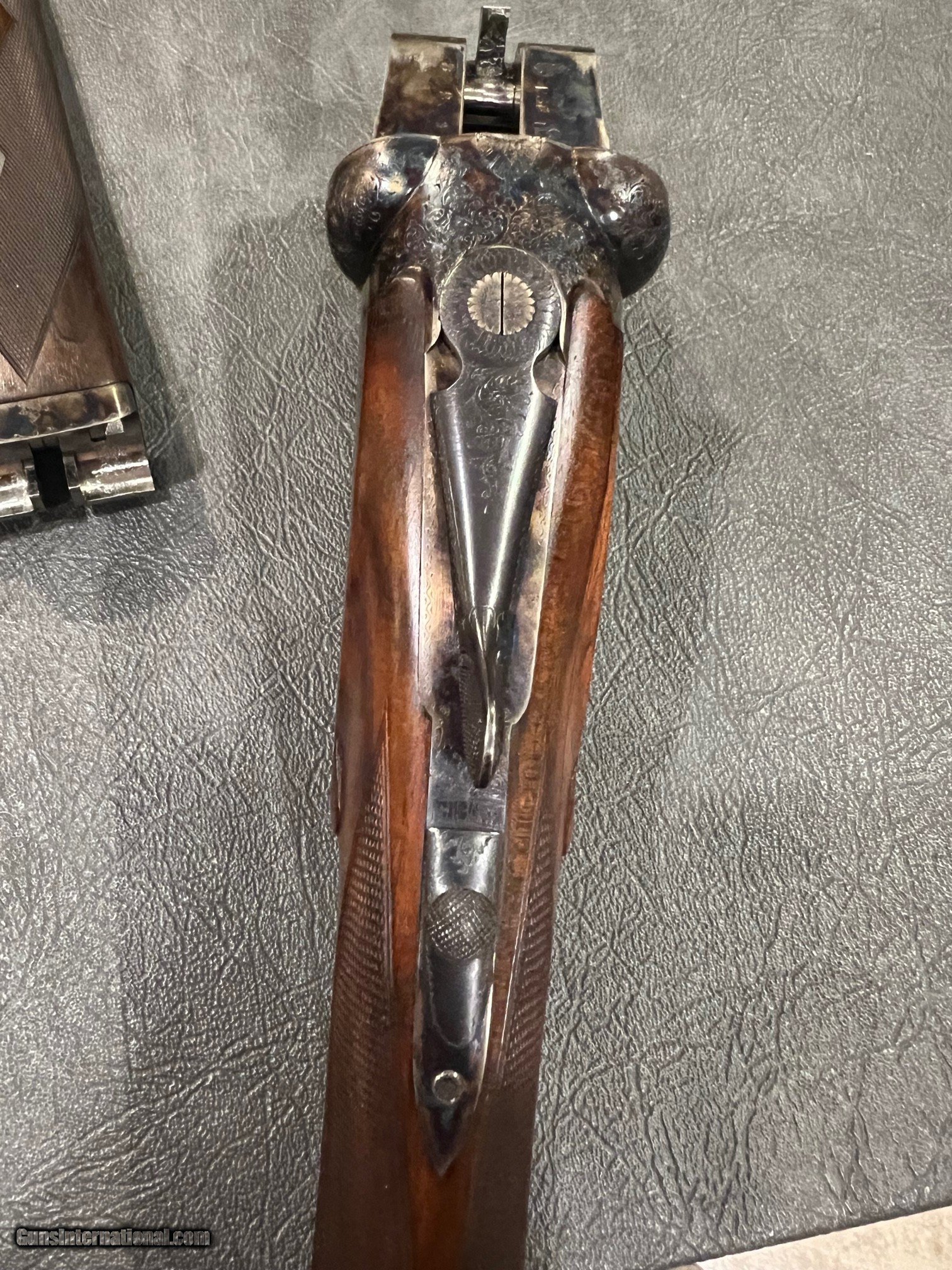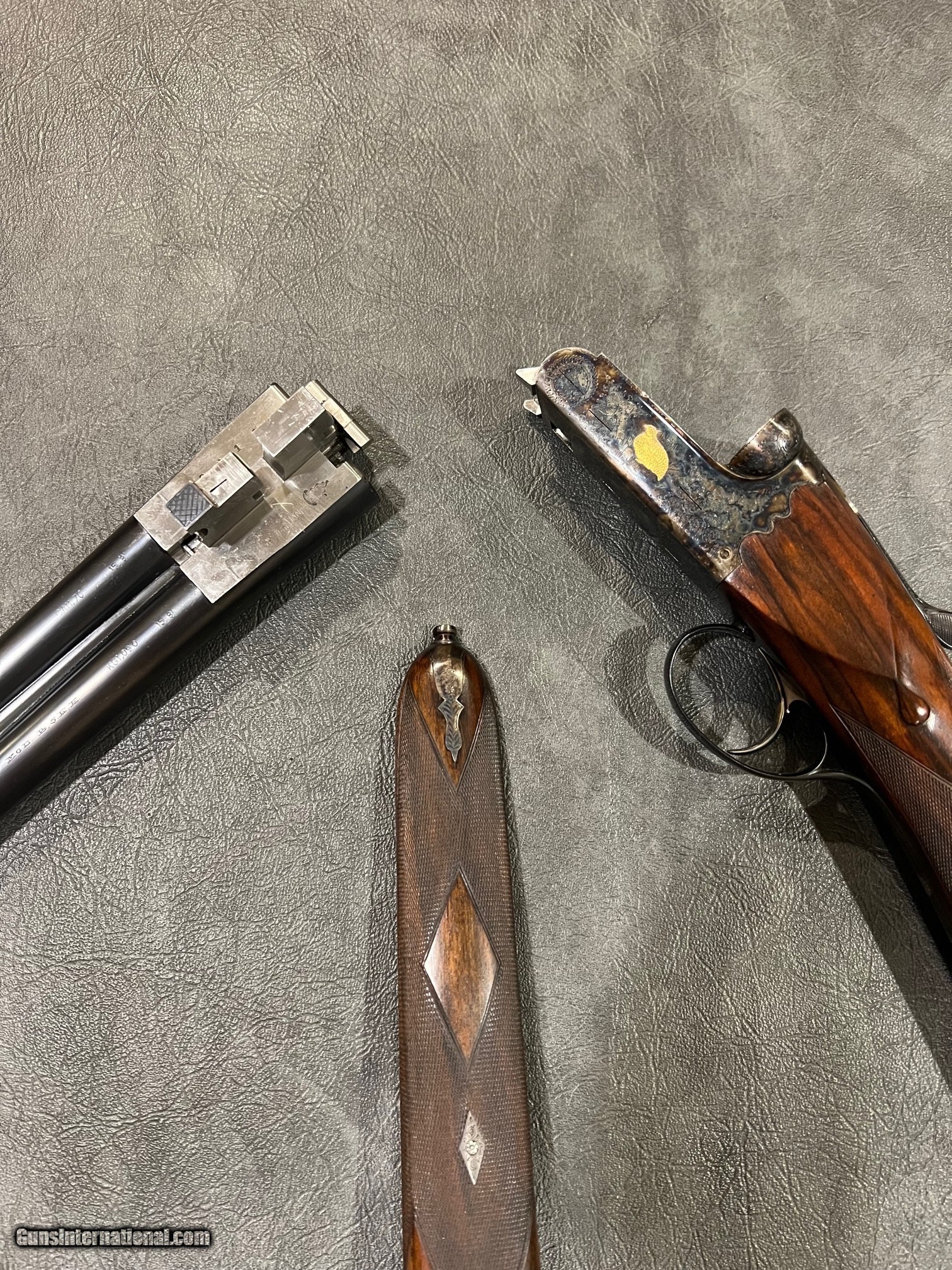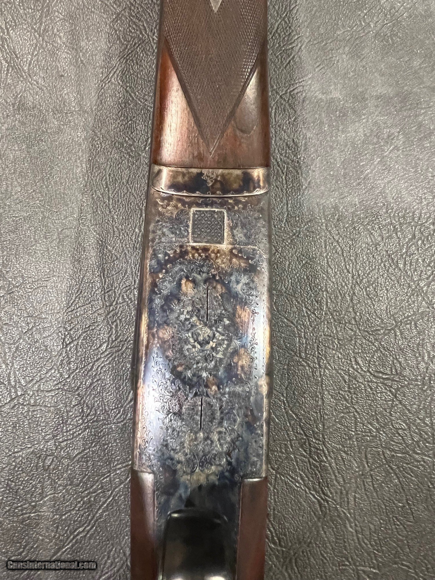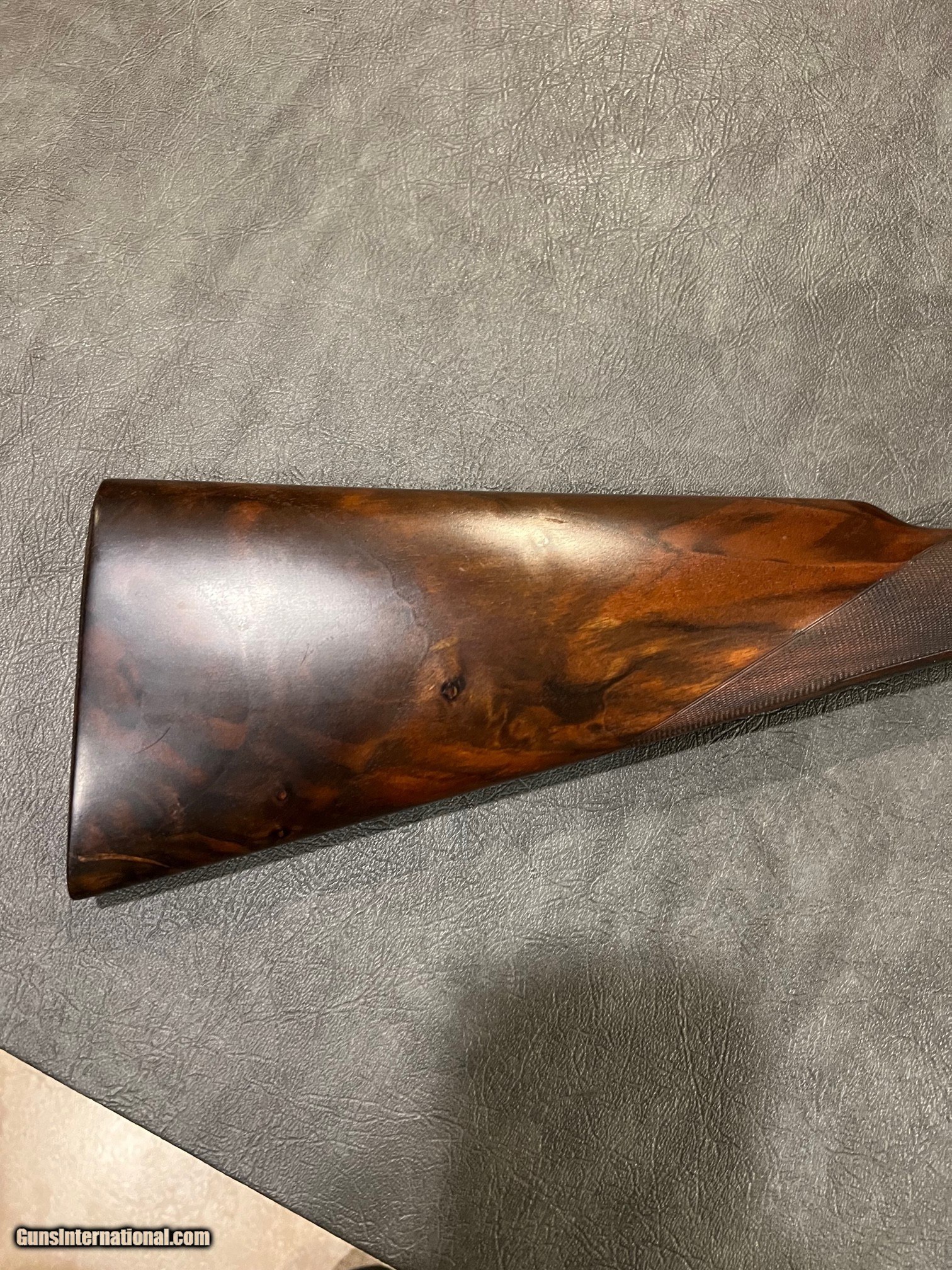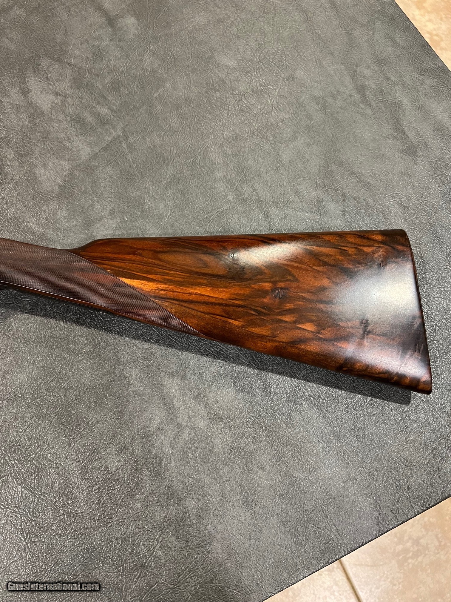 Description: GUN IS CASED IN ORIGINAL PIOTTI CASE PHOTO ADDED.20 Gauge Piotti sxs Puma BSEE Lusso 26" ST Straight Grip, splinter Forearm,File Cut Flat file Rib with case color Receiver with rose and scroll engraving and gold birds(quail and grouse) signed by Grannetti.The dark streaked English stock measures 14 1/4 by 1 1/2 by 2 1/4 with a 1/4 inch cast off has checkered butt gun is absolutely stunning, with a single trigger chokes are .005(IC) and .018(M) weight is 5lbs 10oz has single trigger and chopper lump barells, has very fine checkering, buyer pays actual shipping through my FFL to yours thank you. SOLD Shotgun Gauge: 20 Gauge Manufacturer: Piotti Model: BSEE Lusso Barrel Length: 26 Bore: 20 Chambers: 2 3/4 Ejectors: YES Condition: NEW Metal Condition: NEW Wood Condition: NEW Triggers: SINGLE Stock Comb: 1 1/2 Stock Heel: 2 1/4 Stock Cast: 1/4 cast off Butt Pad: CHECKERED LOP: 14 1/4 Rib: flat file Finish: oil finish Weight: 5lbs 10oz Manufacture Date: 1985 Choke Left: .018 Choke Right: .005 |