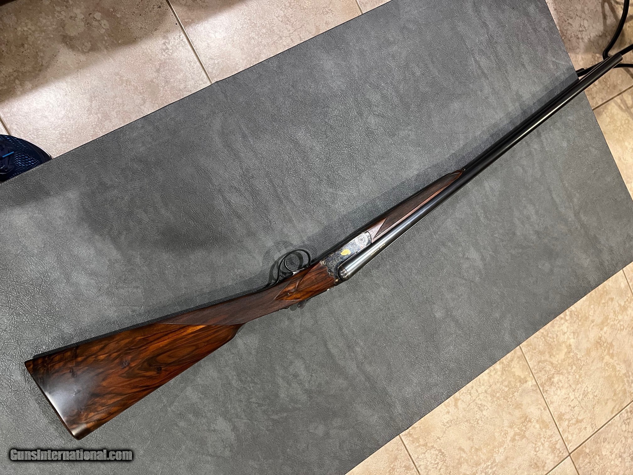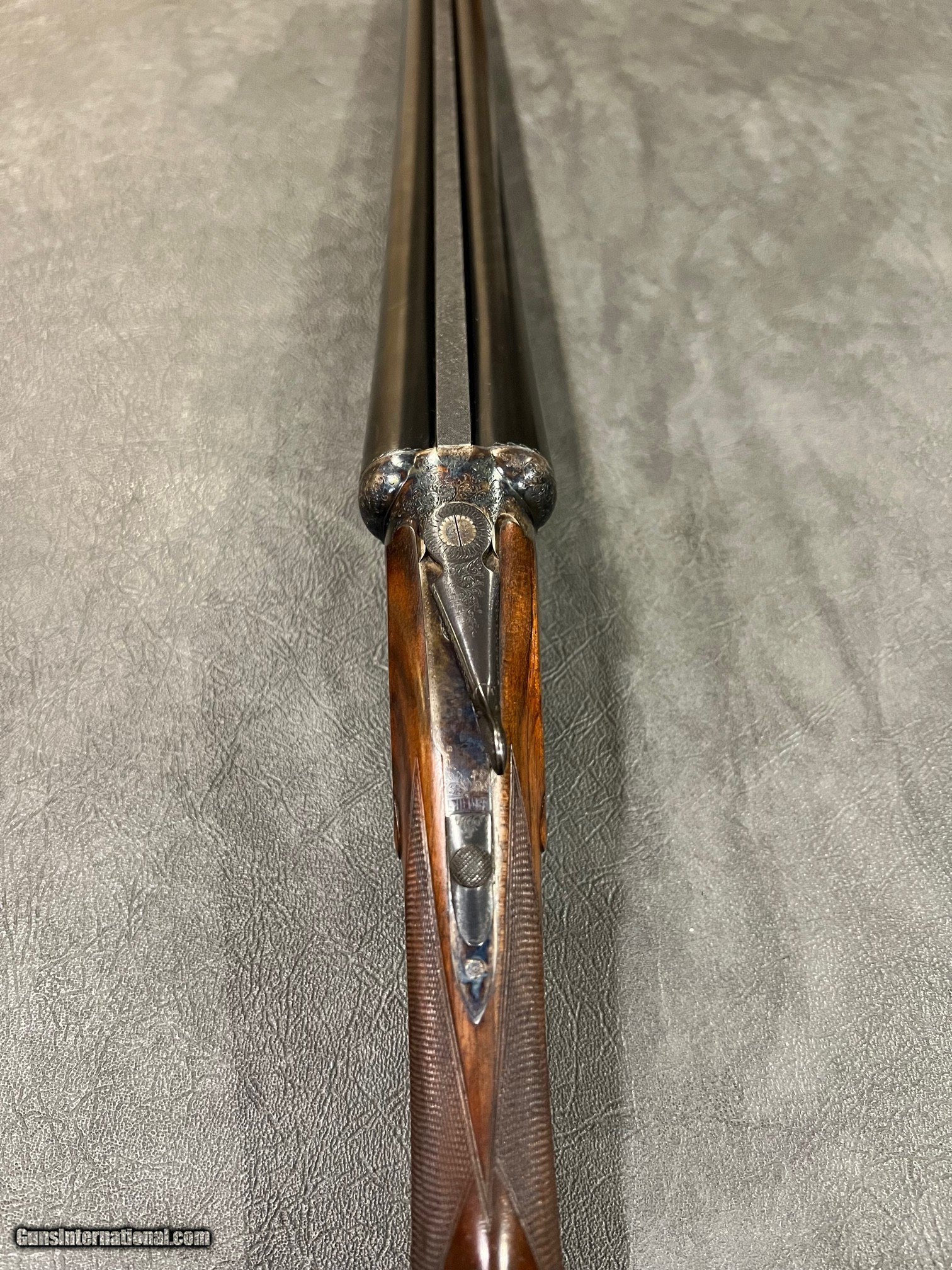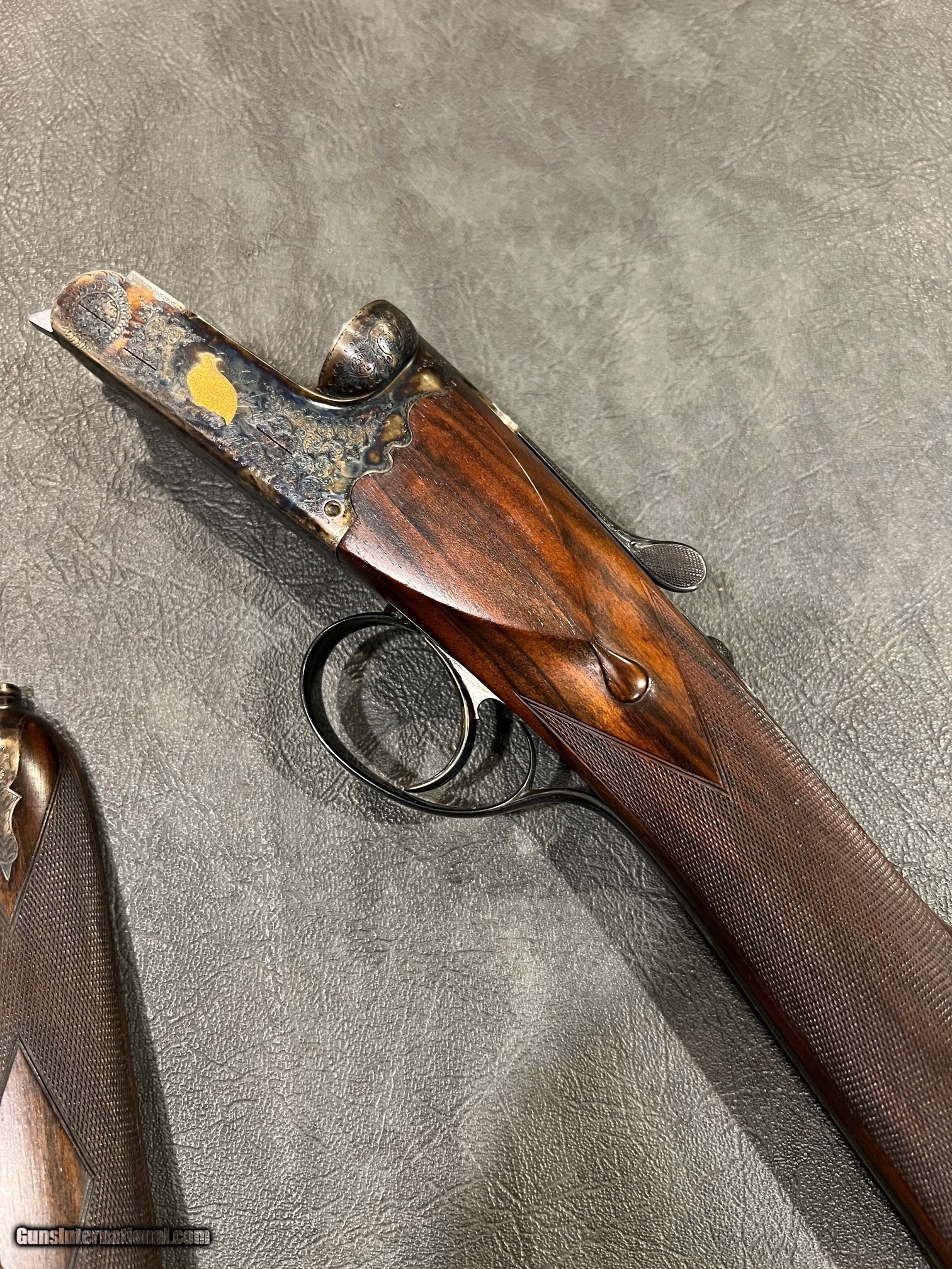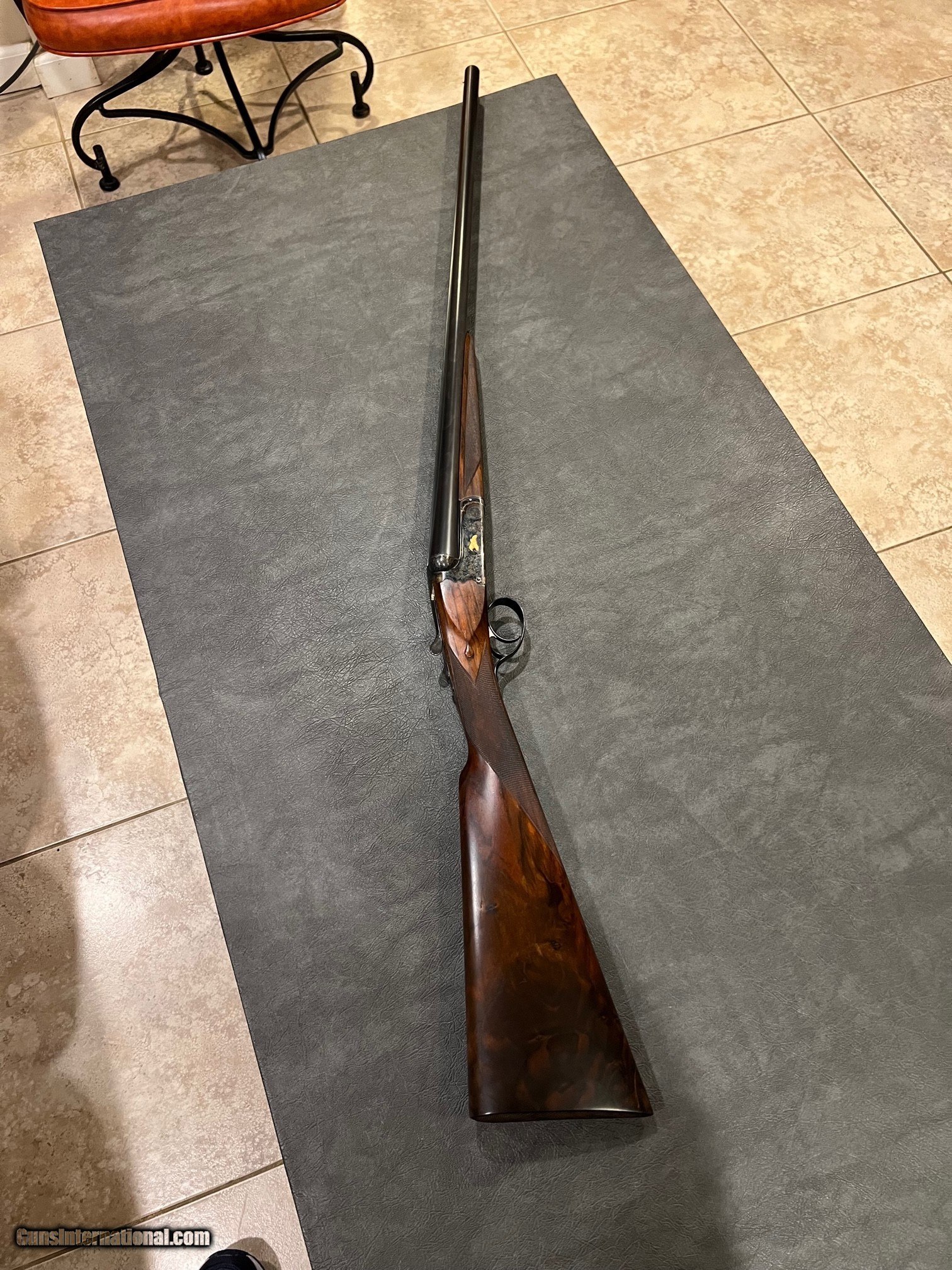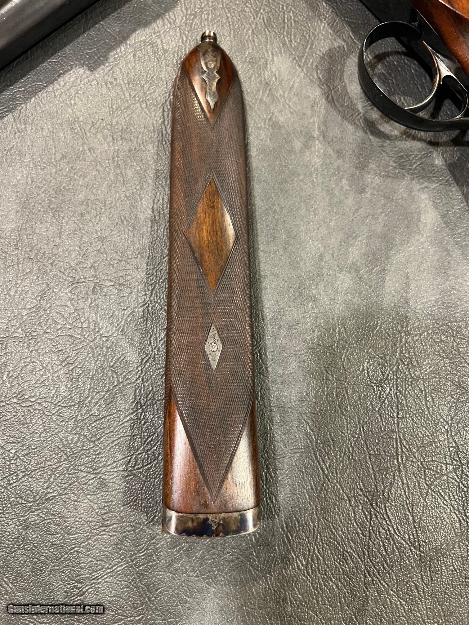 Description: GUN IS CASED IN ORIGINAL PIOTTI CASE PHOTO ADDED.20 Gauge Piotti sxs Puma BSEE Lusso 26" ST Straight Grip, splinter Forearm,File Cut Flat file Rib with case color Receiver with rose and scroll engraving and gold birds(quail and grouse) signed by Grannetti.The dark streaked English stock measures 14 1/4 by 1 1/2 by 2 1/4 with a 1/4 inch cast off has checkered butt gun is absolutely stunning, with a single trigger chokes are .005(IC) and .018(M) weight is 5lbs 10oz has single trigger and chopper lump barells, has very fine checkering, buyer pays actual shipping through my FFL to yours thank you. SOLD Shotgun Gauge: 20 Gauge Manufacturer: Piotti Model: BSEE Lusso Barrel Length: 26 Bore: 20 Chambers: 2 3/4 Ejectors: YES Condition: NEW Metal Condition: NEW Wood Condition: NEW Triggers: SINGLE Stock Comb: 1 1/2 Stock Heel: 2 1/4 Stock Cast: 1/4 cast off Butt Pad: CHECKERED LOP: 14 1/4 Rib: flat file Finish: oil finish Weight: 5lbs 10oz Manufacture Date: 1985 Choke Left: .018 Choke Right: .005 |