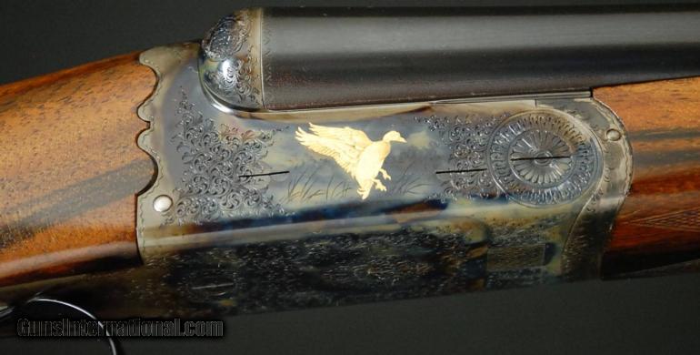 Flli Piotti - Piuma, 20ga., 28” barrels, IC/M choked, wonderfully figured straight grip stock, checkered butt, slender Beavertail forearm, color case hardened receiver featuring miniature scroll and rosette engraving with gold inlaid game scenes by Ferraglio, automatic ejectors, double triggers, file cut rib, chopper lump barrels, a spectacular gun manufactured by one of Italy’s finest gunmakers, in as-new and excellent condition throughout.