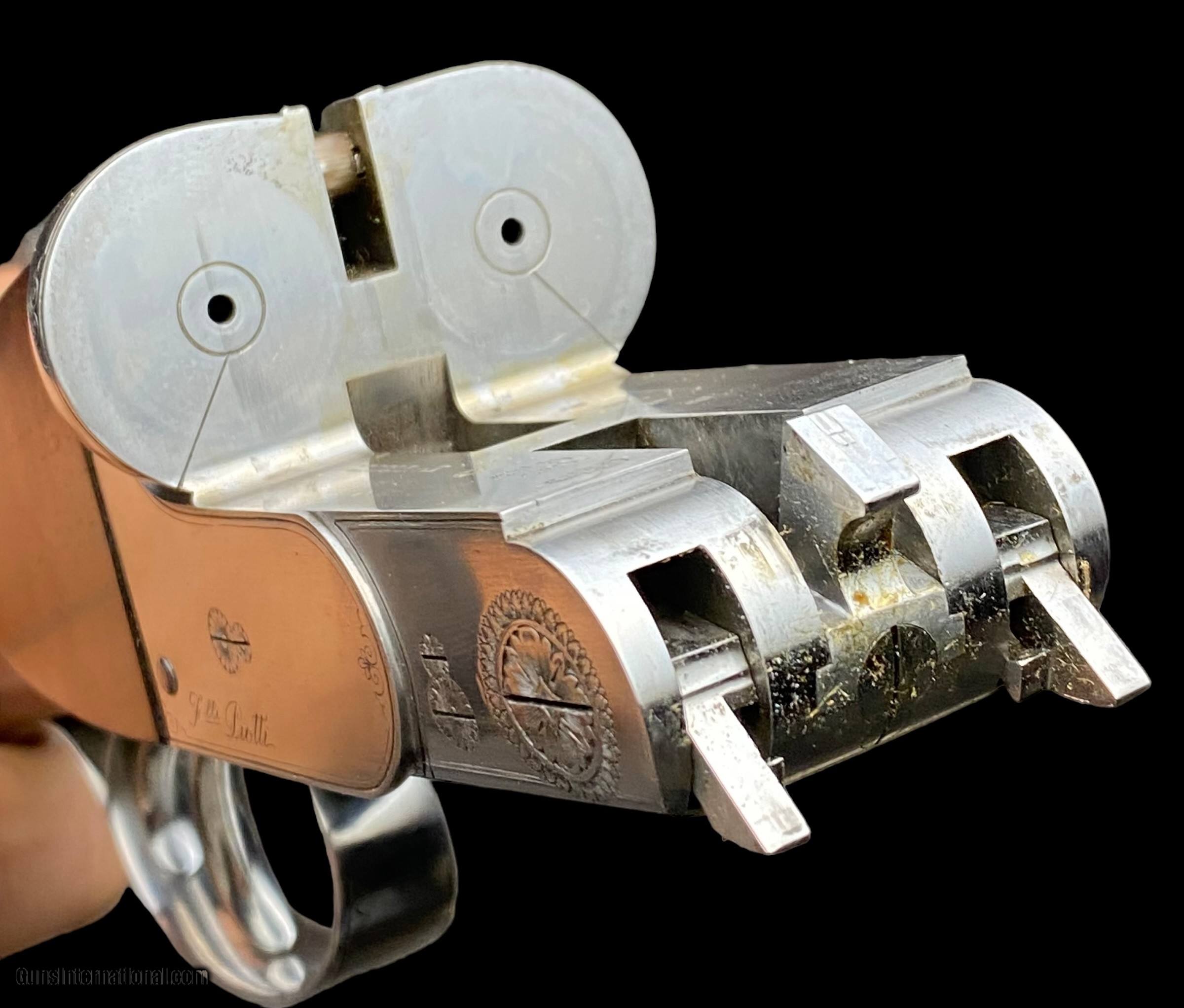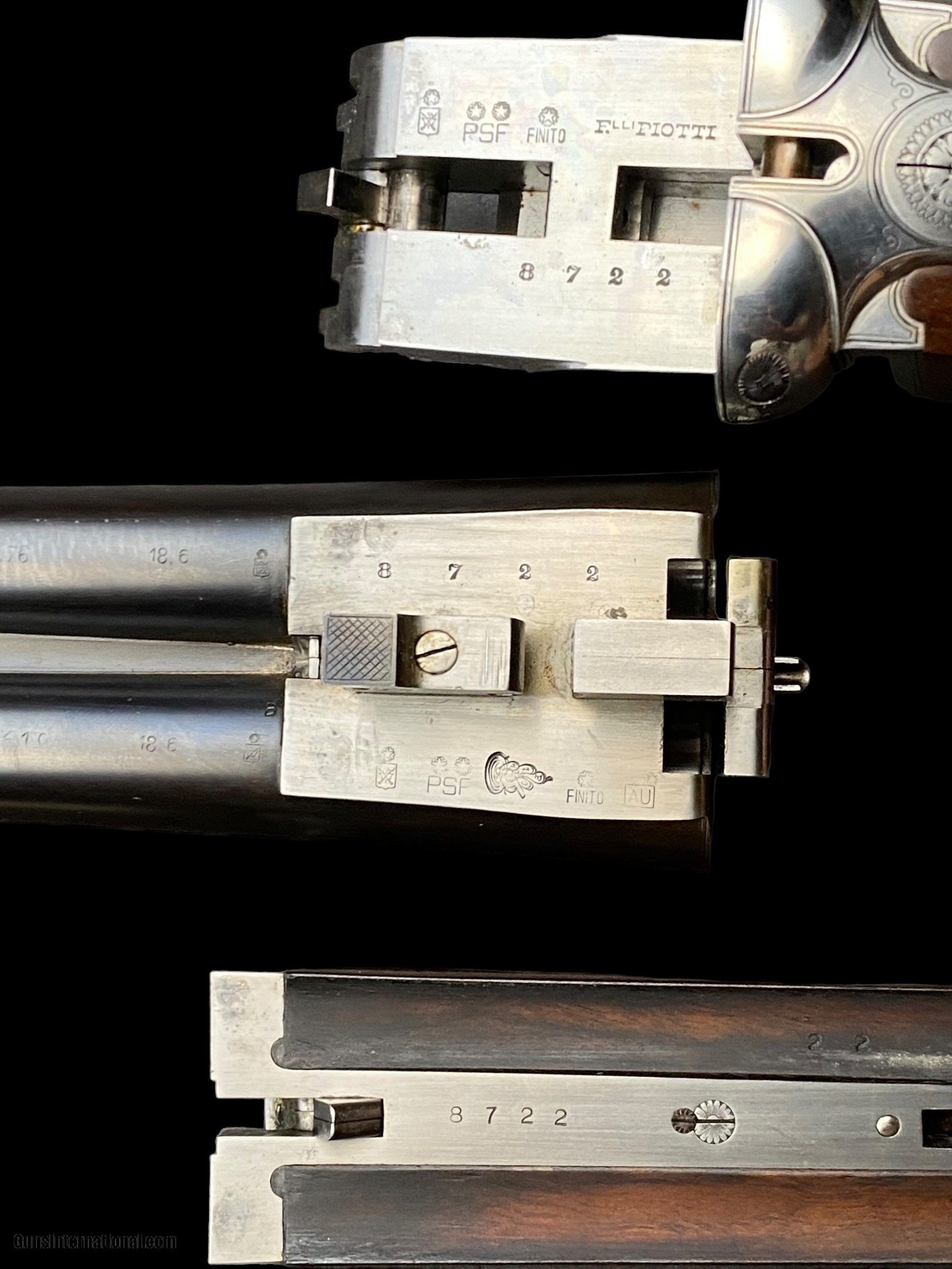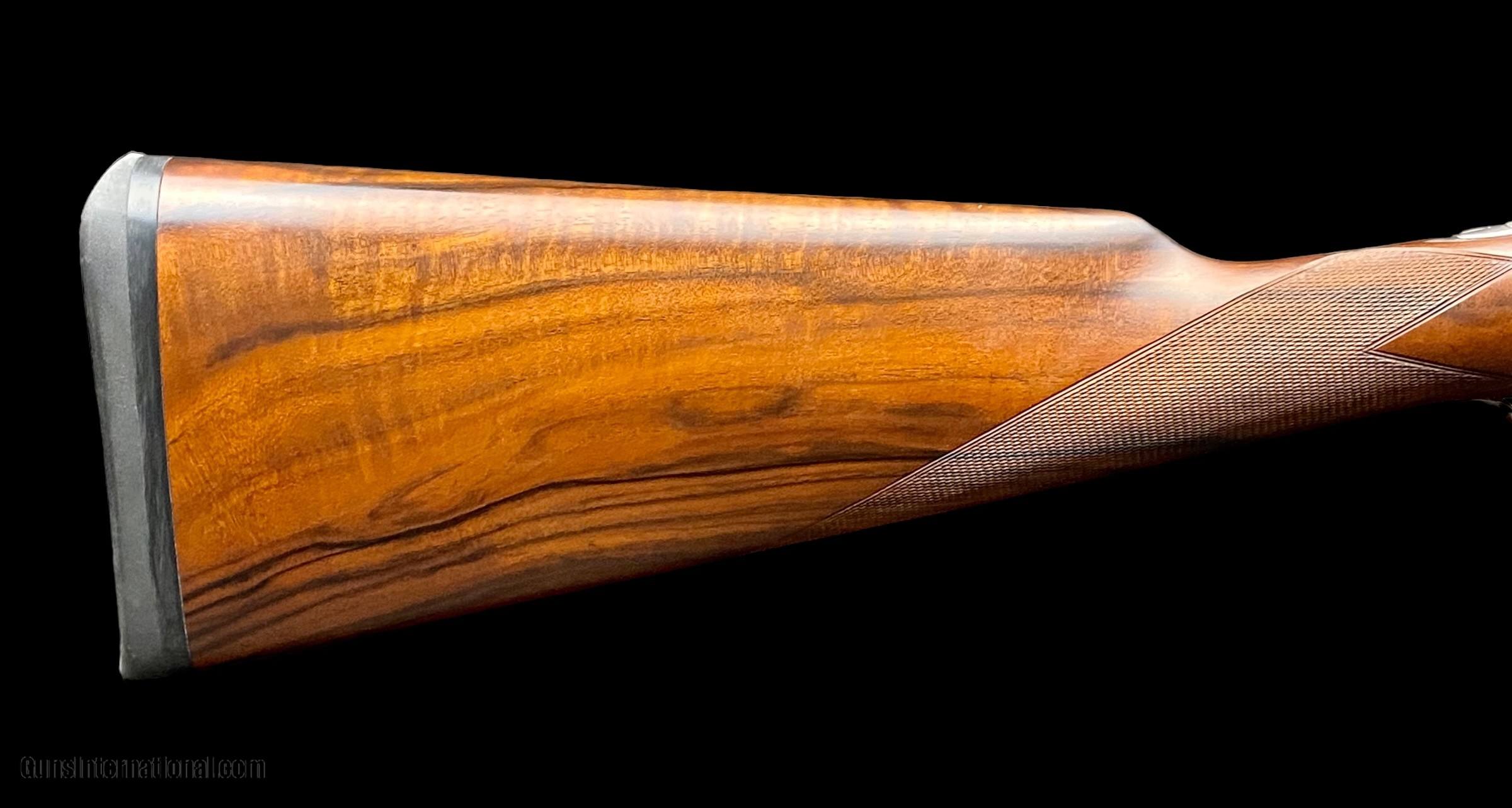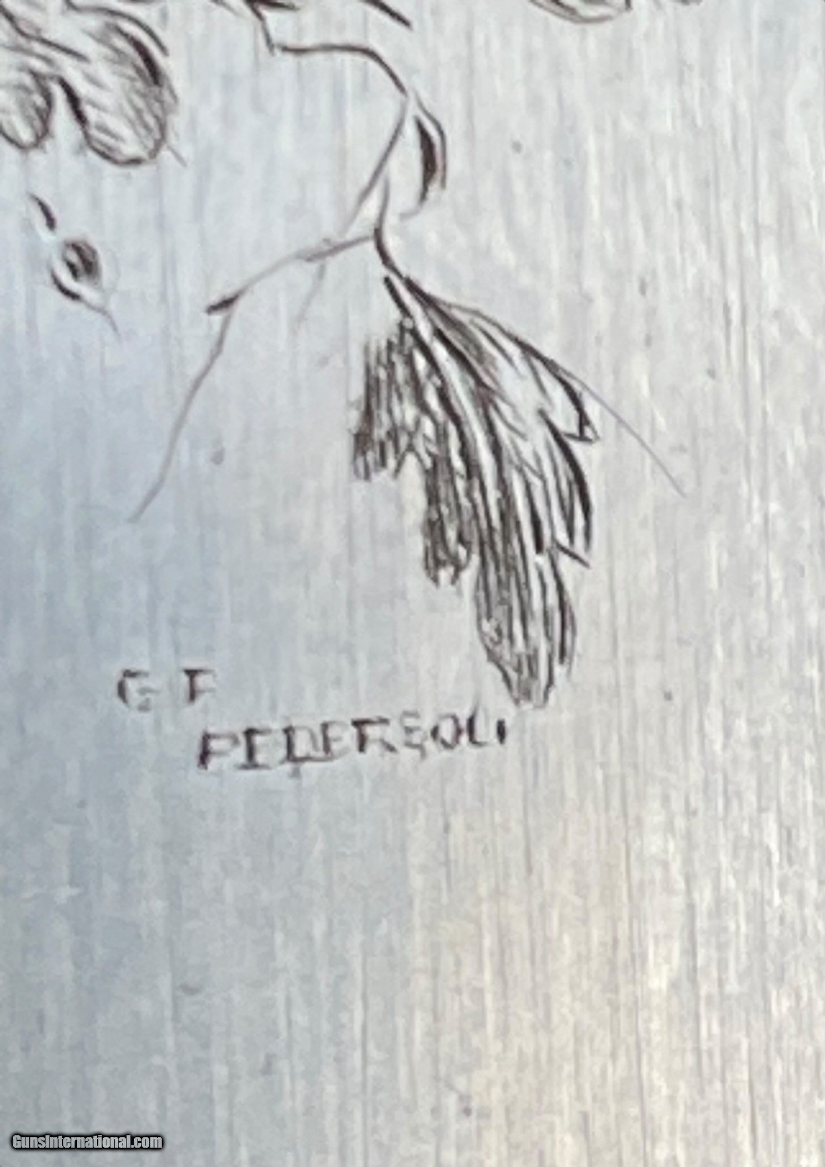 Description: FLLI. PIOTTI - ITALY - 1989 MFG GIANFRANCO PEDERSOLI ENGRAVED - WOODCOCK IN FLIGHT BOXLOCK DOUBLE UNDERBITE AND CROSSBOLT ACTION BRIGHT COIN FINISH EJECTORS DOUBLE TRIGGERS NON AUTOMATIC SAFETY WITH GOLD "S" 27.5" BBLS W/ HAND-FILED RIB CHOKES: .022 / .034 BEAUTIFUL STRATIGHT GRAINED WALNUT ENGLISH STOCK AND SPLINTER FOREND W/ DOUBLE MULLERED POINT CHECKERING DIMS: 14 5/8" LOP, 1 3/8" DAC, 2 1/8" DAH OVER 1/2" RUBBER PAD WEIGHT: 7LBS 1OZ CONDITION: GUN IS IN EXCELLENT OVERALL ORIGINAL CONDITION SHOWING LITTLE SIGNS OF USE. BORES CLEAR AND BRIGHT. EJECTORS STRONG AND IN-TIME. ALL WOOD FINISH REMAINS. GENTLEMEN, THIS IS A FINE PIOTTI GAME GUN AND WITH ENGRAVING BY THE REVERED GIANFRANCO PEDERSOLI. A BEAUTIFUL GUN! PLEASE CALL NOW! FFL REQUIRED FLAT $50 S/H/I CARD FEE APPLIES SOLD Manufacturer: PIOTTI Model: BLE Serial Number: 8722 Barrel Length: 27.5 Chambers: 2.75 - 70MM Ejectors: YES Condition: EXC Metal Condition: EXC Wood Condition: EXC Bore Condition: EXC Action: BOXLOCK Triggers: DOUBLE |