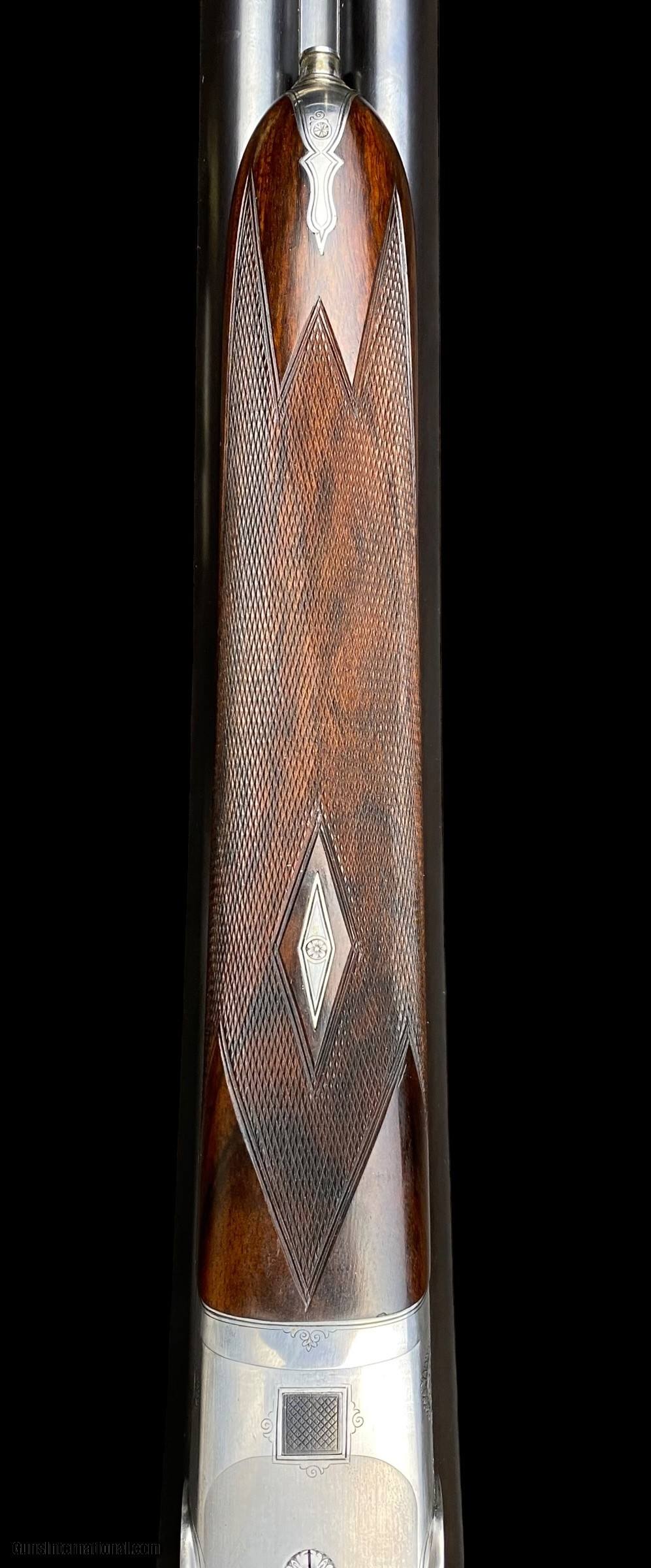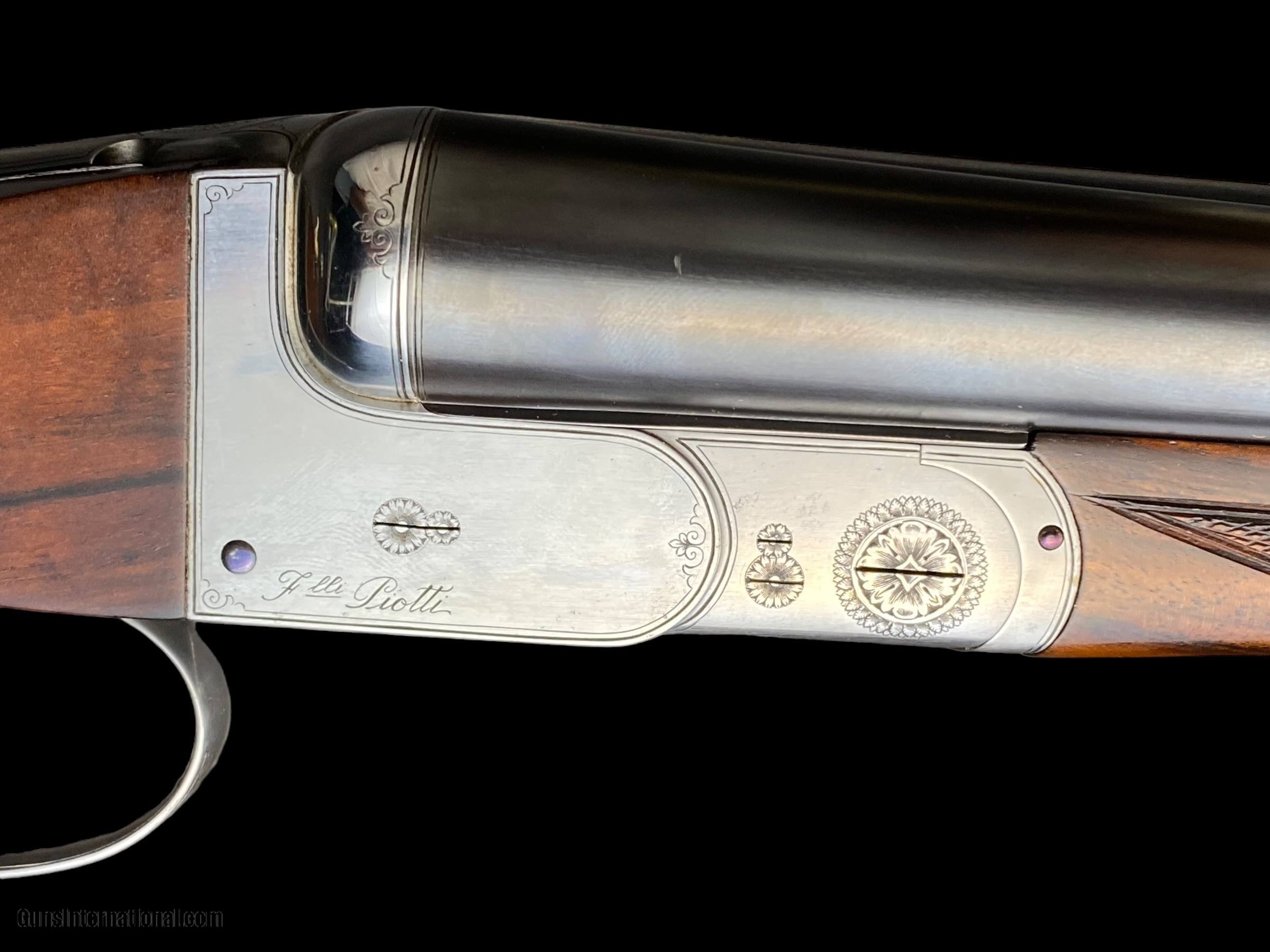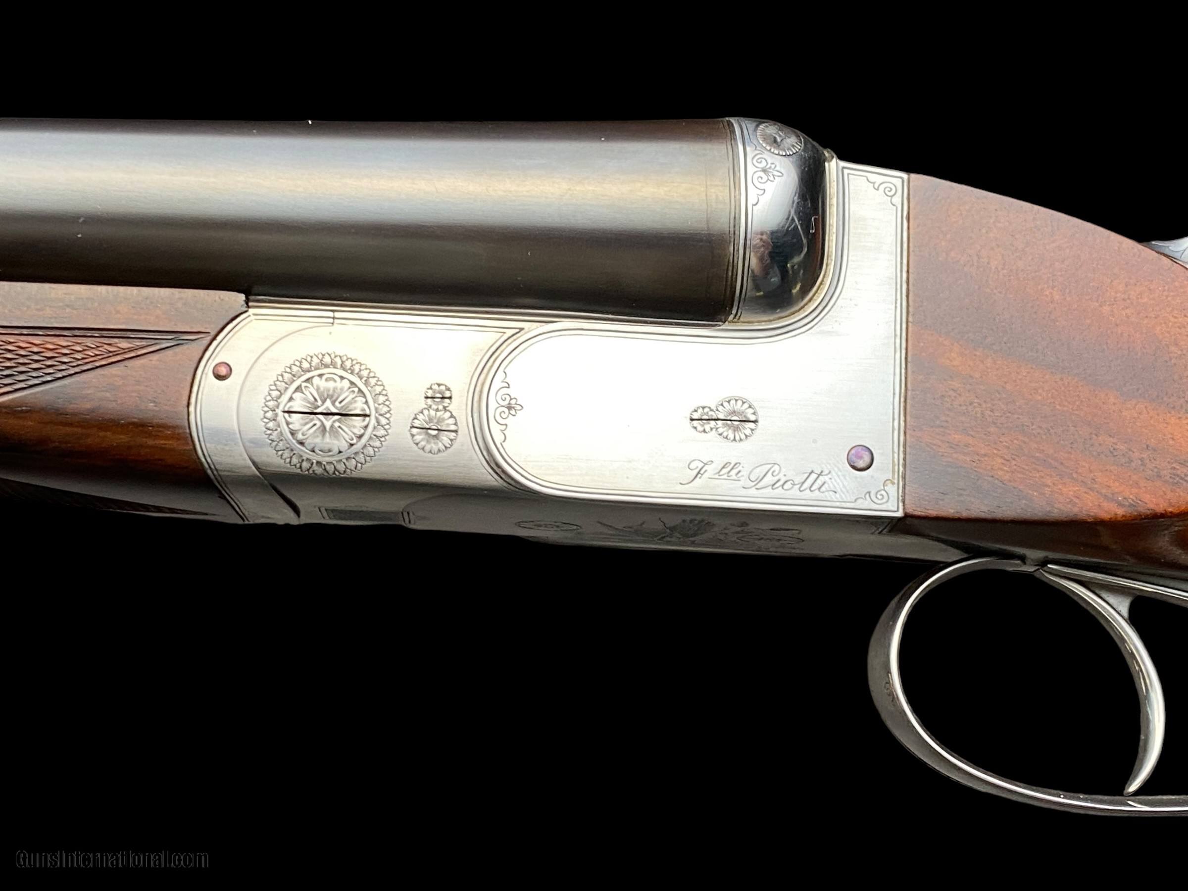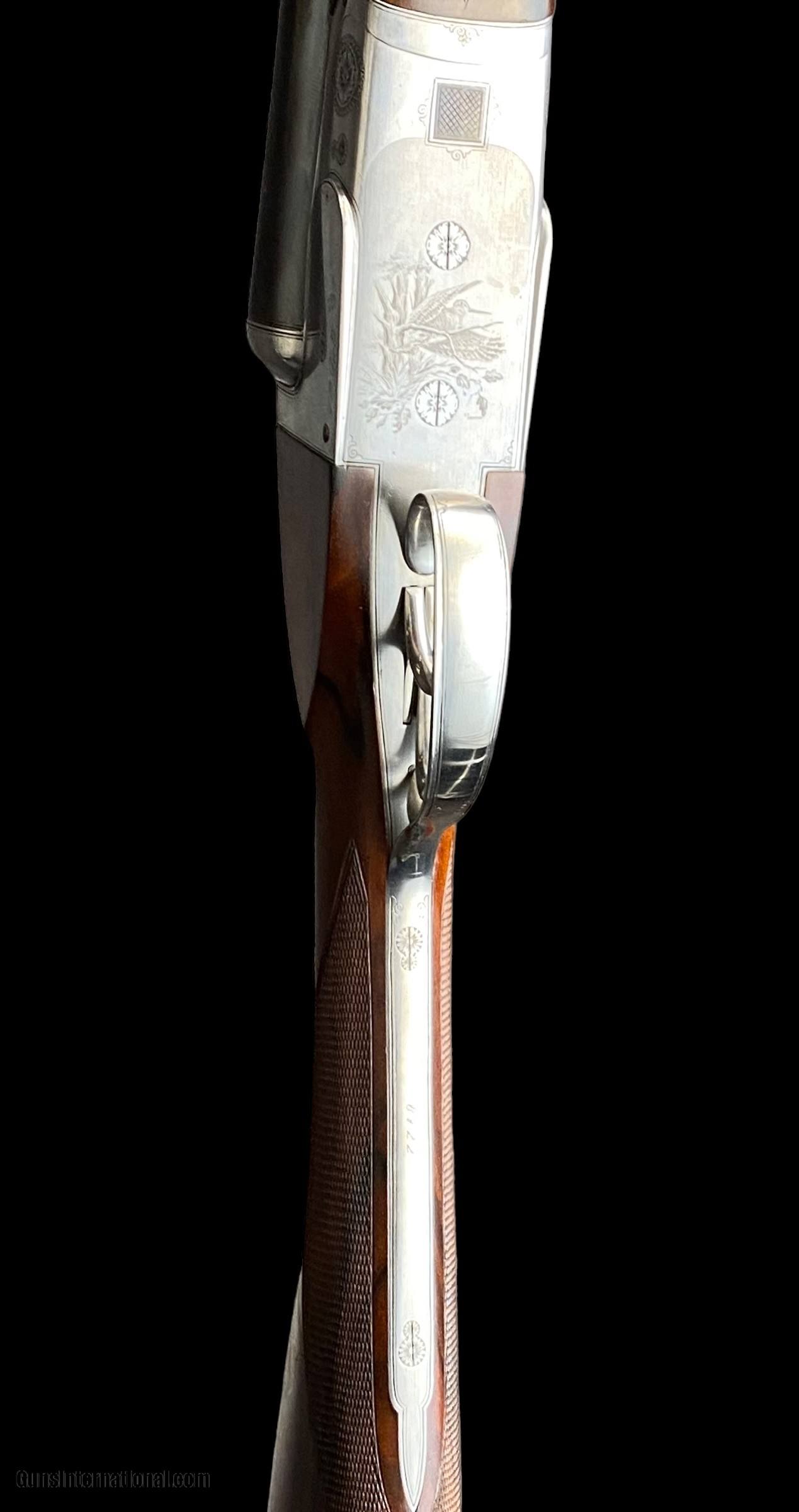 Description: FLLI. PIOTTI - ITALY - 1989 MFG GIANFRANCO PEDERSOLI ENGRAVED - WOODCOCK IN FLIGHT BOXLOCK DOUBLE UNDERBITE AND CROSSBOLT ACTION BRIGHT COIN FINISH EJECTORS DOUBLE TRIGGERS NON AUTOMATIC SAFETY WITH GOLD "S" 27.5" BBLS W/ HAND-FILED RIB CHOKES: .022 / .034 BEAUTIFUL STRATIGHT GRAINED WALNUT ENGLISH STOCK AND SPLINTER FOREND W/ DOUBLE MULLERED POINT CHECKERING DIMS: 14 5/8" LOP, 1 3/8" DAC, 2 1/8" DAH OVER 1/2" RUBBER PAD WEIGHT: 7LBS 1OZ CONDITION: GUN IS IN EXCELLENT OVERALL ORIGINAL CONDITION SHOWING LITTLE SIGNS OF USE. BORES CLEAR AND BRIGHT. EJECTORS STRONG AND IN-TIME. ALL WOOD FINISH REMAINS. GENTLEMEN, THIS IS A FINE PIOTTI GAME GUN AND WITH ENGRAVING BY THE REVERED GIANFRANCO PEDERSOLI. A BEAUTIFUL GUN! PLEASE CALL NOW! FFL REQUIRED FLAT $50 S/H/I CARD FEE APPLIES SOLD Manufacturer: PIOTTI Model: BLE Serial Number: 8722 Barrel Length: 27.5 Chambers: 2.75 - 70MM Ejectors: YES Condition: EXC Metal Condition: EXC Wood Condition: EXC Bore Condition: EXC Action: BOXLOCK Triggers: DOUBLE |