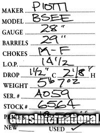 Description: Piotti BSEE 28 gauge SOLD Serial Number: A059 Barrels: 29 Stock Comb: 1 1/2 Stock Heel: 2 1/8 LOP: 14 1/2 Weight: 5lbs 7oz Chokes: M-F |