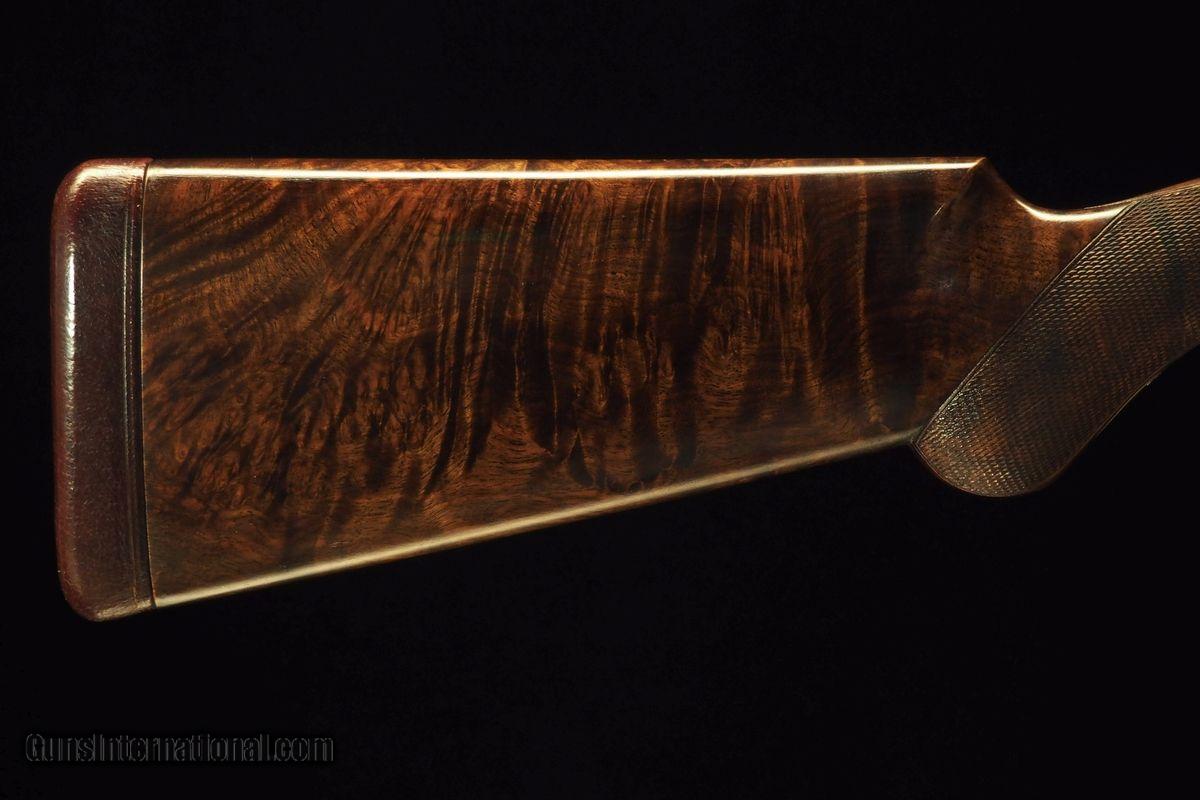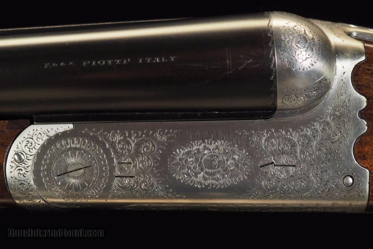 Description: Piotti BSEE Piuma Boxlock, 16 bore, 6 lbs. 9 oz., 2 3/4" chambers, 30" barrels with flat hand file cut rib, choked .009 Lt. Mod. and .022 IM, upgraded highly figured European walnut stock with round knob grip and semi-beavertail forend, 14 1/2" LOP over a leather covered pad, 1 3/8" DAC, 1 11/16 DAH, 3/16" cast off, single trigger, scalloped back boxlock action with English style rose and scroll engraving. Excellent mechanical condition with finishes showing some use, there is some blue thinning on barrels and some handling scuffs on action, front bead has been replaced with a hi-vis red sight. SOLD |