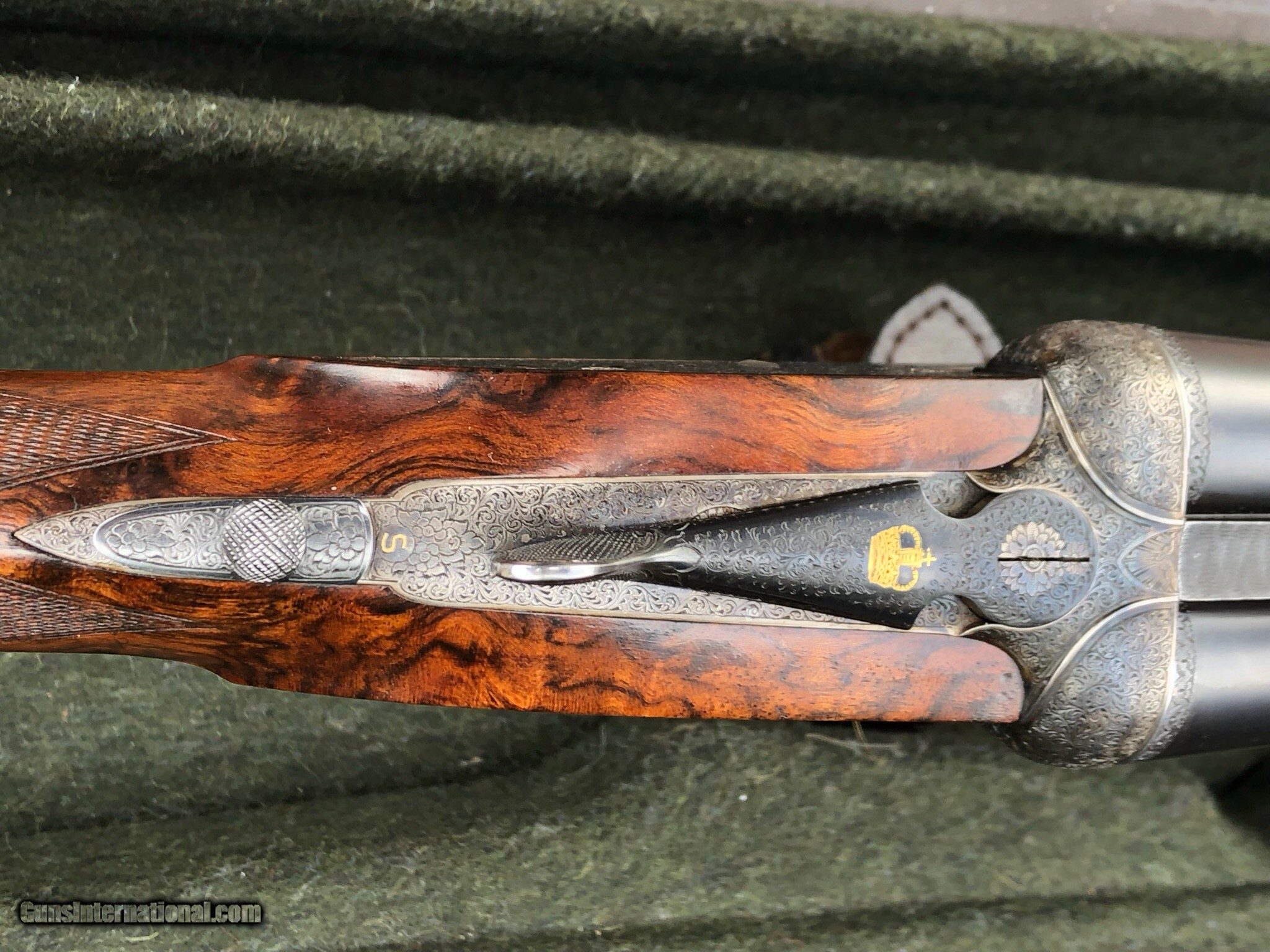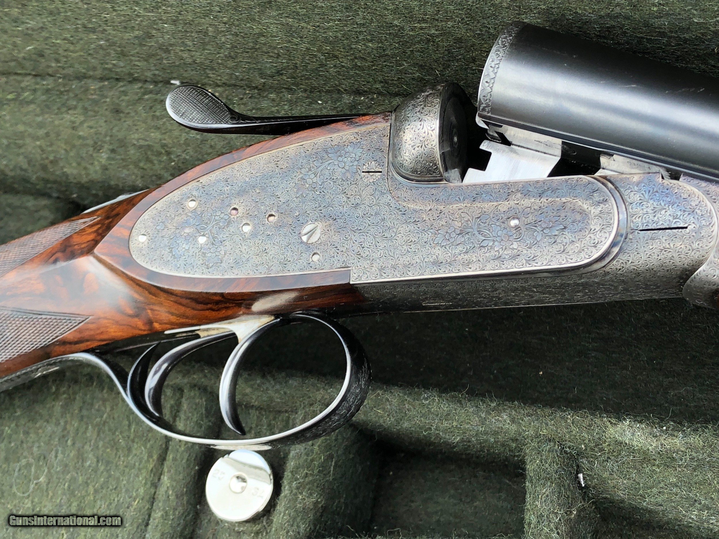 Description: SALE PENDING! It would be hard to find a better upland gun then this Piotti King 1 20ga. With 27 inch barrels bored skeet and light mod. The wood is exceptional with dimensions of 14 5/8 x 1 9/16 x 2 3/8 inches. It a double trigger gun with traditional splinter forend. It's in its original leather case. Full coverage scroll engraving. The case colors are a bit faded and there's a little blue wear at the muzzle, but overall the gun is very nice with excellent bores and mechanics. It weighs 6-5 and handles well. A similar gun sold at Rock Island last month for $20,300! Check the new prices and you'll be amazed. I think you'll find this to be priced under current market. Buy now and I'll pay shipping and insurance to the lower 48. SOLD |