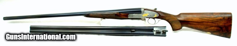 Description: CUSTOM MADE AND ENGRAVED! PIOTTI KING SHOTGUN with EXTRA BARREL SET ... 20 gauge ... #1 barrel is 26" with 2 3/4" chambers, #2 barrel set is 28" with 3" chambers ... weight 6 lbs 1 oz ... LOP 14 5/8" ... drop comb 1 1/2" ... drop heel 1 7/8" ... full sidelock action ... barrels #1-bore dia: L.617, R.620; bore restriction:L.010, R.006; wall thicknessL.036,R.033; barrels #2-bore dia:L.620, R.620; bore restriction: L.025, R.012; wall thickness: L.033, R.032 ... non-automatic safety ... single trigger. Manufactured in 1985. The coin finish receiver has all of the game scenes signed by the engraver, "Balneari". A gold inlaid setter is pointing at a gold inlaid quail on the left side, and a gold inlaid pointer flushing 2 quail on the right. The bottom of the action shows a Bulino portrait of a German shorthair pointing a worried quail. Another signature, "Granetti", is on the trigger plate as the artist who engraved the beautiful scroll & rose bouquet which surrounds these scenes. The operating lever has an inlaid gold soverign's crown and the forearm has an inset gold Piotti crest. Dark, reddish tinge, European walnut is used for the pistol grip stock and splinter forearm. Fine 32LPI checkering with a line border covers the grip and forearm. A gold oval in the toeline is engraved "Donated to Ducks Unlimited by Nan & Frank Pachmayr". This set comes in a high quality leather case, lined in red cloth, with places for both barrels, the stock and accessories which include a Piotti marked square oil bottle and snap caps. Call with any questions and see our other listings for ..."Only the best!" SOLD |