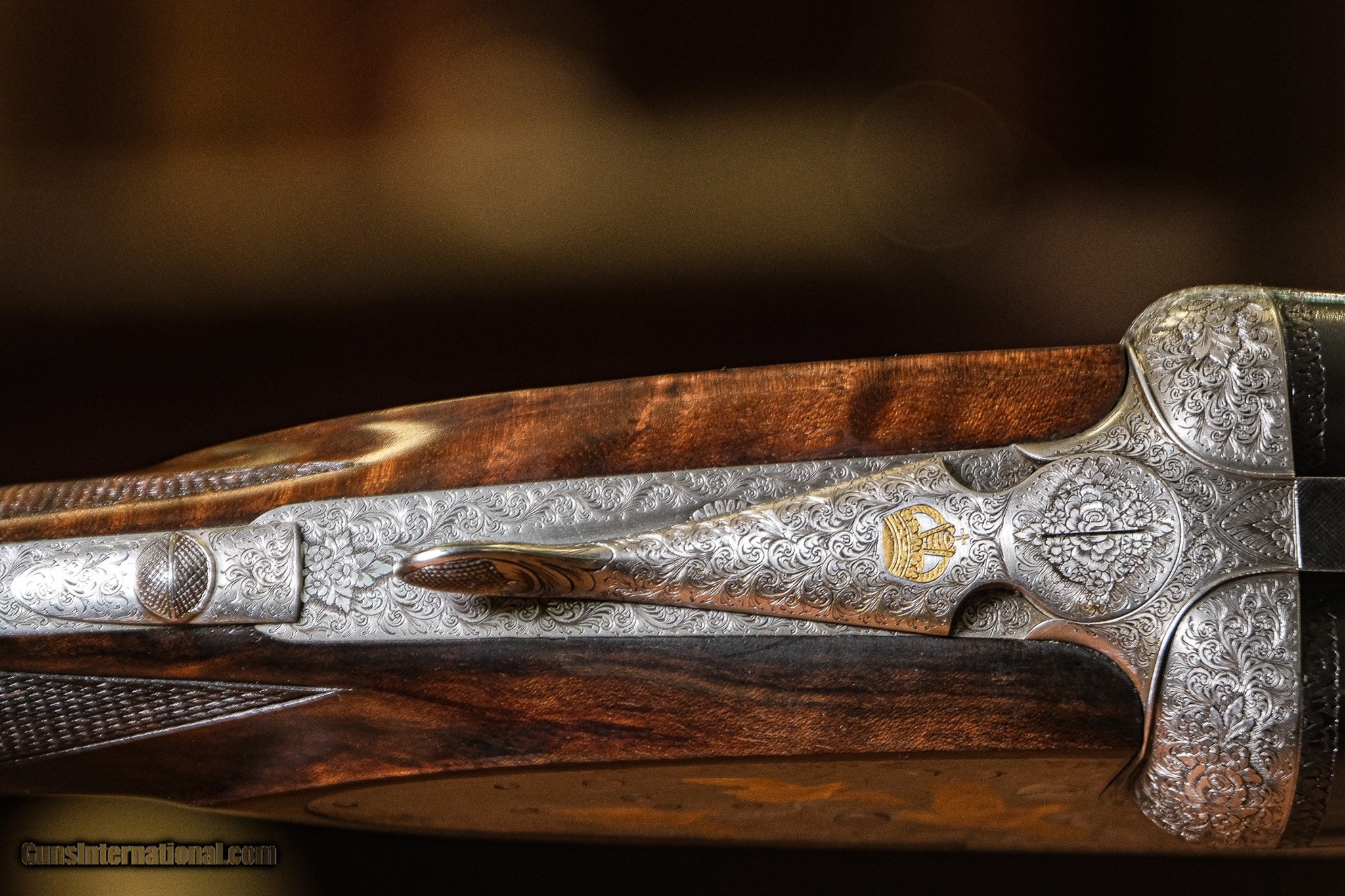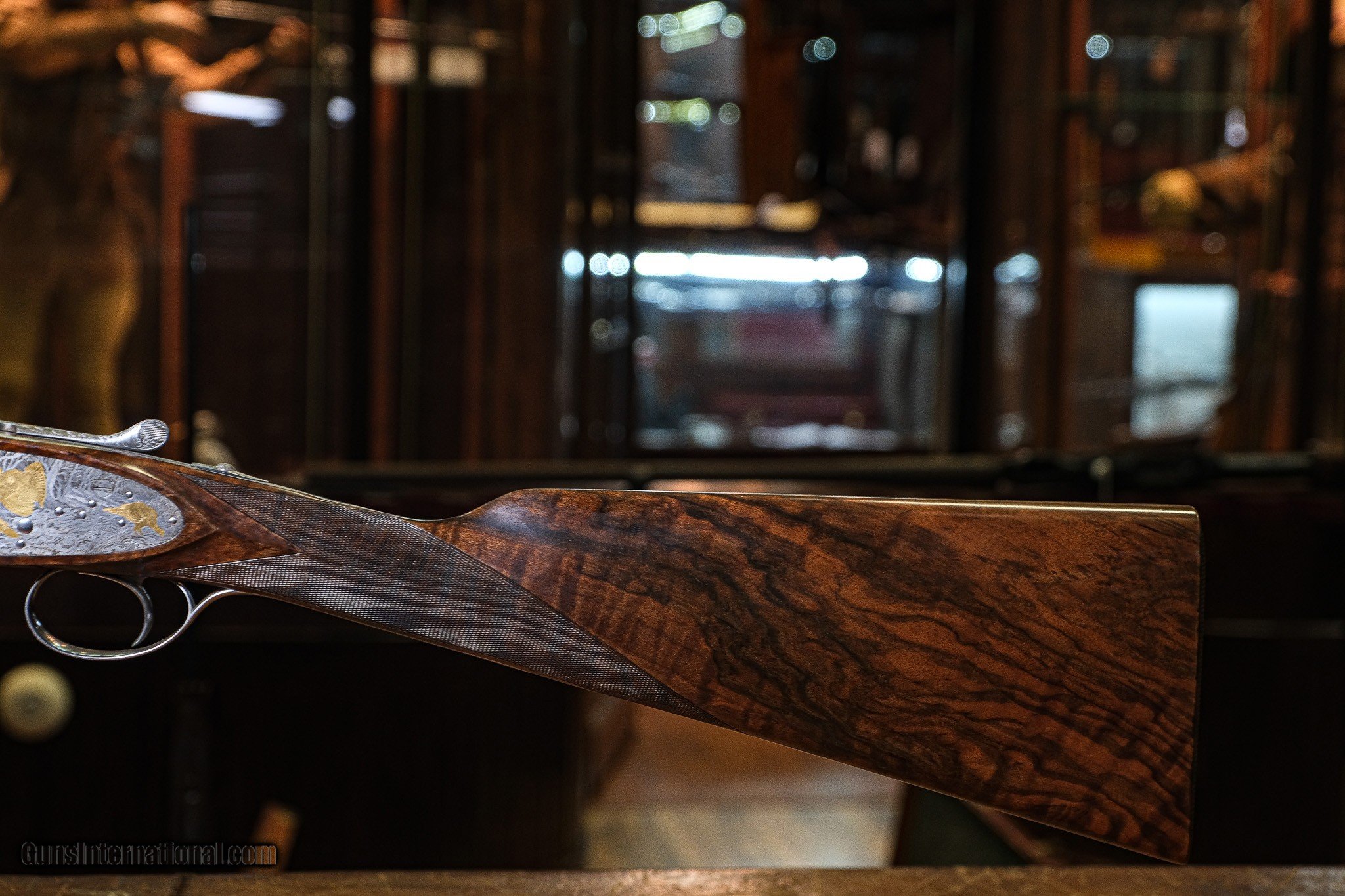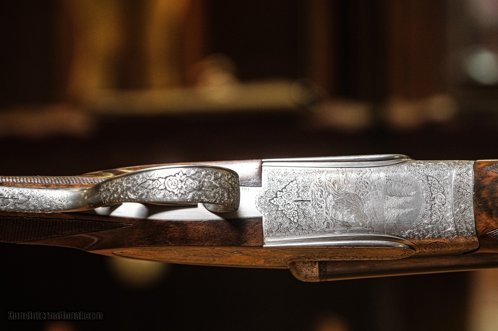 Description: Piotti - King EELL, Full Sidelock, SxS, Engraved By Master Silvano Venzi, 20ga. 26" Barrels Choked 0.025/0.028. Engraved by Master Silvano Venzi. Made in 1983. 26” barrels, chokes are 0.025 & 0.028. Single band engraving on breech. 2 ¾” chamber automatic ejector. This is the highest grade full sidelock with very special American game scene engraving. An extreme high detail is a game line turkey with two hens, on the left side a trio of gold inlayed grouse flying over a field. On the bottom of the frame, is a lifelike depiction of a scene on the stream with a beavertail. All surrounded by the most beautiful game scene background with scroll engraving to the highest order. A gold crown on the top lever, diamond grip, special grip highest grade piece that Piotti could provide. Fine line checkering, checkered butt, single trigger, beavertail forend. Raised cross hatch rib. This gun is simply wonderful in every possible way and is built to the highest order. In its leather takedown case with stock covers. Available at a fraction of what the engraving would cost. No disappointments, just one of the nicest guns you can purchase. Comes with makers case with label and key. Gun is virtually new and is unfired. One of the finest guns in our collection, make an offer. Inv: 87161 5 lbs. 12 oz. 14 5/16" x 1 7/6" x 2 3/16" $37,995.00 SOLD |