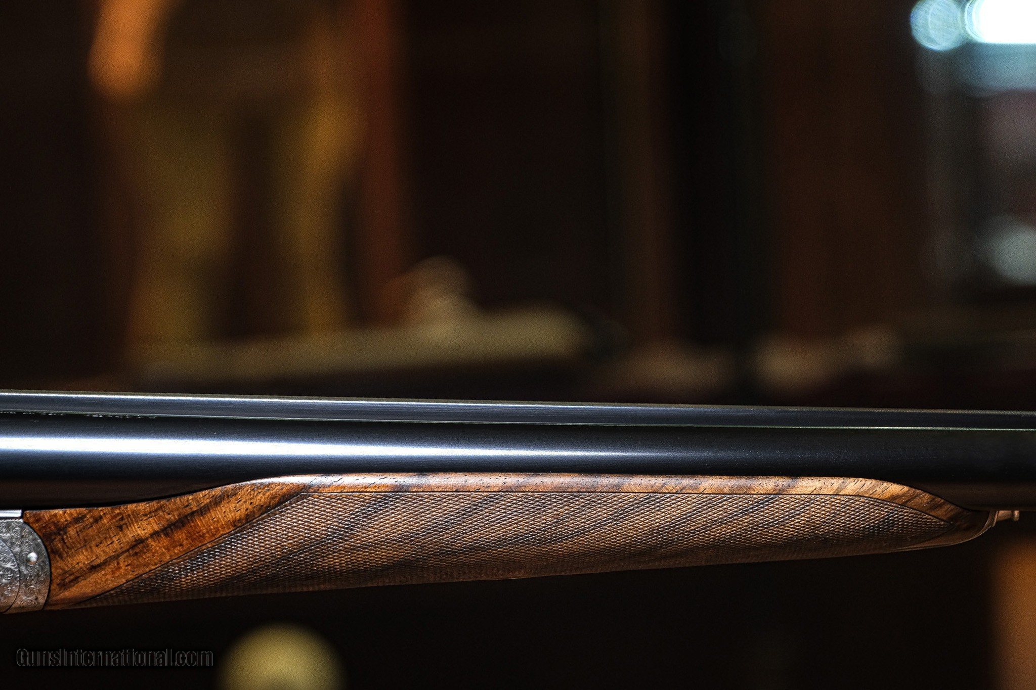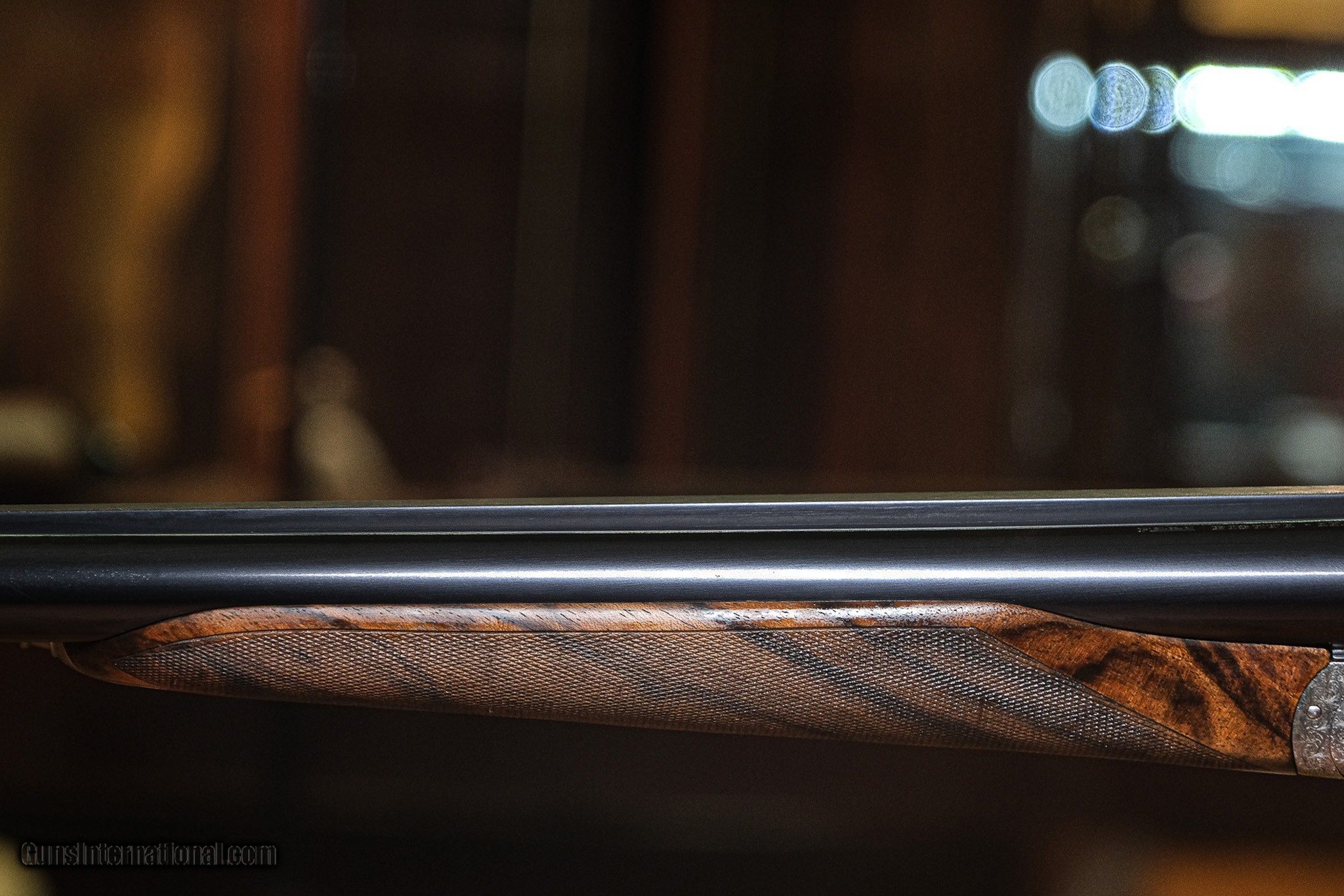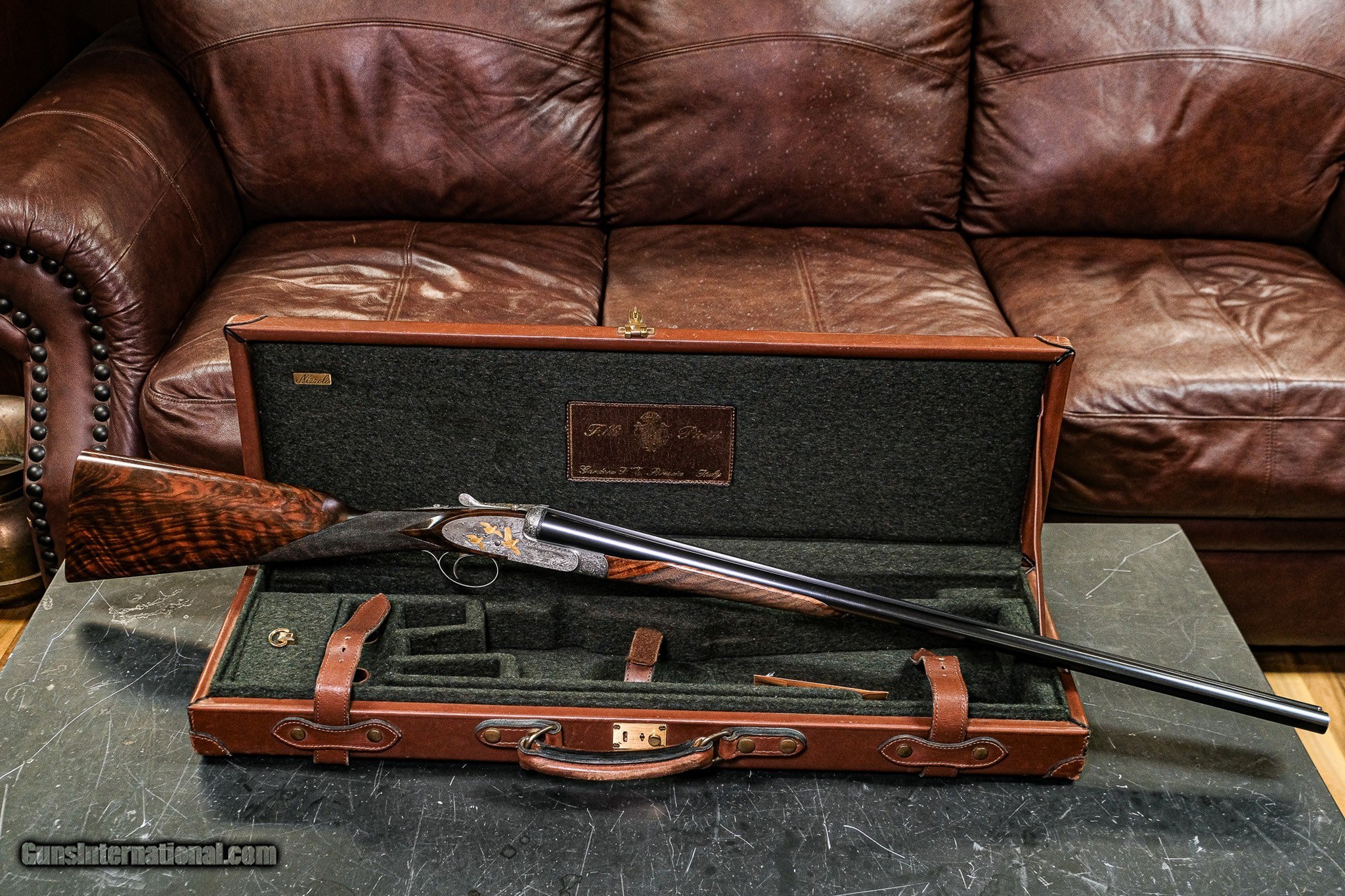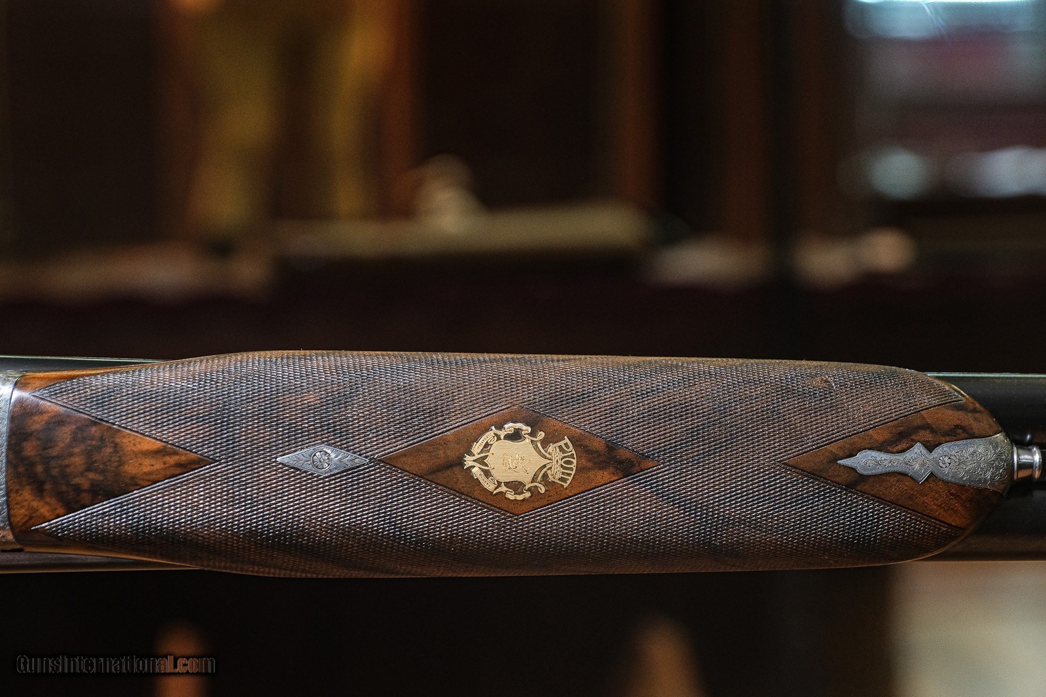 Description: Piotti - King EELL, Full Sidelock, SxS, Engraved By Master Silvano Venzi, 20ga. 26" Barrels Choked 0.025/0.028. Engraved by Master Silvano Venzi. Made in 1983. 26” barrels, chokes are 0.025 & 0.028. Single band engraving on breech. 2 ¾” chamber automatic ejector. This is the highest grade full sidelock with very special American game scene engraving. An extreme high detail is a game line turkey with two hens, on the left side a trio of gold inlayed grouse flying over a field. On the bottom of the frame, is a lifelike depiction of a scene on the stream with a beavertail. All surrounded by the most beautiful game scene background with scroll engraving to the highest order. A gold crown on the top lever, diamond grip, special grip highest grade piece that Piotti could provide. Fine line checkering, checkered butt, single trigger, beavertail forend. Raised cross hatch rib. This gun is simply wonderful in every possible way and is built to the highest order. In its leather takedown case with stock covers. Available at a fraction of what the engraving would cost. No disappointments, just one of the nicest guns you can purchase. Comes with makers case with label and key. Gun is virtually new and is unfired. One of the finest guns in our collection, make an offer. Inv: 87161 5 lbs. 12 oz. 14 5/16" x 1 7/6" x 2 3/16" $37,995.00 SOLD |
