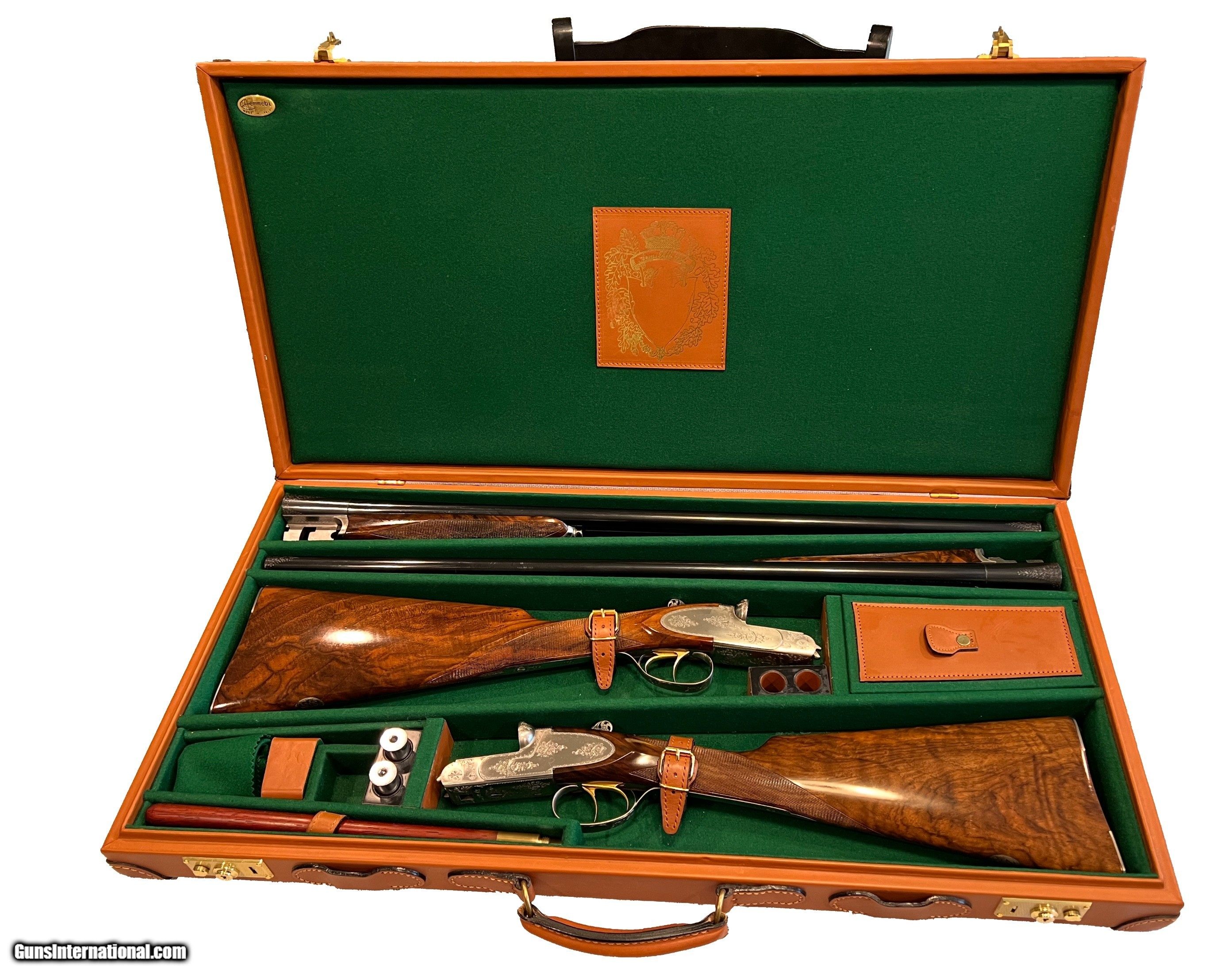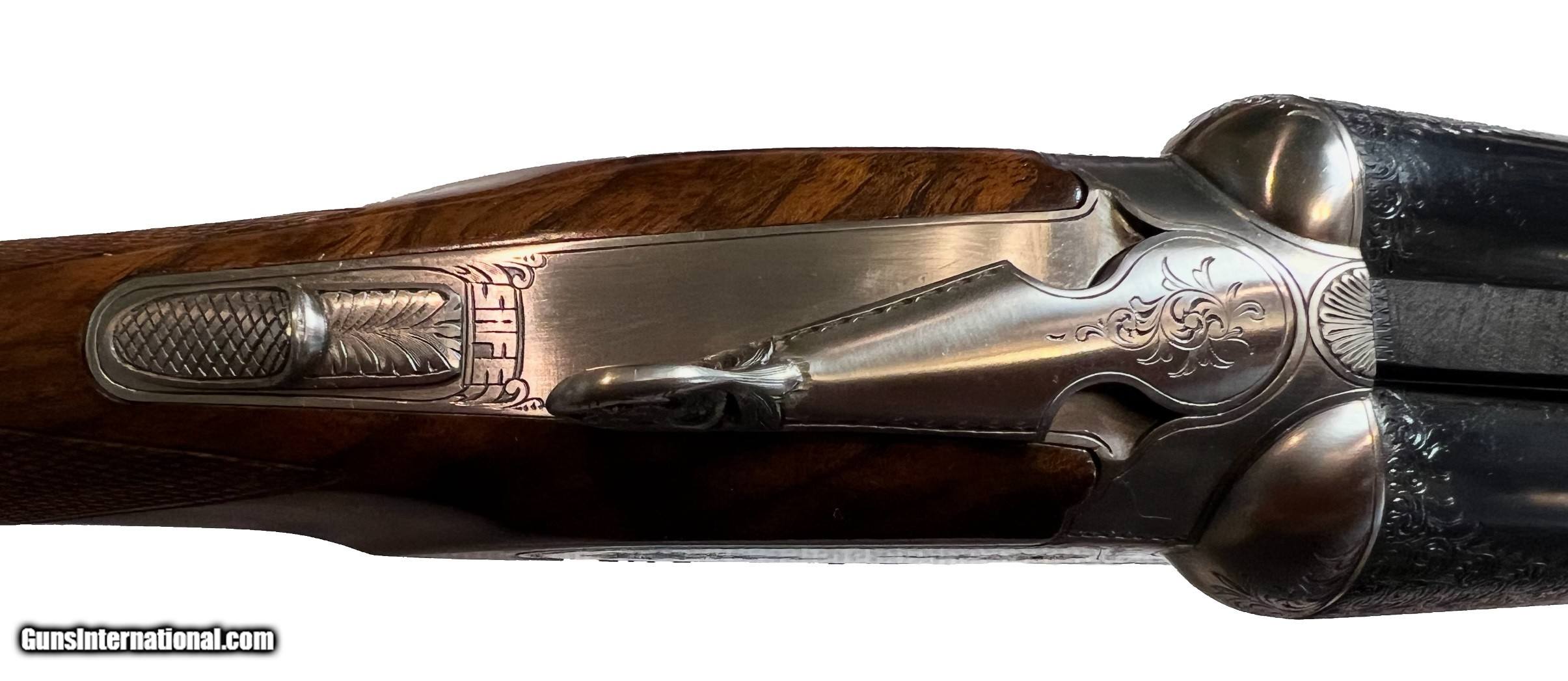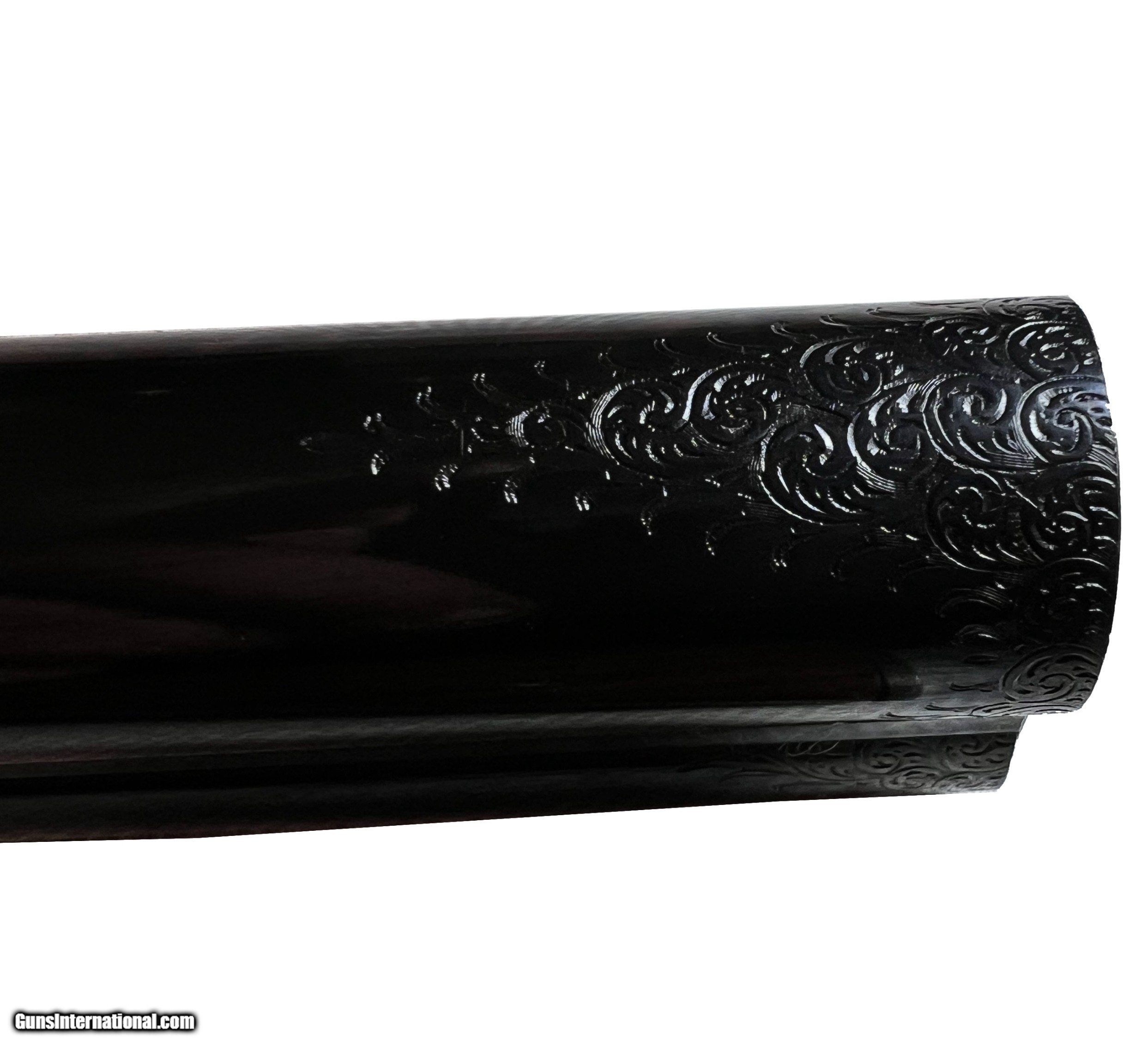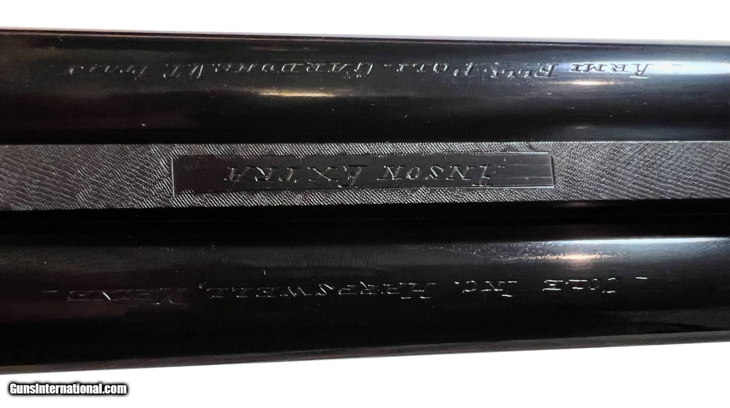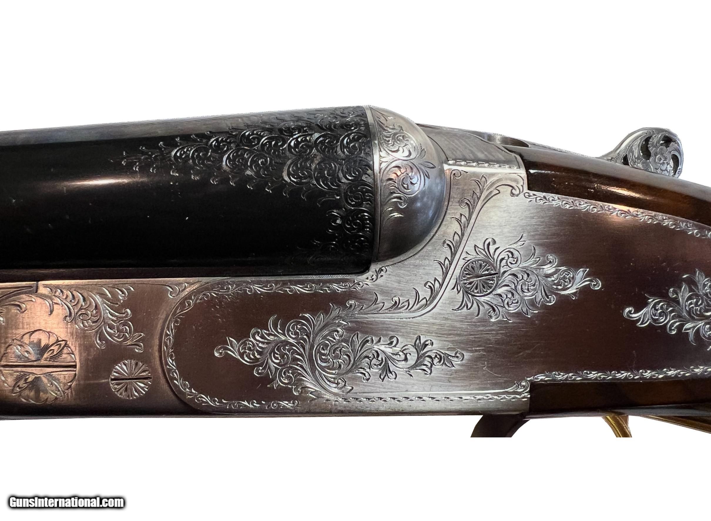 Description: F. Lli Poli Custom Hand Engraved Anson Extra double ejector guns in 16 gauge. Both guns are hand engraved with 28” engraved barrels marked IC and IM (both) with bright and excellent bores. The shotguns are identical in features and dimensions and are in Excellent/Like-New Condition with light handling marks. The barrels are adorned with triangular wedges of foliate scroll on the sides of the muzzle and breeches with “ANSON EXTRA” engraved on the tops of the matted ribs. The sideplated frames, pierced foliate top levers, and other metal surfaces feature a beautiful coin finish with sprays of loose floral scroll with elegant foliate and geometric borders. The underside of the frames are engraved “Armi F. Lli Poli,” and the triggers are gold-plated. The high-grade walnut chosen for these arms features beautiful grain figure. The English with checkered hardwood buttplates flanked by scalloped toe and heel plates and splinter forends with push-button releases are perfectly checkered with wraparound panels. Both guns have drops of 1 1/2” and 2 1/4” with LOP 14-5/8 and 14-3/4”. The guns are in a beautiful Emmebi of Italy case. serial #’s 1392 & 1394. Monogram plates “PC / M”. Free shipping and insurance in the continental USA. SOLD Shotgun Gauge: 16 Gauge Manufacturer: Poli Model: Anson Extra |