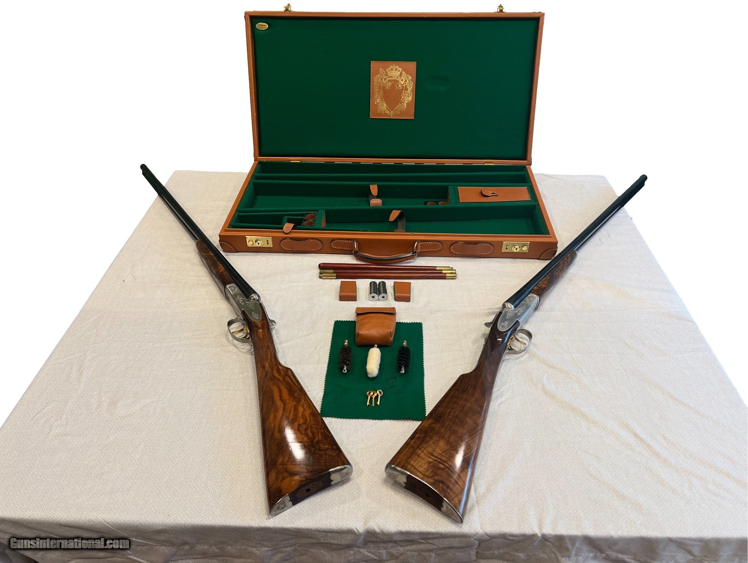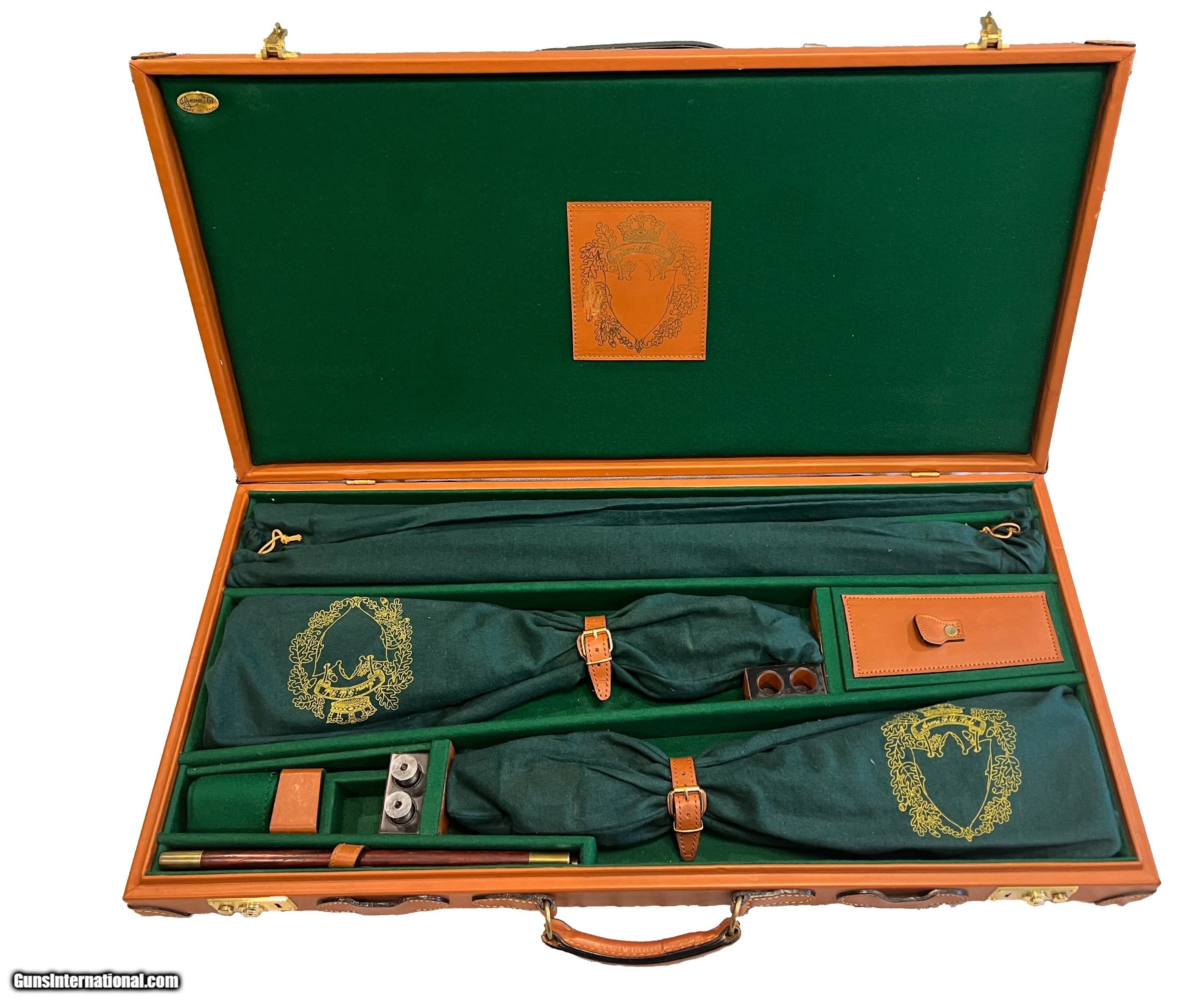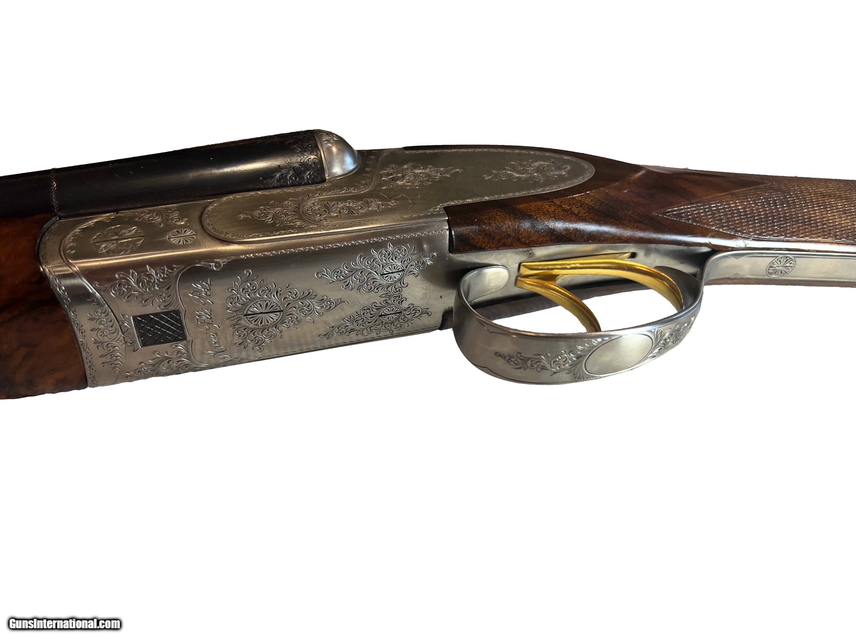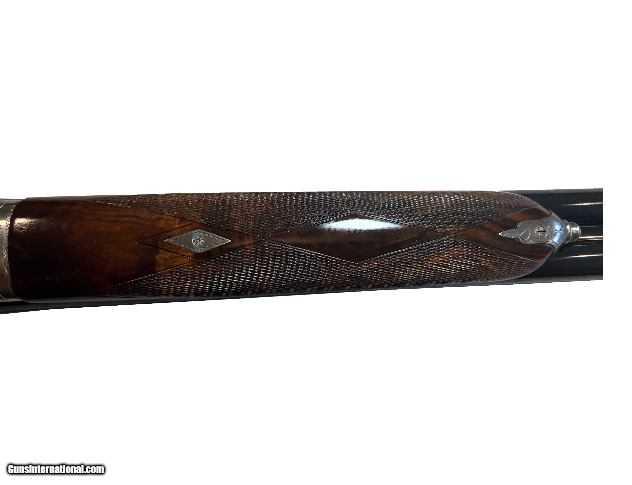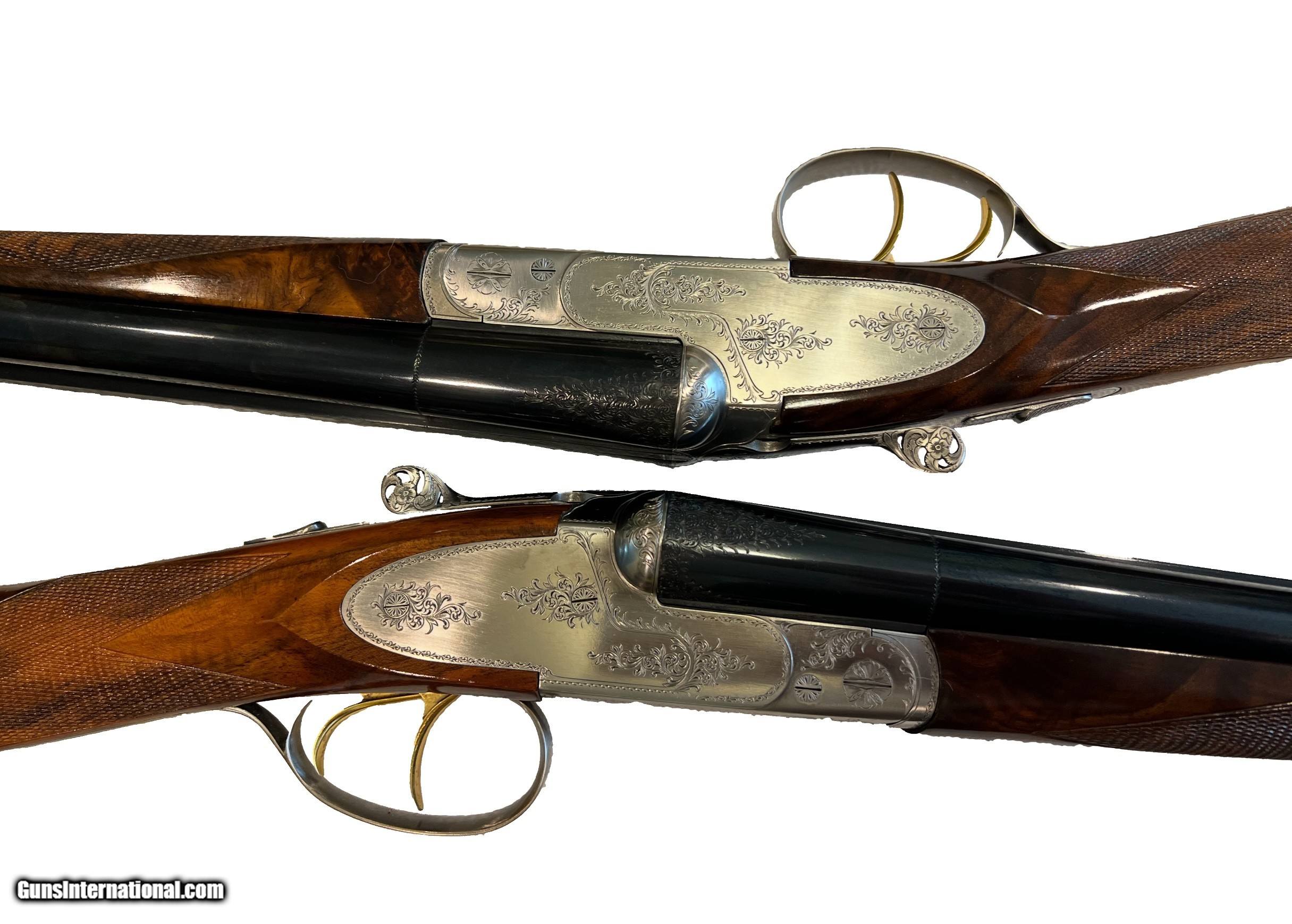 Description: F. Lli Poli Custom Hand Engraved Anson Extra double ejector guns in 16 gauge. Both guns are hand engraved with 28” engraved barrels marked IC and IM (both) with bright and excellent bores. The shotguns are identical in features and dimensions and are in Excellent/Like-New Condition with light handling marks. The barrels are adorned with triangular wedges of foliate scroll on the sides of the muzzle and breeches with “ANSON EXTRA” engraved on the tops of the matted ribs. The sideplated frames, pierced foliate top levers, and other metal surfaces feature a beautiful coin finish with sprays of loose floral scroll with elegant foliate and geometric borders. The underside of the frames are engraved “Armi F. Lli Poli,” and the triggers are gold-plated. The high-grade walnut chosen for these arms features beautiful grain figure. The English with checkered hardwood buttplates flanked by scalloped toe and heel plates and splinter forends with push-button releases are perfectly checkered with wraparound panels. Both guns have drops of 1 1/2” and 2 1/4” with LOP 14-5/8 and 14-3/4”. The guns are in a beautiful Emmebi of Italy case. serial #’s 1392 & 1394. Monogram plates “PC / M”. Free shipping and insurance in the continental USA. SOLD Shotgun Gauge: 16 Gauge Manufacturer: Poli Model: Anson Extra |