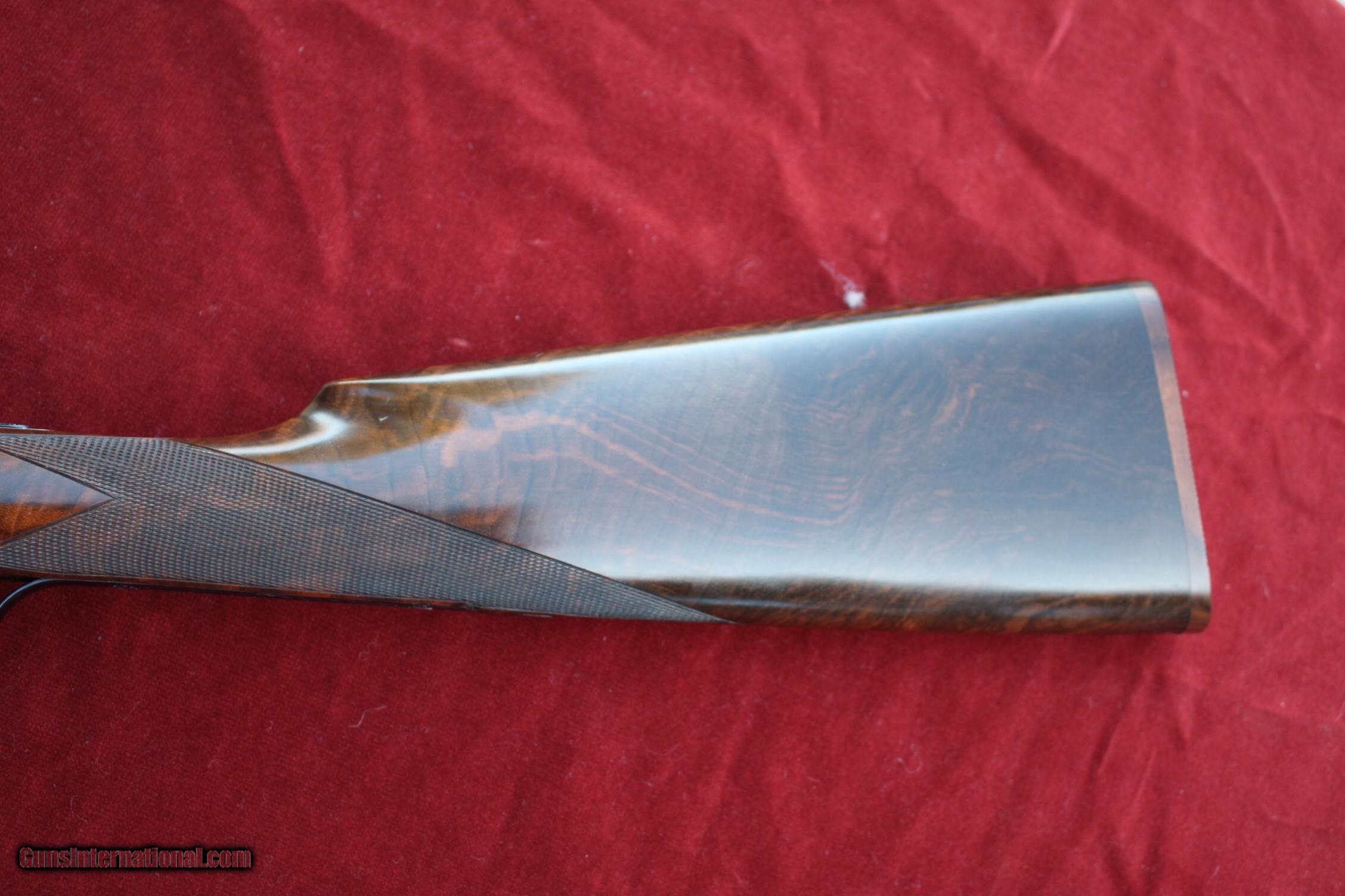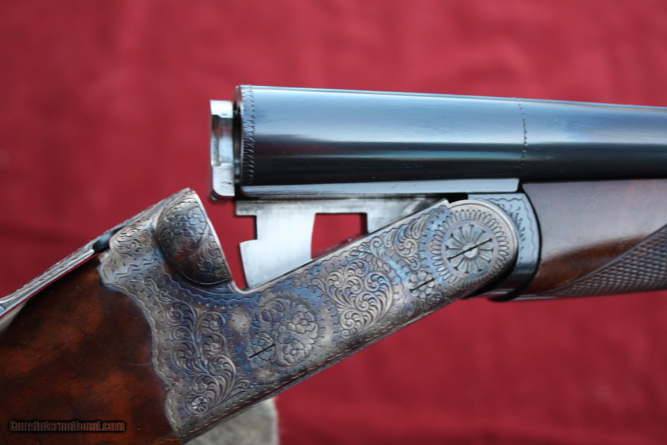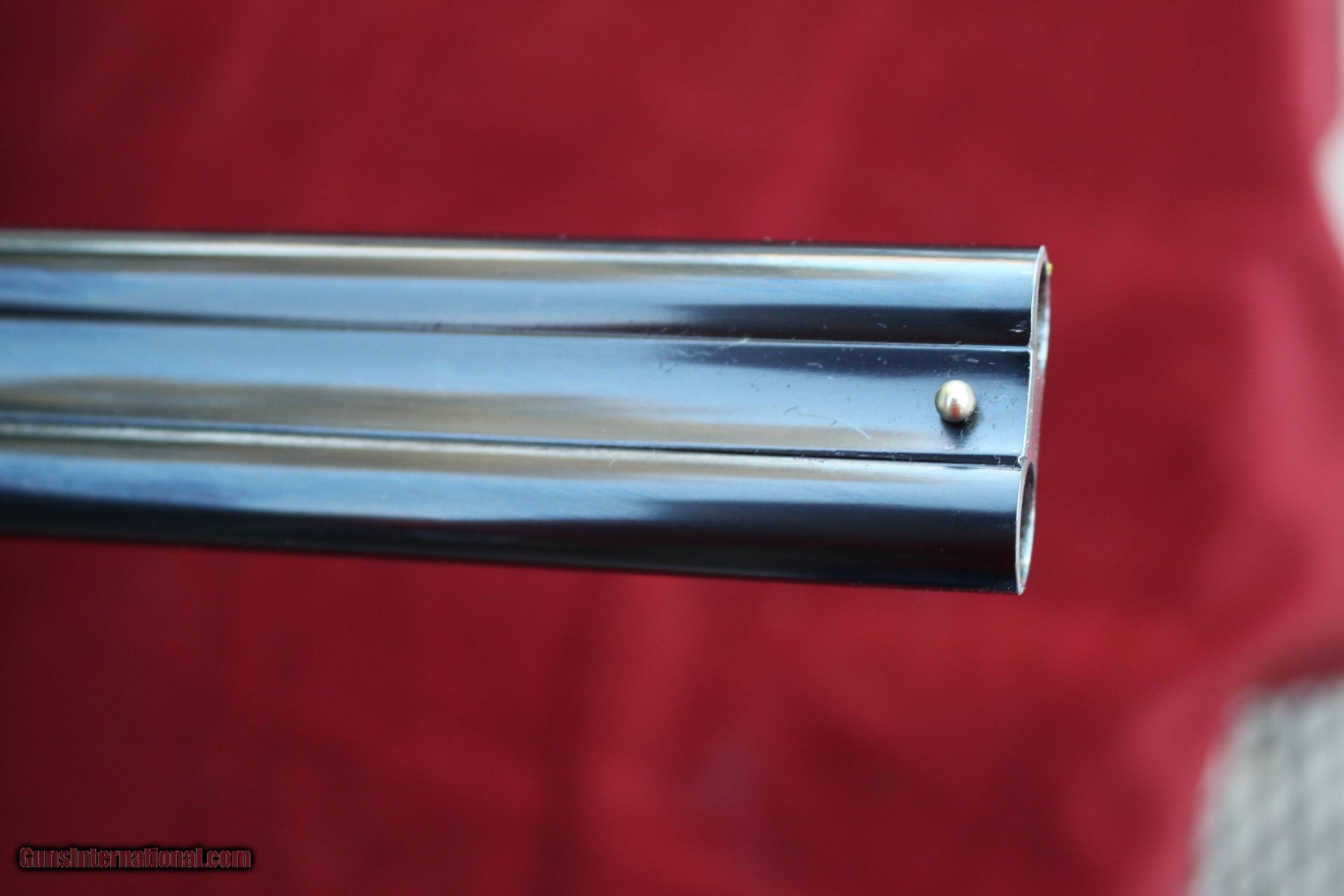 Description: Poli .410 Bore, Upland Extra, A5 Scalloped Fully Engraved, Case Colored Boxlock Ejector. Imported by Tate Gunmakers of California, Double Triggers, Blued Triggers and Trigger Guard, Swamp Rib, Single Bead Sight. Beautiful Dark Walnut on the Stock and Forearm. 27 1/2" Barrels, 14 3/4" LOP from front trigger to a checkered Wood Buttplate, Checkering is sharp, forearm has a Purdey Style Release, 1 3/8" DAC, 2 1/8" DAH, no cast. Choked IC/IM. The gun is 99% plus. Original box is included with no manual. It is a very nice little Italian (Gardone) double. SOLD |