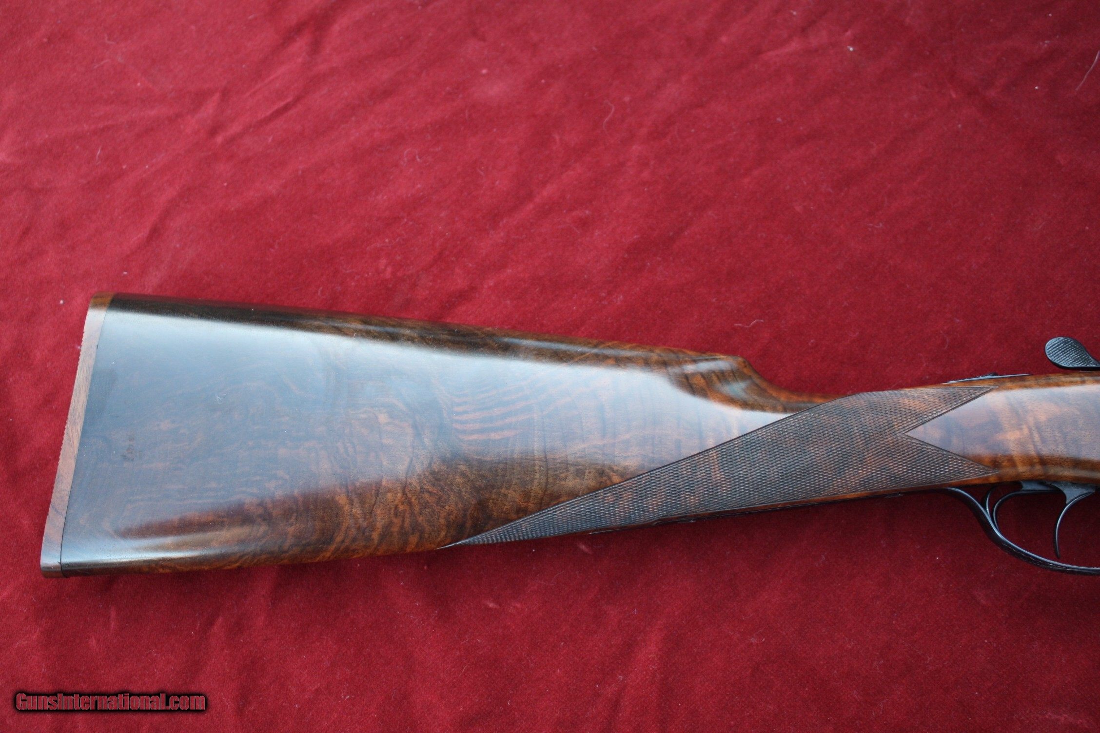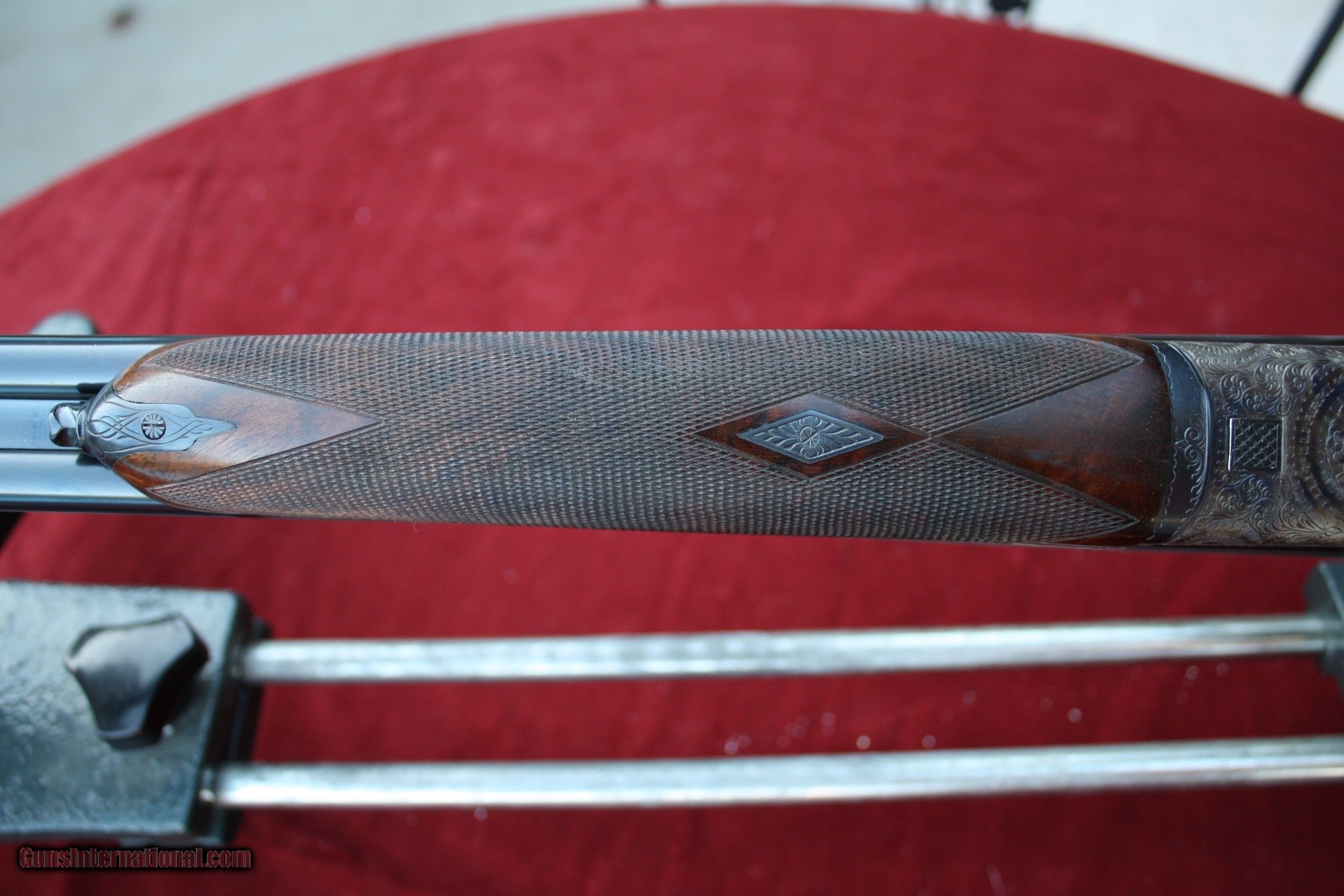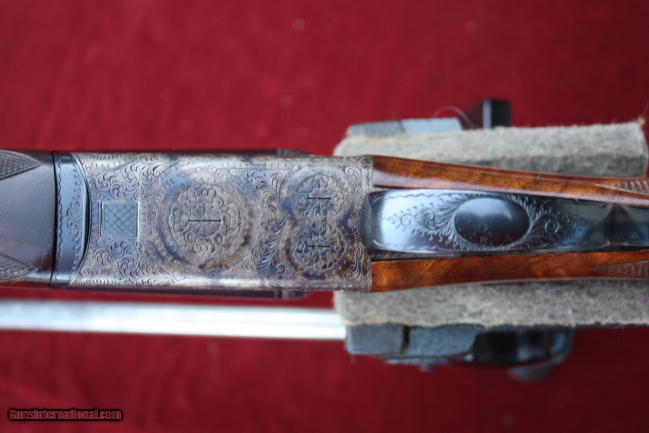 Description: Poli .410 Bore, Upland Extra, A5 Scalloped Fully Engraved, Case Colored Boxlock Ejector. Imported by Tate Gunmakers of California, Double Triggers, Blued Triggers and Trigger Guard, Swamp Rib, Single Bead Sight. Beautiful Dark Walnut on the Stock and Forearm. 27 1/2" Barrels, 14 3/4" LOP from front trigger to a checkered Wood Buttplate, Checkering is sharp, forearm has a Purdey Style Release, 1 3/8" DAC, 2 1/8" DAH, no cast. Choked IC/IM. The gun is 99% plus. Original box is included with no manual. It is a very nice little Italian (Gardone) double. SOLD |