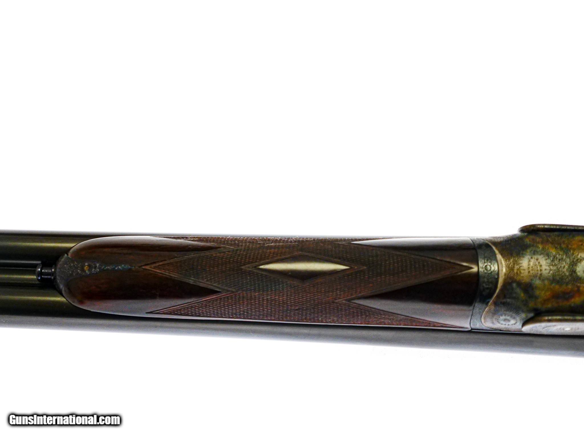 Description: FABULOUS Purdey - SxS, 12ga. 30" Chopper Lump Barrels Choked IC/IM. 2 ½" chambers, self opening, originally #1 of pair, double trigger, straight grip, splinter forend, auto ejector, perfect engraving, perfect wood and wood finish, untouched screws, 98% case color, barrel blue, and wood finish. English style renew years ago and remains virtually in unfired condition. All the fire blue on pins and trigger guard is perfect. Virtually indistinguishable from a new gun. Comes from a magnificent case with all its accessories. Just an outstanding gun at a more than reasonable price that you'll never see again. Inv: 68785 6 lbs. 12 oz. 15 1/8" x 1 ½" x 2 5/8" $17,995.00 SOLD |