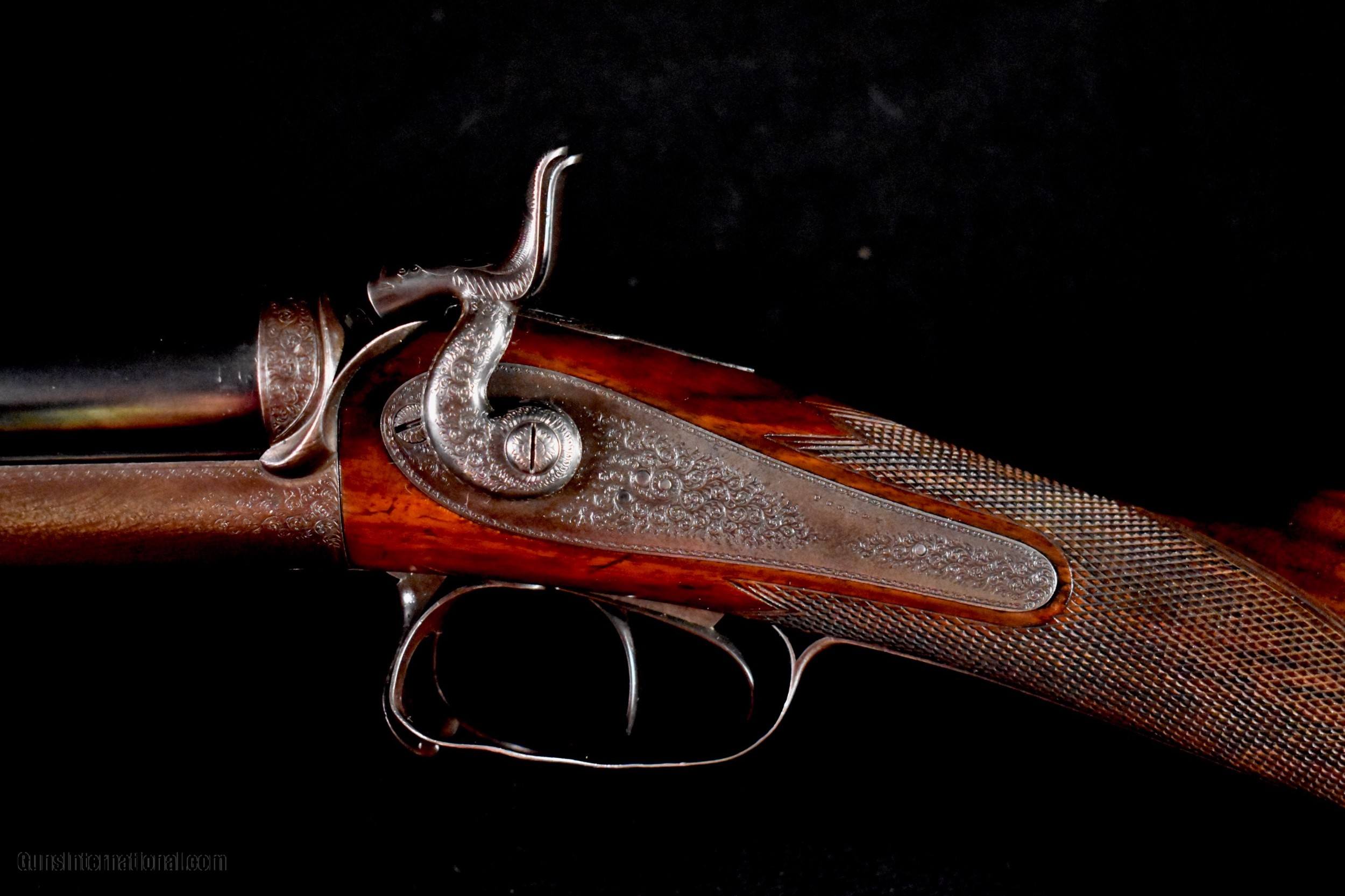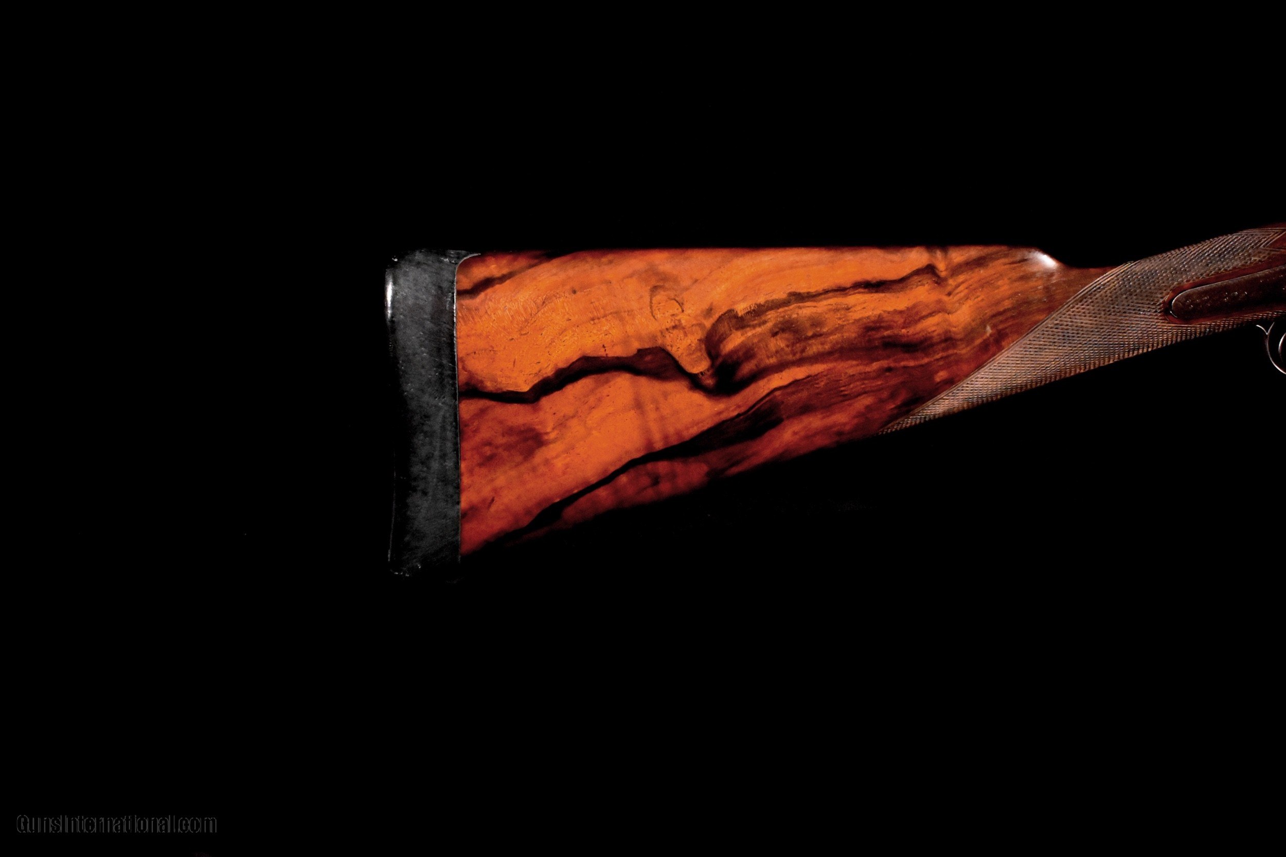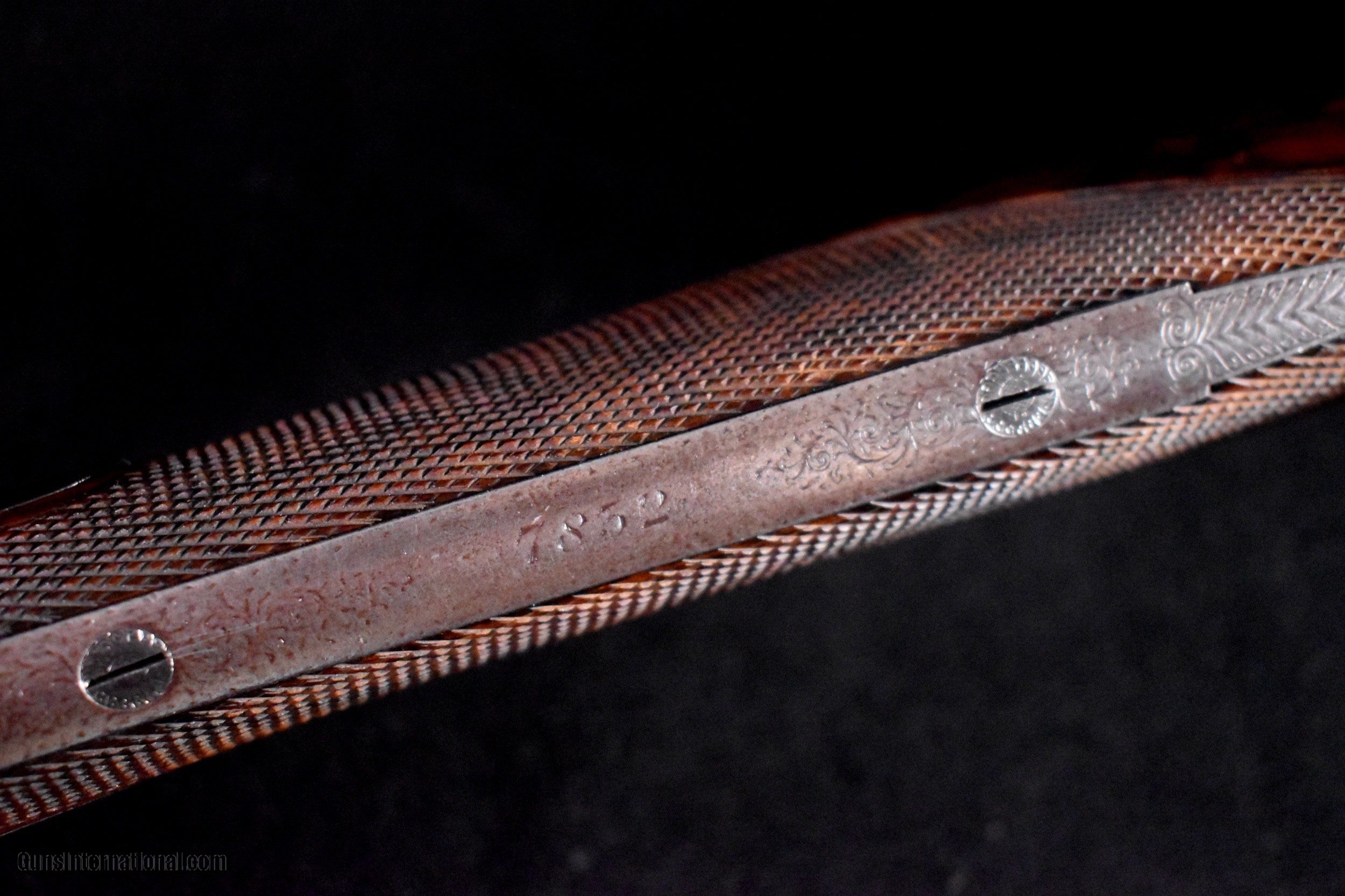 Description: Fine early Hammer gun made in 1867 with scarce Thumb Push opener. This gun with scroll engraved back action locks, wedge fastened splinter forend, straight grip buttstock. Barrels are in proof and have been sleeved so this gun can be used for another couple of centuries without any worry! The gun remains in excellent mechanical condition and is collector and field ready. Stocks are sound, highly figured, and beautiful. Barrels are near mint as seen in the photos. Mechanics are crisp and bores are bright and shiny. This is a really cool Purdey! This gun is priced at $4995 plus shipping to your door. Please dont hesitate to contact me with any questions or reasonable offers at (704) 280-2382 or via PM on this site. SOLD Antique: Yes Shotgun Gauge: 12 Gauge Manufacturer: James Purdey Model: Best quality back action Serial Number: 7832 Barrel Length: 30 Chambers: 2-3/4 Condition: Excellent Metal Condition: Excellent Wood Condition: Excellent Bore Condition: Bright and shiny Barrels: Steel barrels Triggers: Double Triggers Stock: Straight grip highly figured Stock Comb: 1-9/16 Stock Heel: 2-1/4 Fore End: Wedge fastened splinter forend Butt Pad: Black leather covered pad LOP: 14-7/8 Weight: 6lbs 8oz Choke Left: .729 with .030 (Imp. mod) Choke Right: .729 wth .011(Light Mod) Minimum Wall Thickness Left: Over .030 Minimum Wall Thickness Right: Over .030 |