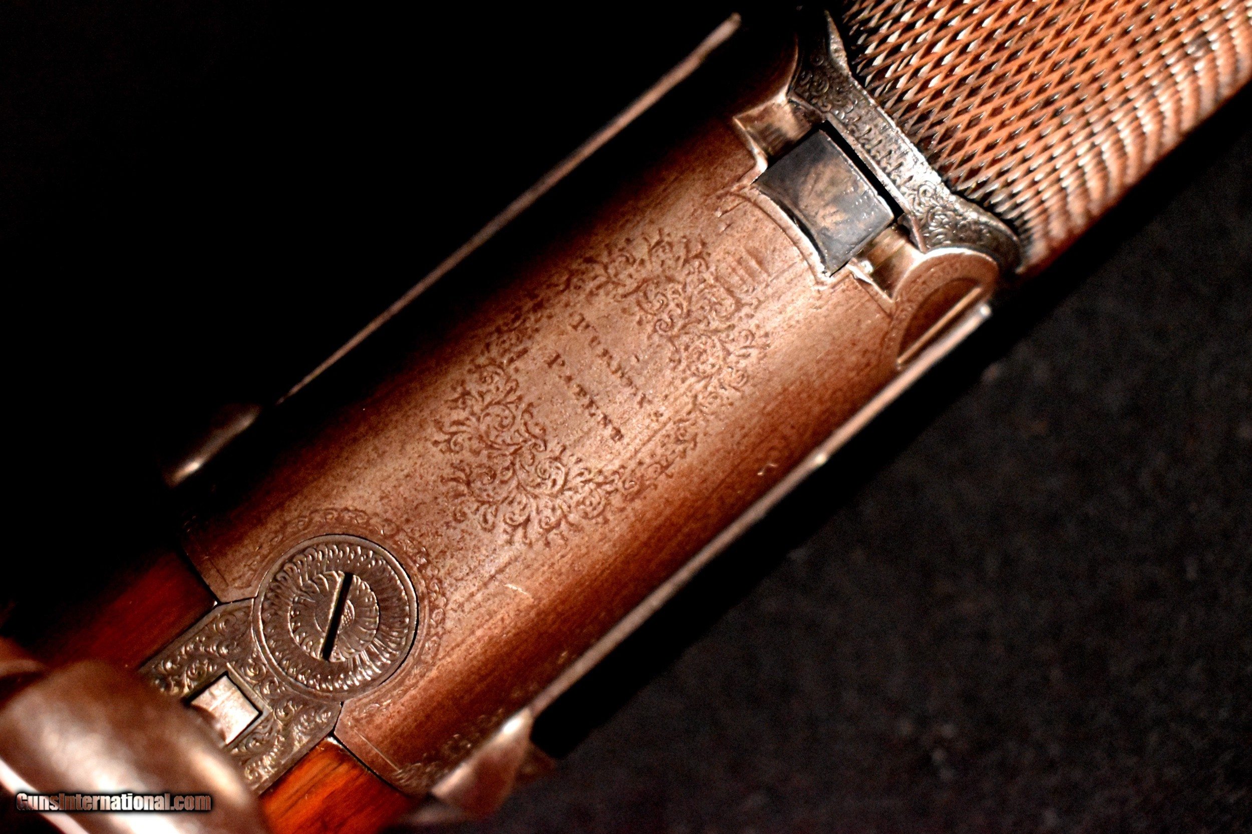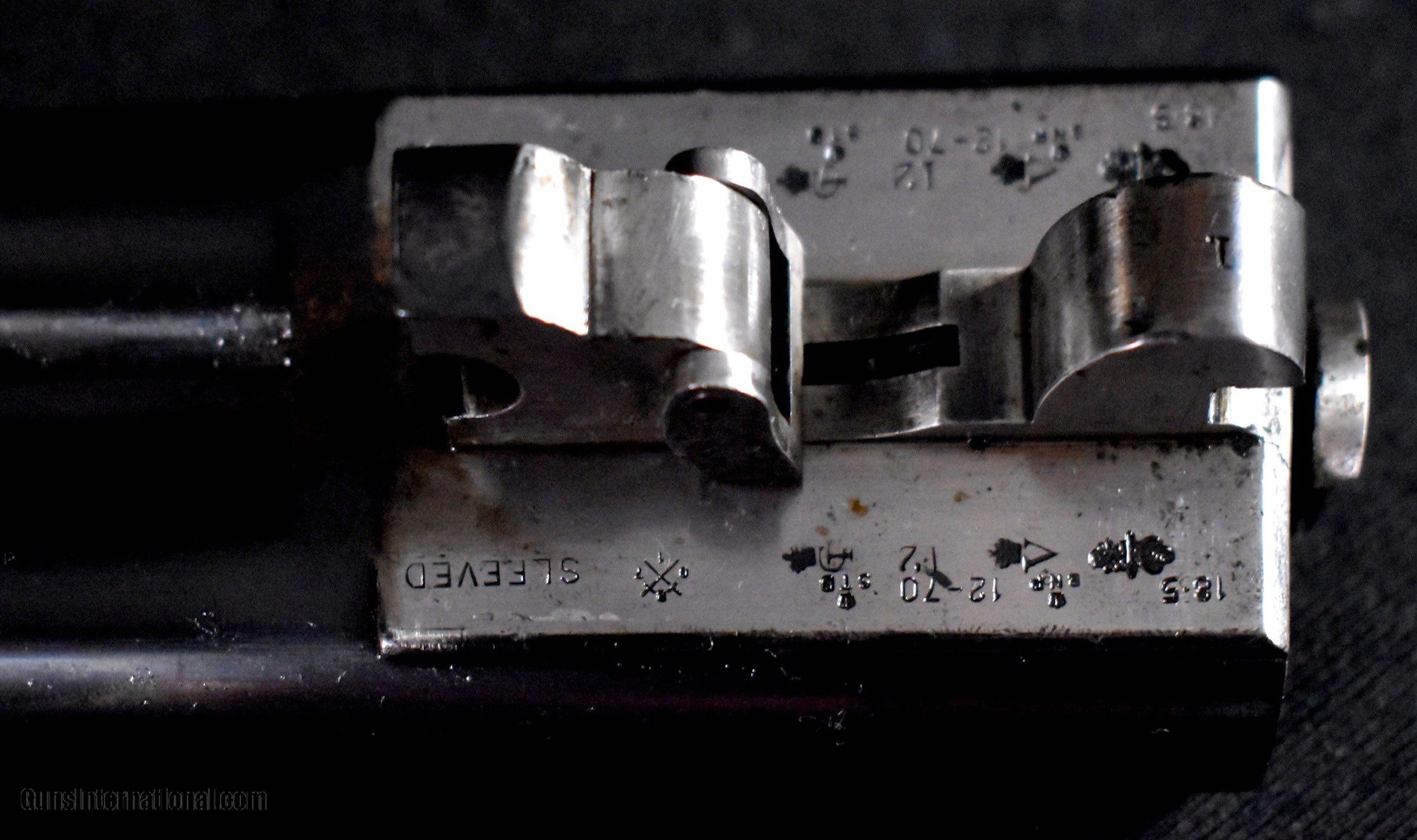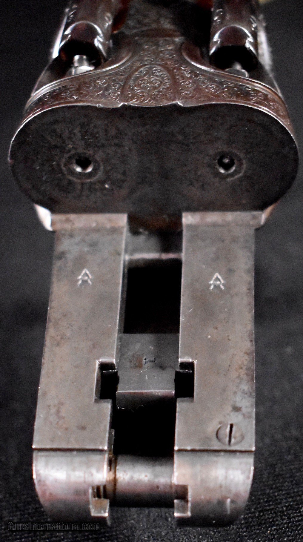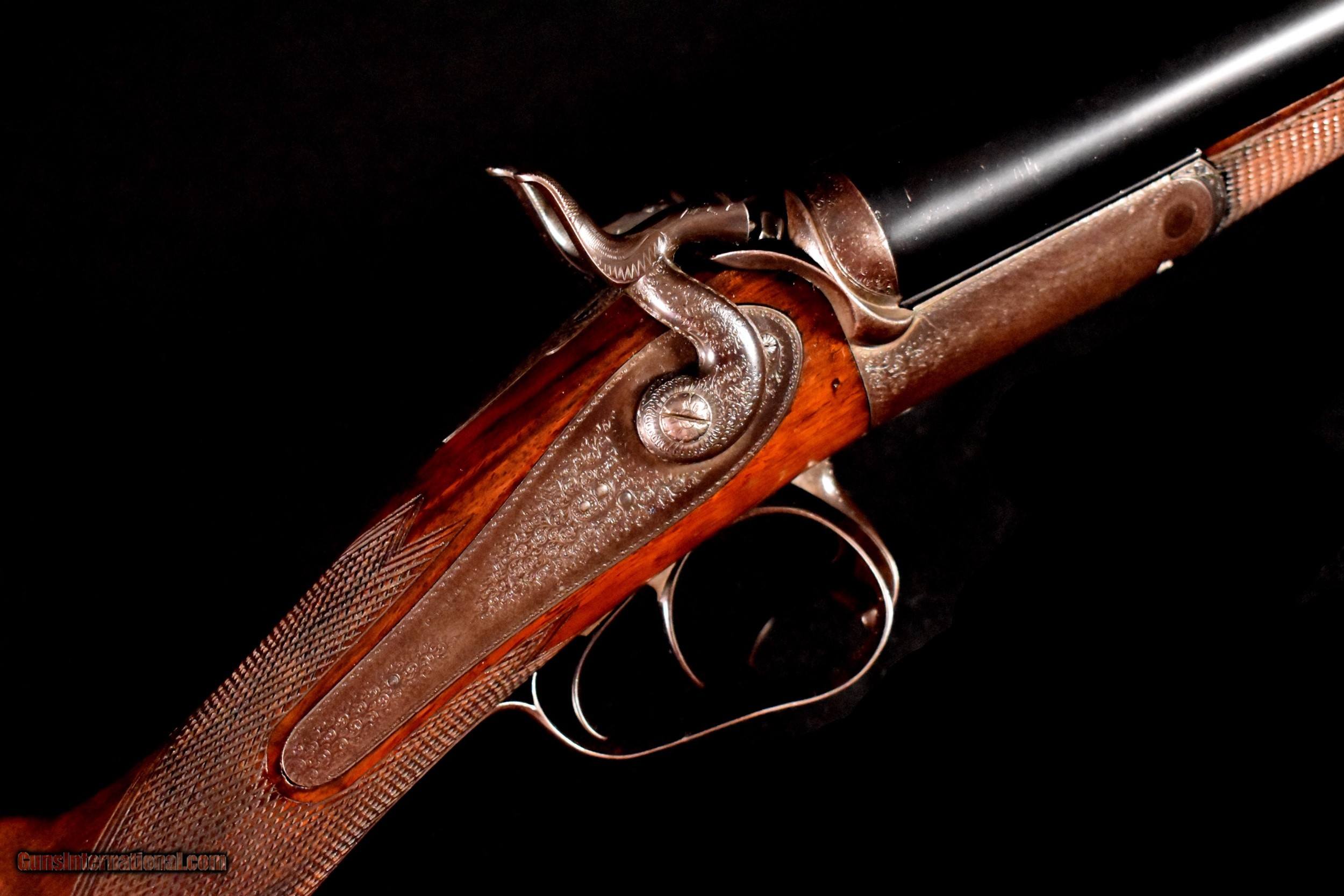 Description: Fine early Hammer gun made in 1867 with scarce Thumb Push opener. This gun with scroll engraved back action locks, wedge fastened splinter forend, straight grip buttstock. Recently nitro proved, sleeved and barrels made with 2-3/4" chambers! Barrels are in proof and have been sleeved so this gun can be used for another couple of centuries without any worry! The gun remains in excellent mechanical condition and is collector and field ready. Stocks are sound, highly figured, and beautiful. Barrels are near mint as seen in the photos. Mechanics are crisp and bores are bright and shiny. This is a really cool Purdey! This gun is priced at $4995 plus shipping to your door. Please dont hesitate to contact me with any questions or reasonable offers at (704) 280-2382 or via PM on this site. Antique: Yes Shotgun Guage: 12 Gauge Manufacturer: James Purdey Model: Best quality back action Serial Number: 7832 Barrel Length: 30 Chambers: 2-3/4 Condition: Excellent Metal Condition: Excellent Wood Condition: Excellent Bore Condition: Bright and shiny Barrels: Steel barrels Triggers: Double Triggers Stock: Straight grip highly figured Stock Comb: 1-9/16 Stock Heel: 2-1/4 Fore End: Wedge fastened splinter forend Butt Pad: Black leather covered pad LOP: 14-7/8 Weight: 6lbs 8oz Choke Left: .729 with .030 (Imp. mod) Choke Right: .729 wth .011(Light Mod) Minimum Wall Thickness Left: Over .030 Minimum Wall Thickness Right: Over .030 SOLD Antique: Yes Shotgun Gauge: 12 Gauge |