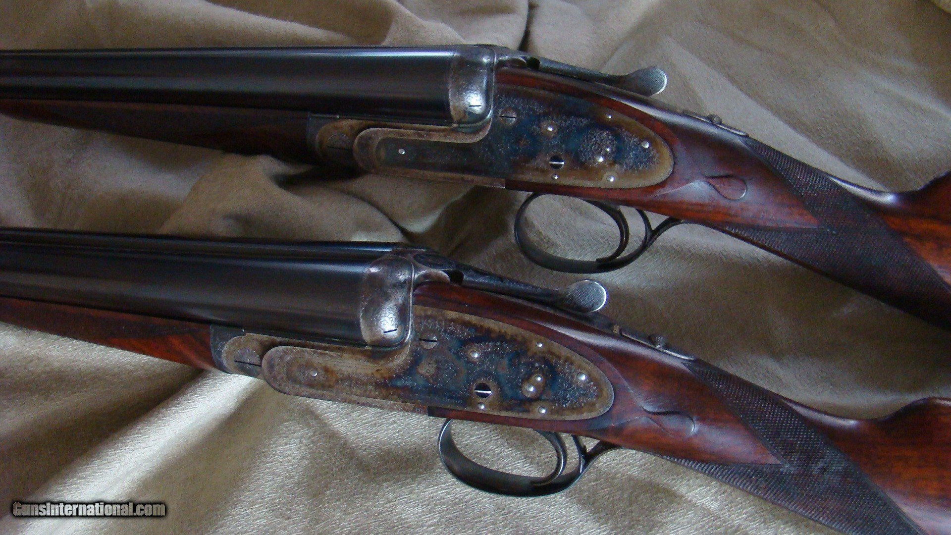 Description: J. Purdey pair 12 ga. game guns, the ultimate pair for driven grouse! 26" barrels feature original 2-3/4" chambers, 1-1/4 oz proof, with hand stippled flat top tapered ribs, choked improved cylinder/qtr and qtr/half. Single triggers, straight stocks. The actions are engraved in the traditional Purdey pattern rose and scroll complete with 99% rich case colors. The barrels retain virtually all the original lustrous barrel blue. The stocks measure 1 -1/2" comb, 2" heel 15" LOP over the 1/2" leather pads, slight cast off. Perfect checkering original finish with some slight handling marks. This quintessential pair, built with the balance and and quickness essential for the grouse moor have been in storage since the 1950's, and remain in outstanding original condition. A true consecutive pair, bearing numbers 1 and 2 on the top levers, weighing 6 lbs 12 oz. Originally ordered by Dean Witter, the founder of the largest investment firm at the time, the twin motorcases are monogrammed "Dean Witter San Francisco". A fabulous pair for the grouse butt, walk up, or just admiring in your armchair SOLD |