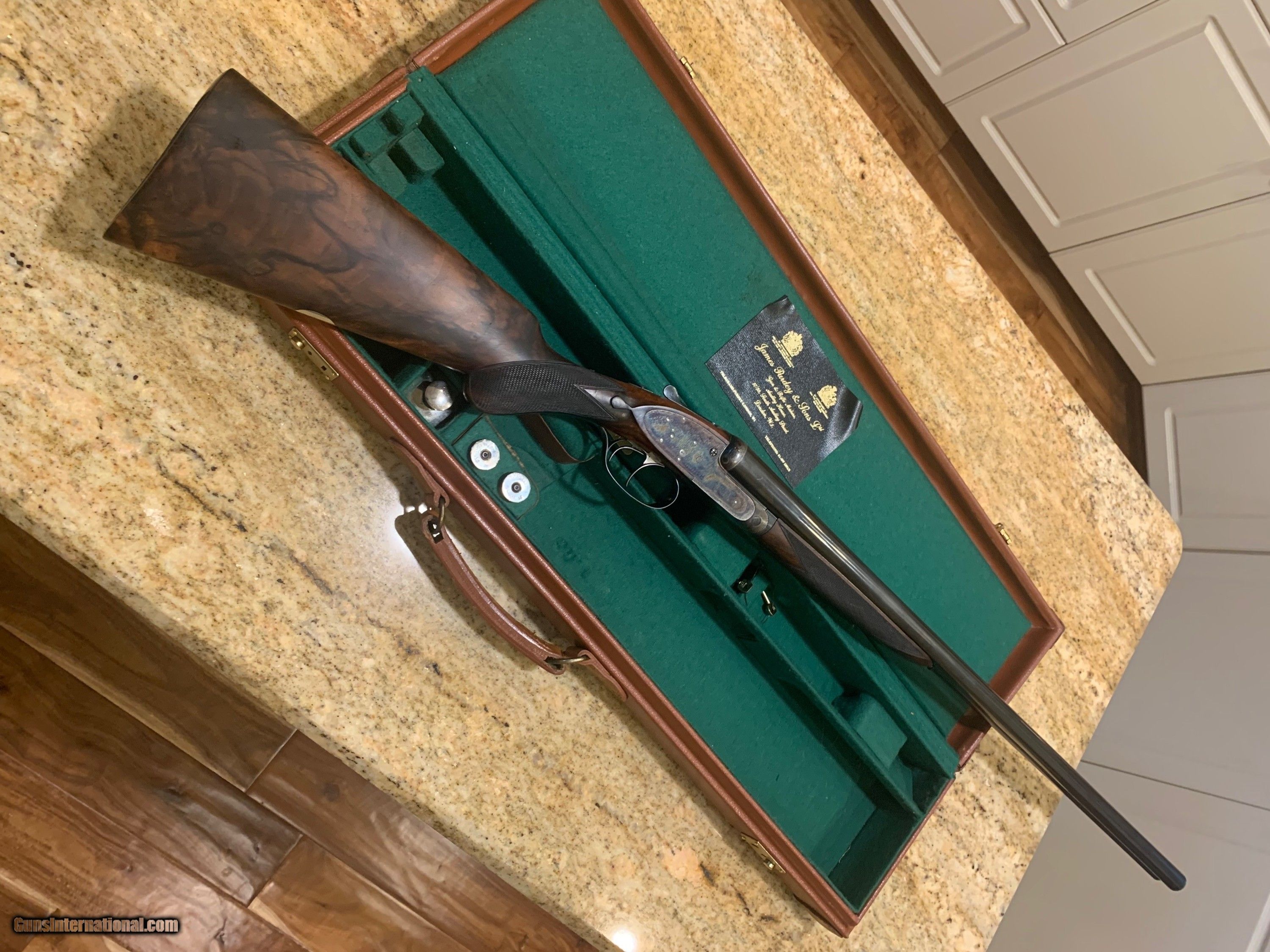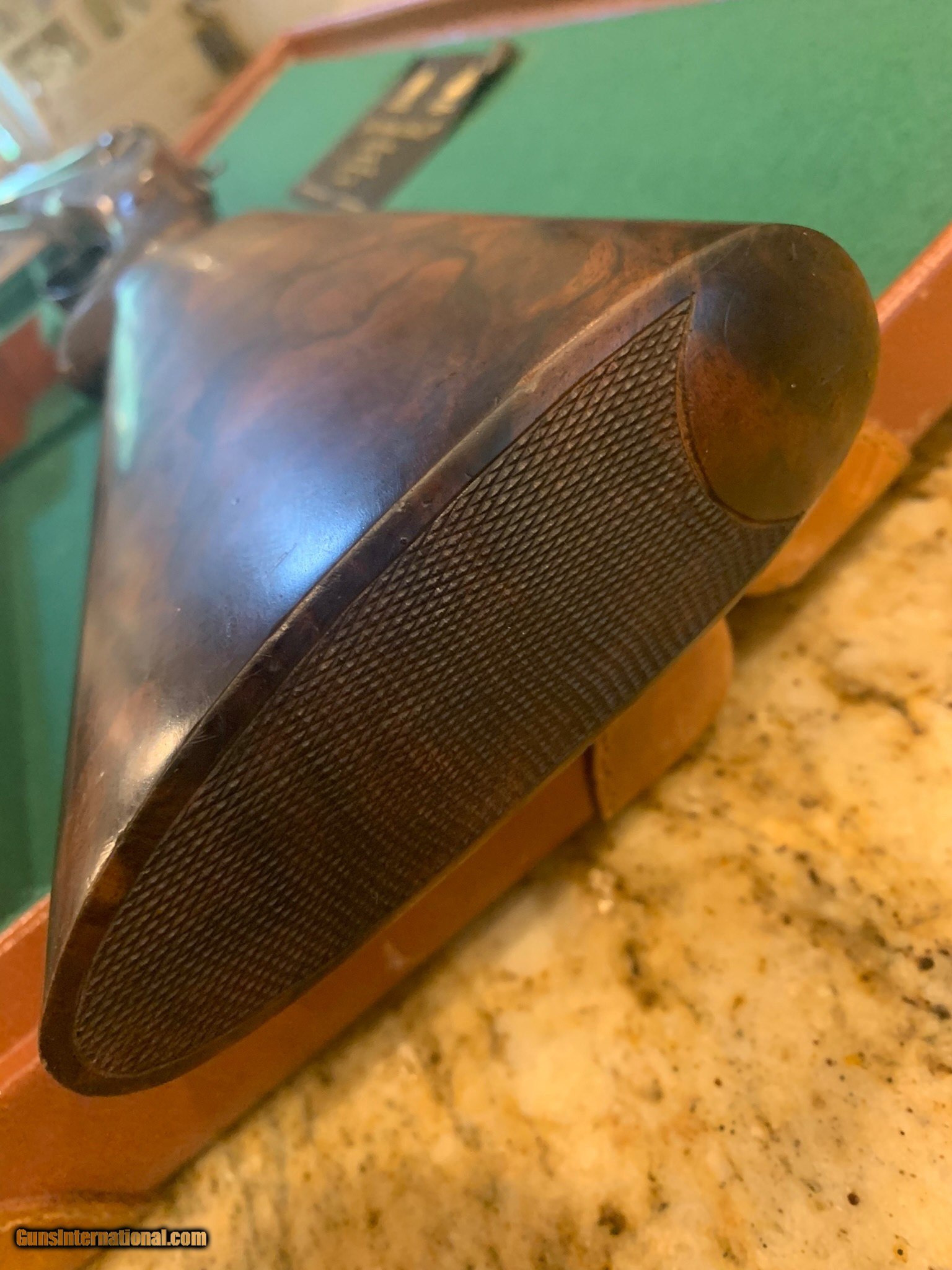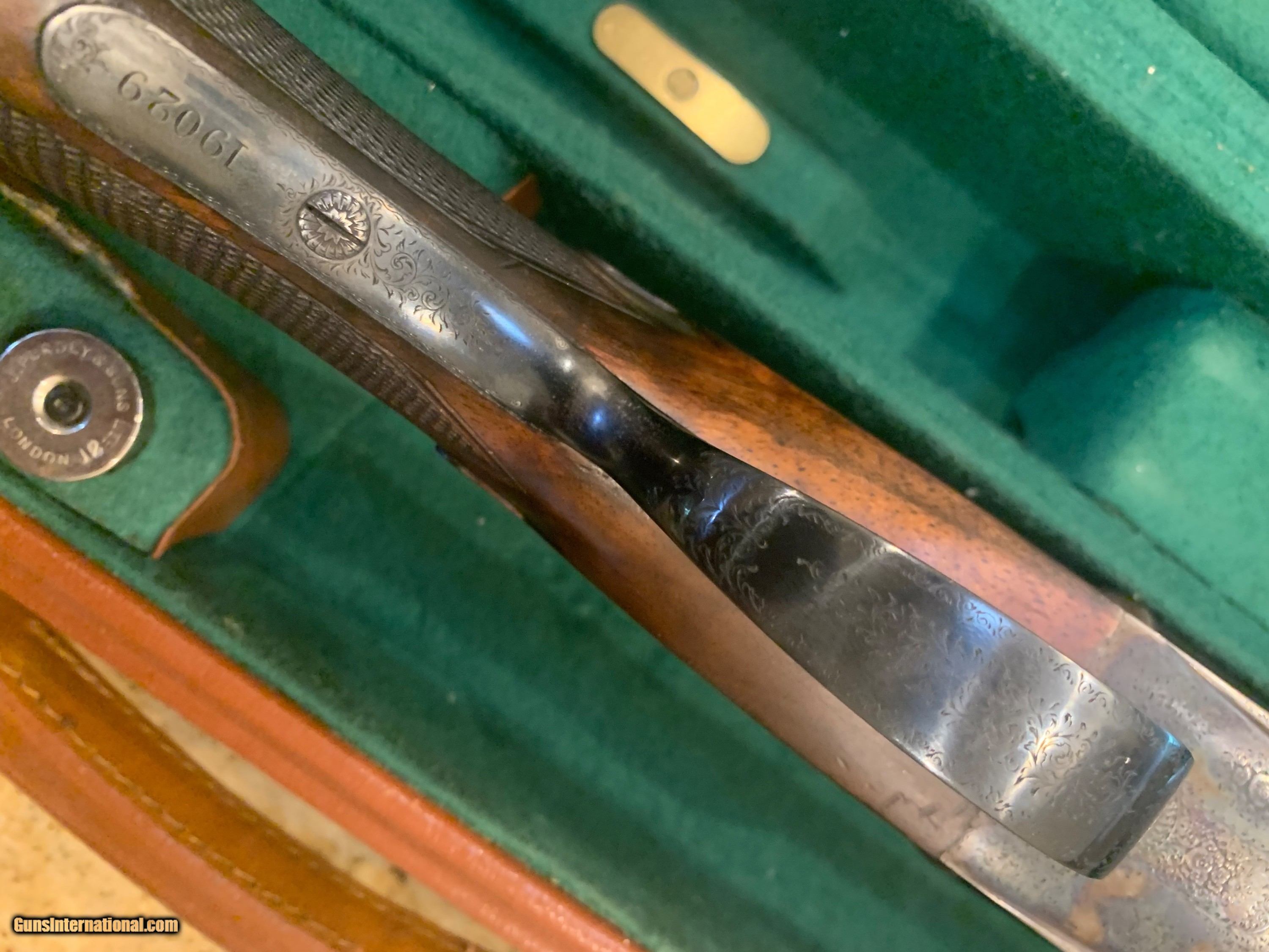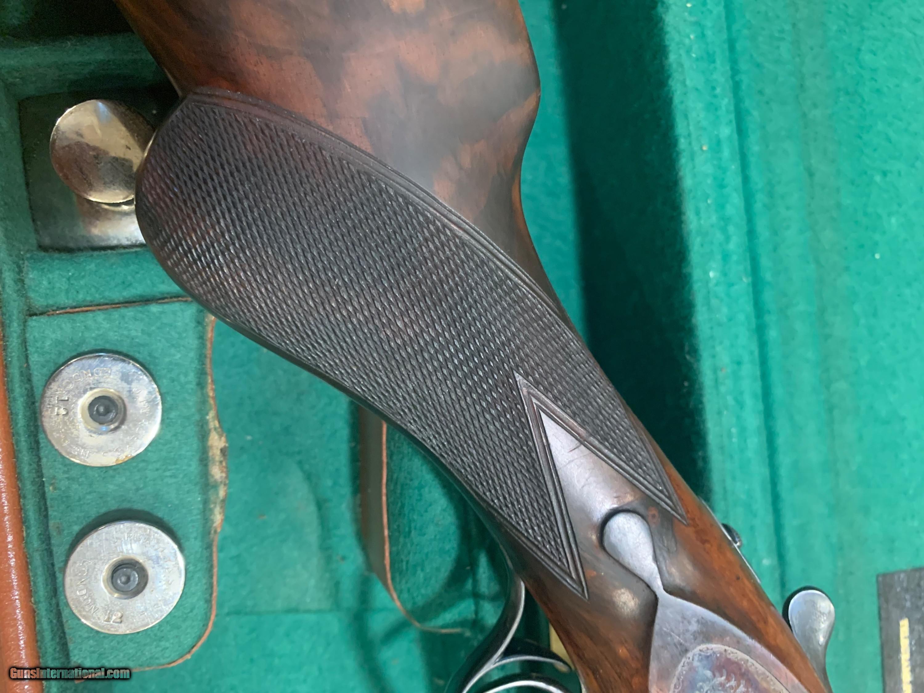 Description: Excellent in the case 12 gauge gun from 1907, 28" barrels choked IC and Mod, weighs 6 lb 4 oz., lop is 14.5", self opener, top of barrels- J Purdey and Sons. Audrey house. South AudleyStreet. London. Other barrel, Made of Sir Joseph Whiteorths Fluid Pressed Steel, nitro proofed 1 1/8, checkered butt, broken front bead, round knob, marble cake wood, stunning grain, bores are excellent, two triggers, ejectors, a wonderful very lightly used gun, some light handling marks, This gun was sent back to London in 2005 and was fully restored to be gifted as a retirement present. Certified funds shipped to an ffl only for actual cost. SOLD Shotgun Gauge: 12 Gauge |