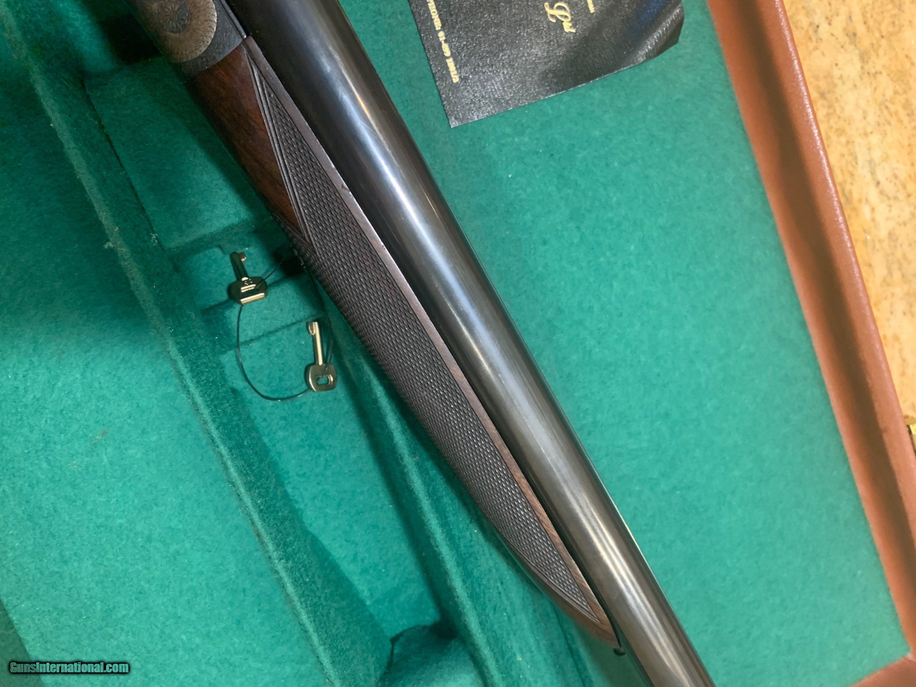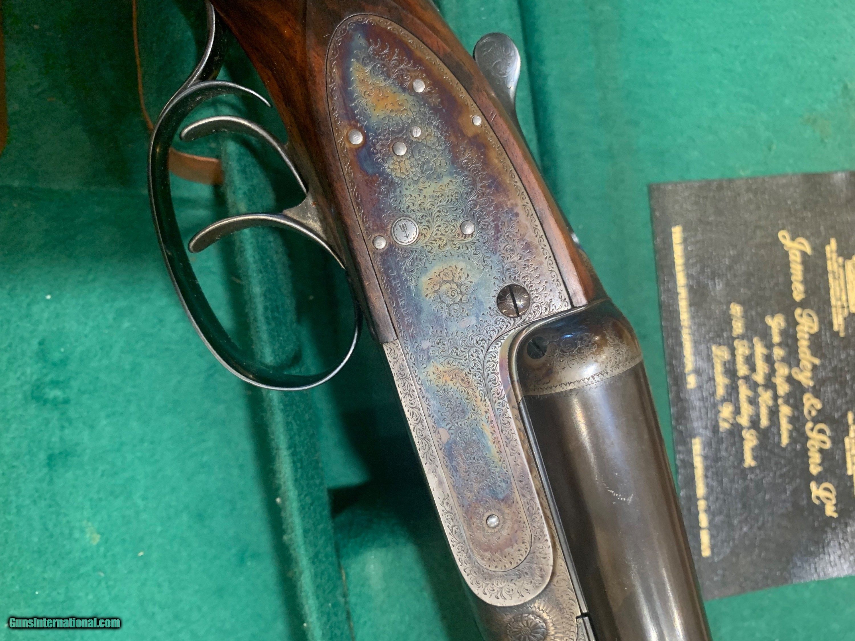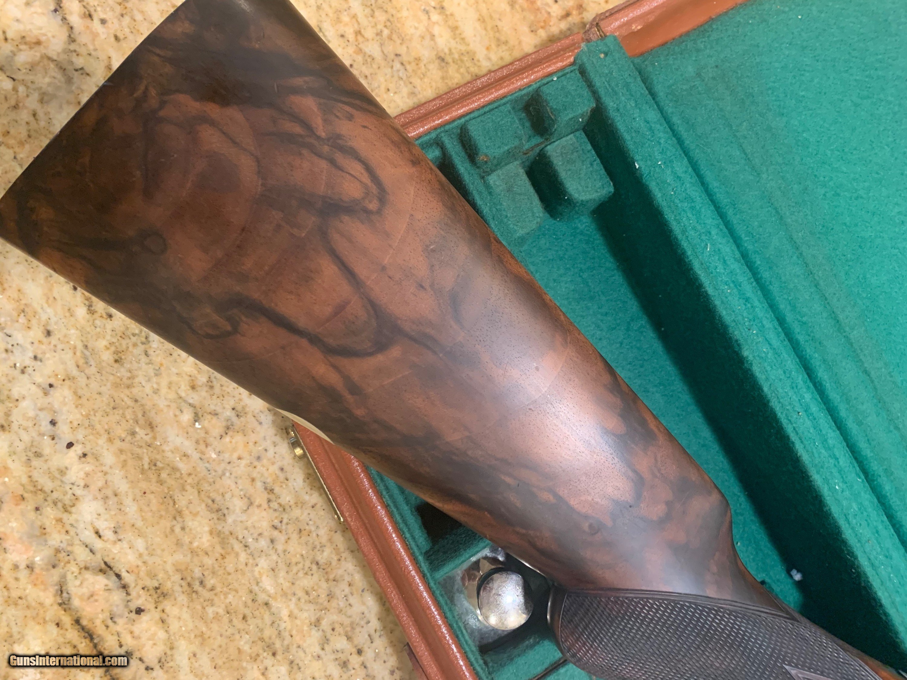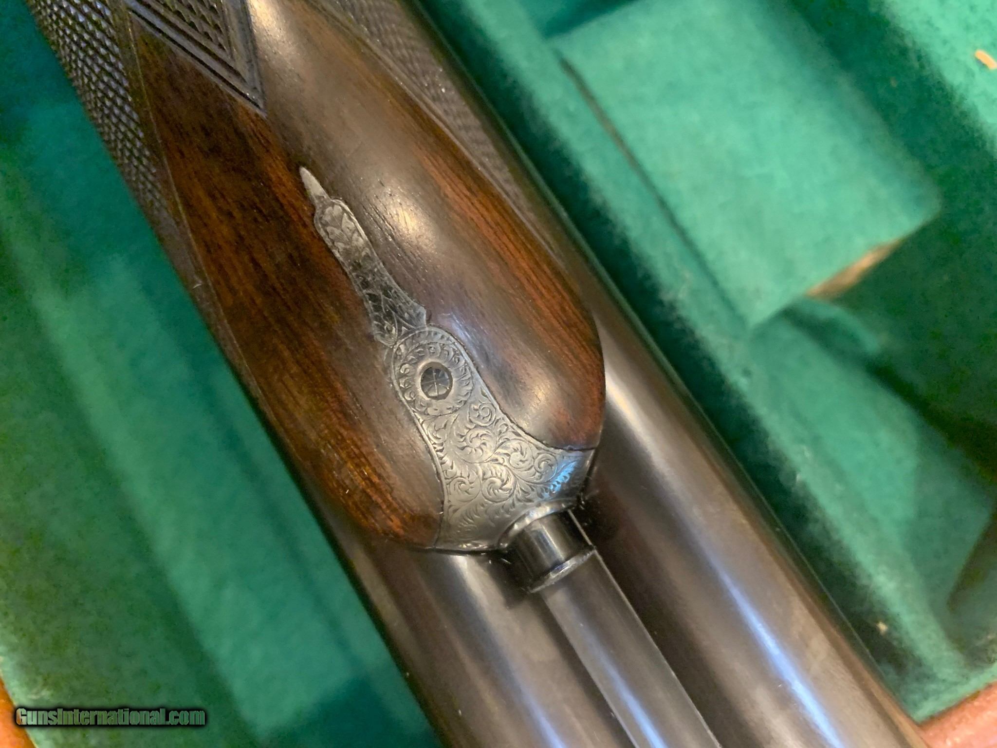 Description: Excellent in the case 12 gauge gun from 1907, 28" barrels choked IC and Mod, weighs 6 lb 4 oz., lop is 14.5", self opener, top of barrels- J Purdey and Sons. Audrey house. South AudleyStreet. London. Other barrel, Made of Sir Joseph Whiteorths Fluid Pressed Steel, nitro proofed 1 1/8, checkered butt, broken front bead, round knob, marble cake wood, stunning grain, bores are excellent, two triggers, ejectors, a wonderful very lightly used gun, some light handling marks, This gun was sent back to London in 2005 and was fully restored to be gifted as a retirement present. Certified funds shipped to an ffl only for actual cost. SOLD Shotgun Gauge: 12 Gauge |