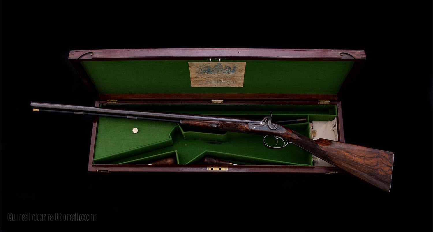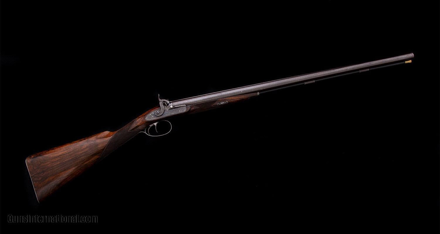 Description: J. Purdey & Sons - Damascus Hammergun - 14 ga - Item Number: PUR3898 Shotgun type: Hammer SxS Action: Hammer Ejectors: No Trigger: Double Grip: Straight Grip Forend: Checkered Lop: 14 1/4 " Pad thickness: " Type of butt: Metal Drop comb: 1 5/8 " Drop heel: 2 5/8 " Cast amount: 0 " Weight: 6 lbs, 14 oz Manufactured in: England Manufacture Year: 1844 Finish: Case Colored Overall condition: Very Good Stock condition: Very Good Metal condition: Very Good Stock: Refinished Metal: Refinished Type of Case: Wood Luggage Case Extra barrels: 0 Barrel info: Gauge: 14 ga Chamber: NA " Length: 29 " Chokes: Cyl/Cyl Rib type: Concave Comments : Solid gun in very good condition with some light handling marks. SG-130 B2 SOLD Antique: Yes Shotgun Gauge: 14 Gauge |