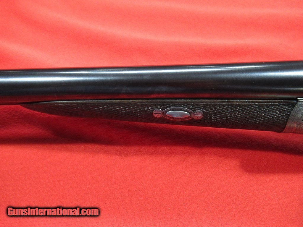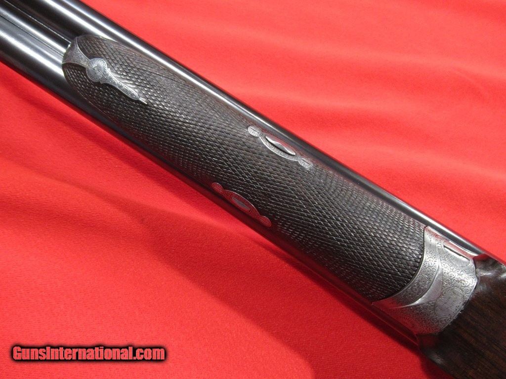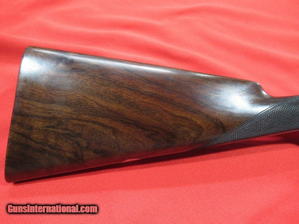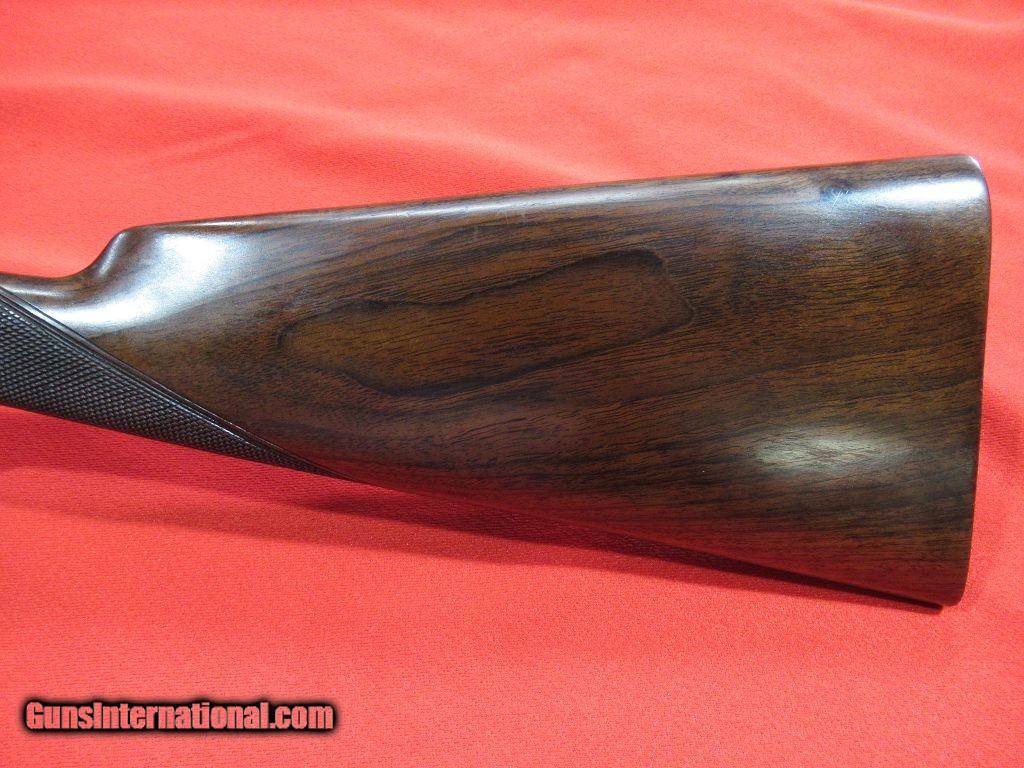 Description: Purdey thumbhole hammer gun with steel barrels. 2 1/2" chambers with barrels choked 005"/.009". This would make a great vintage double for clays. Straight grip stock with model dimensions (1 3/8" x 1 5/8" x 14 1/4" over checkered butt). 6lbs 15oz. This is a beautiful little gun. SOLD |