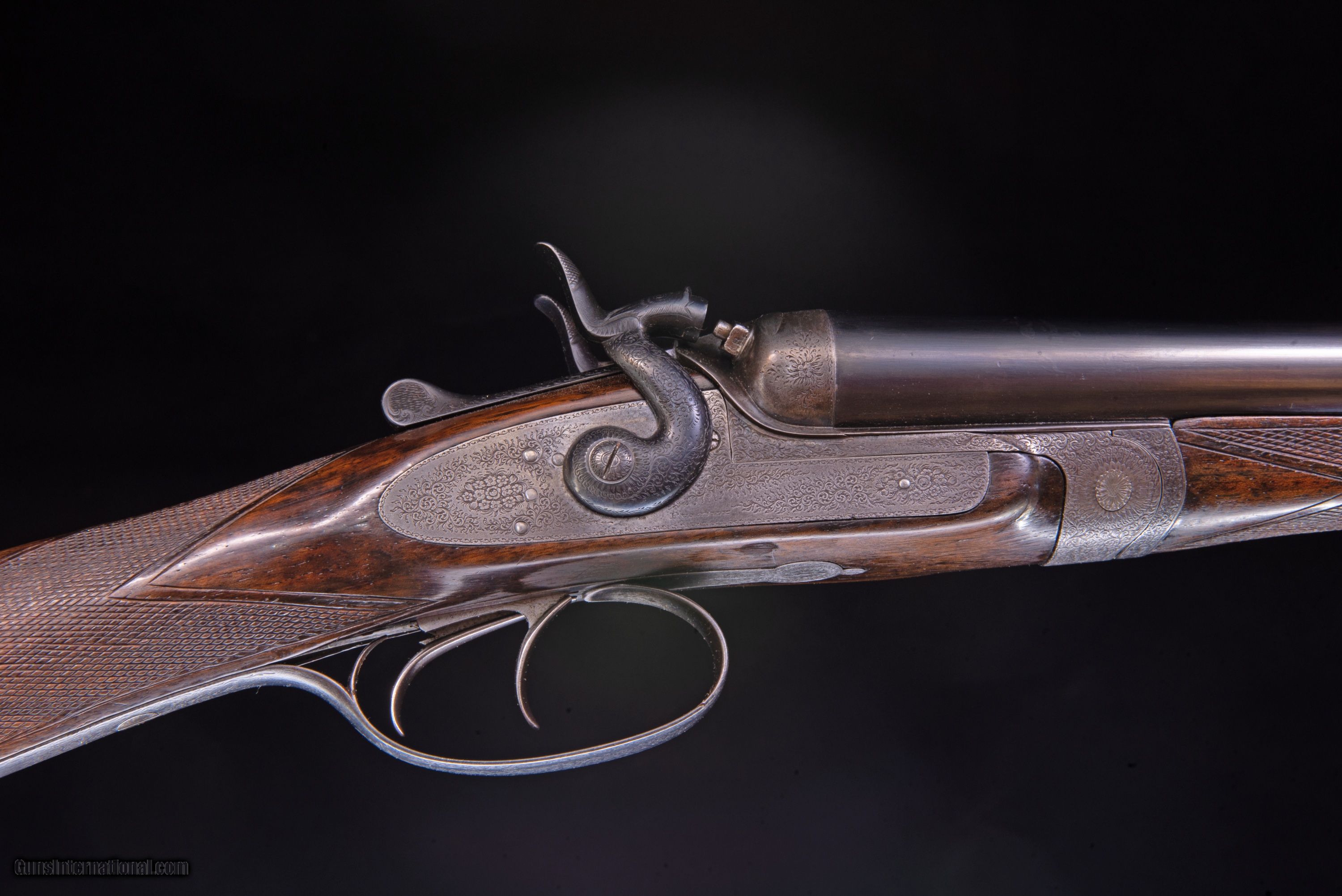Description: Hammerguns - James Purdey 20g. Bar-in-wood hammer double. This gun is as the Brit’s say “ rare as rocking horse shit†and for many the mecca of fine English hammer guns and in 20g! Steel 28†mono-blocked barrels in excellent condition and in current 2 ½â€ nitro proof. Chokes are Full left and Mod right. The stock dimensions are very modern and will fit many. LOP with a new leather covered best pad installed would be up to 14 ¾â€. Weighted between the hands and weighing in at only 5 lbs. 5 ounces this petite Purdey handles exactly as you would expect, like a magic wand. Purdey records show: No. 9904 Completed: 1877 For: D. Cooper Description: A toplever sidelock bar-in-wood hammer gun Weight: 5lb. 9 ½oz. Calibre: 20-bore Barrels: 30 ½in. Damascus Choke: 145 pellets in each from 7/8oz. of shot Stock: 14 3/8 1/16in. Notes: Stocked with no cast Later noted the gun passed to Thomas Craven *Keep in mind if we install a leather covered recoil pad the LOP could be up to 14 3/4." > *** Note: To see this gun with high resolution photos and a zoom-in feature, go to the vintagedoubles main site and search for the gun ID: 4657 or browse the main site to see our full gun collection. |