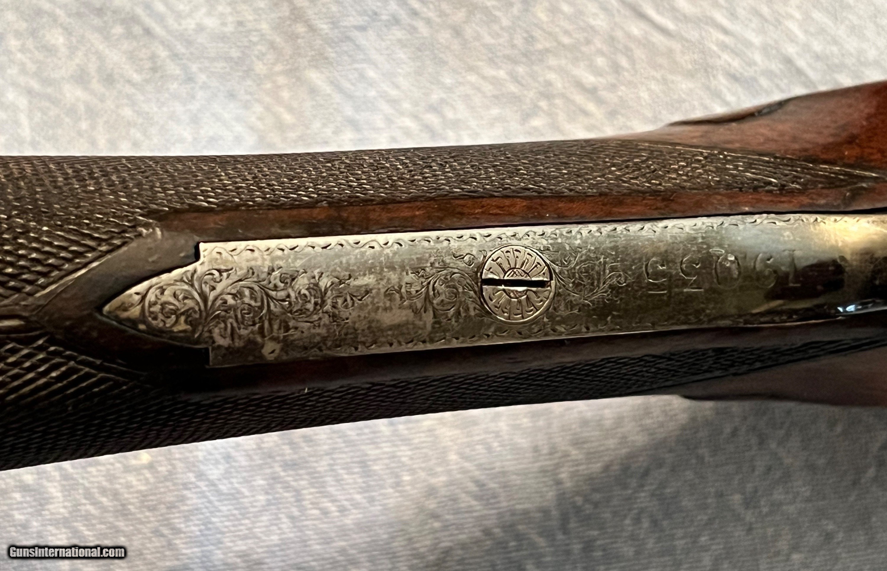 Description: James Purdey Best self opening sidelock ejector 10 bore game gun Rounded bar action 31" chopperlump barrels 2 5/8 1 5/8oz nitro proof Bores: .777/.777 proofed at .774/.774 Chokes: .038/.038 IM/IM Minimum wall thickness: .031/.035 LOP 14 1/2 DAC 1 1/2 DAH 2 3/8 Cast off 1/8" 7lbs 10oz Built in 1907 for WG Jameson (Jameson distilling family) In 1908 Purdey converted the original pistol grip to a straight grip and added the leather covered recoil pad. Beautifull original condition Purdey 10 bore that was built as #1 gun of a pair of lightweight 10 bore grouse guns. Used as a spare to the #2 gun for wildfowl in the north east United States most of its life which explains why it is in very good/excellent condition. Very few best quality 10 bore self quality purdeys were built and even fewer with a rounded action bar. SOLD Curio/Relic: Yes Shotgun Gauge: 10 Gauge |