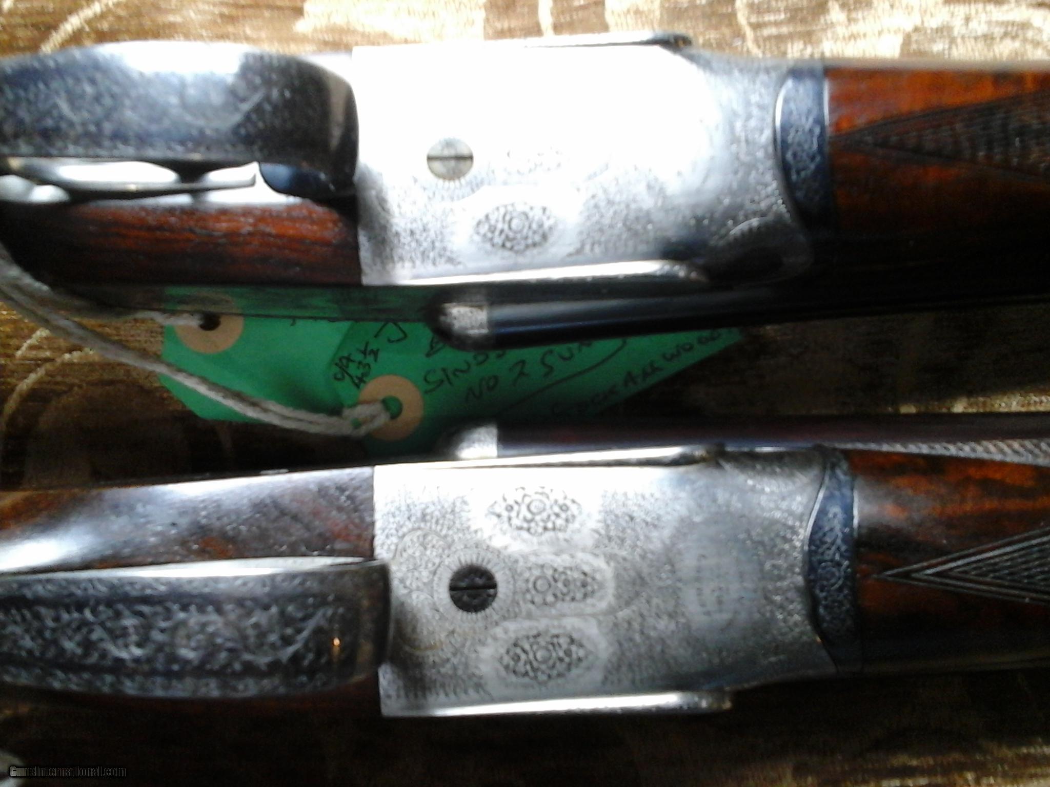 Description: Superb pair of Purdey,lightweight game guns.The pair rebarreled,restocked and recased by Purdey in 1982.Very little used since then ,all measurements as new..Several other pairs of British guns in stock,please tel Victor for details ..ON 815 277 6435.Please tel for bargain price SOLD Manufacturer: James Purdey & sons Model: pair of best quality self opening sidelock ejectors Serial Number: 21921 and 21922 Caliber Info: 12ga Bore: 729/730 Chambers: 21/2 Ejectors: yes Condition: superb Metal Condition: excellent Wood Condition: excellent Bore Condition: excellent Barrels: 27 Barrel Type: chopper lump Action: sidelock Triggers: 2 Stock: 141/2" to ck butt Stock Cast: r/h Fore End: splinter Butt Pad: none LOP: 141/2 Rib: concave Weight: 6lbs7oz Sights: bead Manufacture Date: 1921 Choke Left: imp/mod Choke Right: imp Engraving: best fine scroll Case: makers case Item Location: indiana Proof:Nitro: yes Minimum Wall Thickness Left: .027 Minimum Wall Thickness Right: .027 |