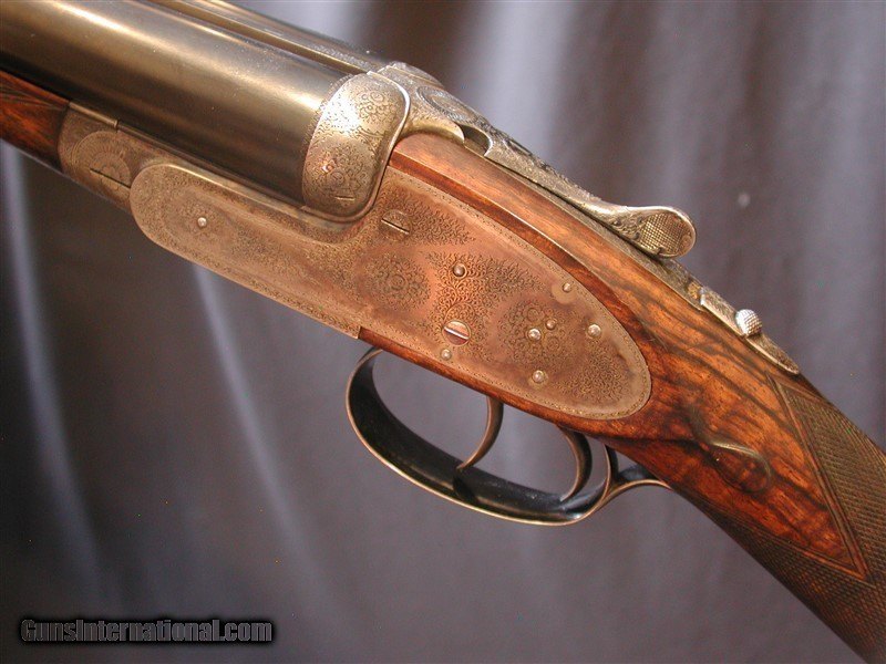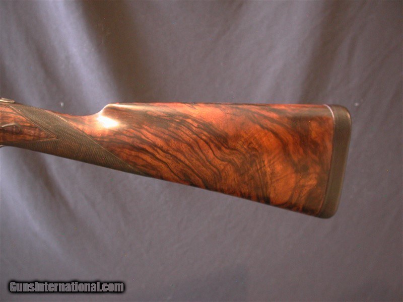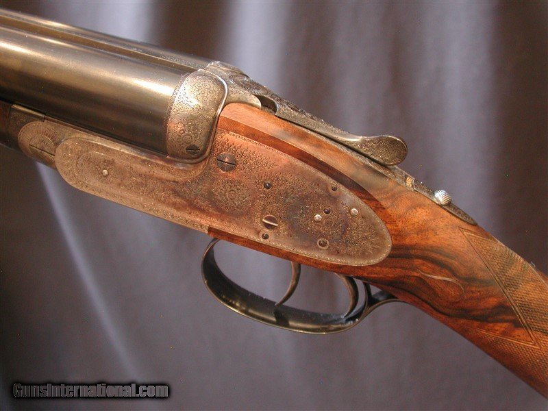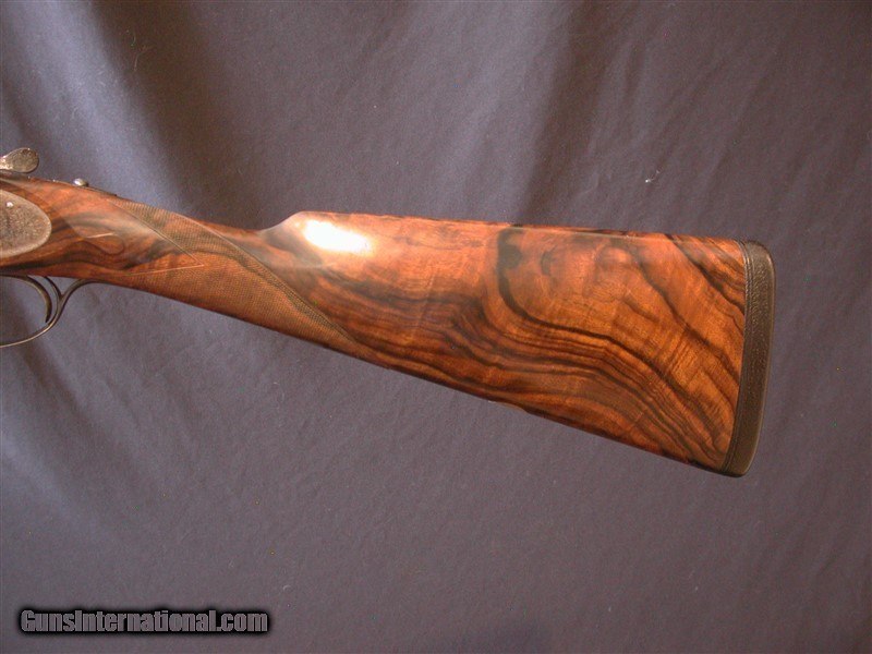 Description: SLE's. Gun #1 - 2 1/2", 29", chopper lump, choked IC/Full. 15 1/8" highly figured wood to leather covered pad. Silky smooth self opening Beesley action - retains moderate to strong original case colors. Engraving remains sharp throughout. 6lbs 9oz. Gun #2 - 2 1/2", 29", chopper lump, choked IC/Full. 15 1/8" highly figured wood to leather covered pad. Actions are a perfect match in terms of condition - outstanding. 6lbs 11oz. Housed in their original case with makers label and a full ensemble of accoutrements - call for details. This pair of shotguns was purportedly made for a Mr. William Alton Jones, president of CITGO oil & gas conglomerate. William Alton Jones owned a 2000+ acre hunting preserve in Rhode Island where he vacationed and entertained his close friend D. Eisenhower and many other dignitaries. The Jones property was given to the University of Rhode Island upon his untimely death in a plane crash. Today it is the Alton Jones Campus and wildlife research center. This fine pair has made their way back and forth across the pond many times to shoot at esteemed estates scattered across the countryside. Consider acquiring this fine pair and continuing the tradition. SOLD |
