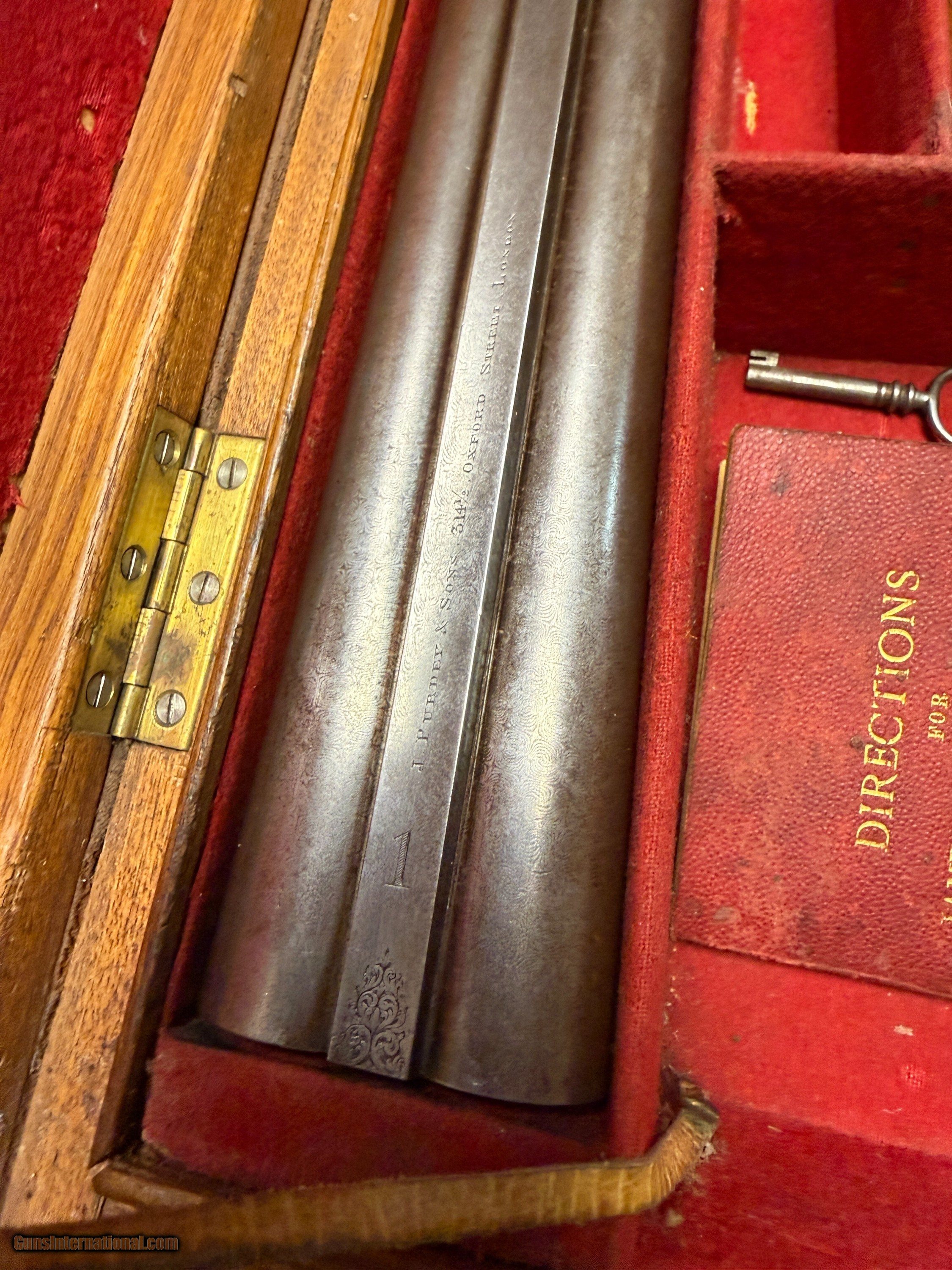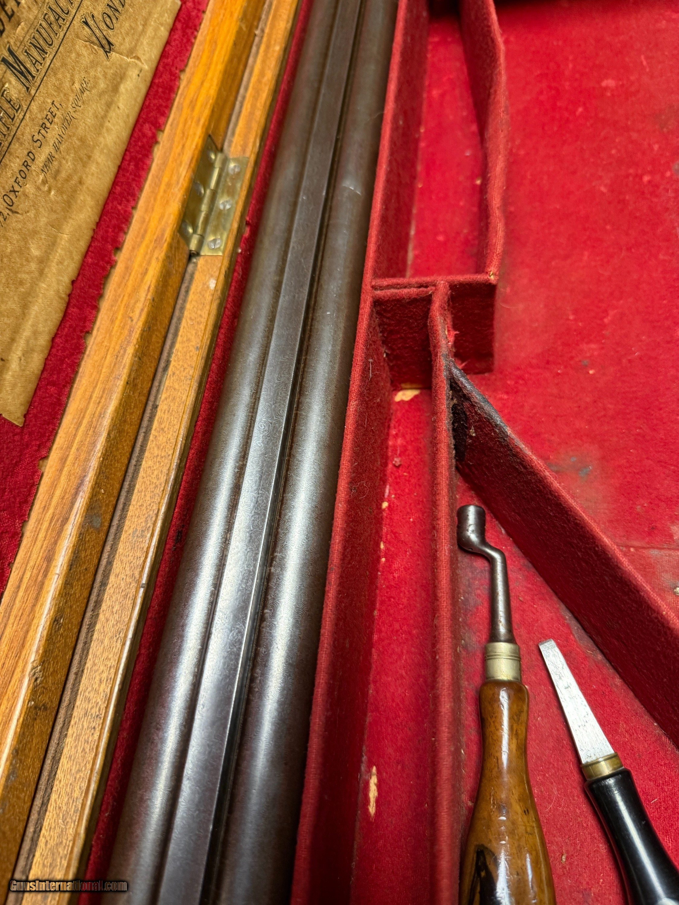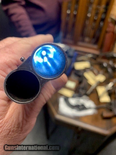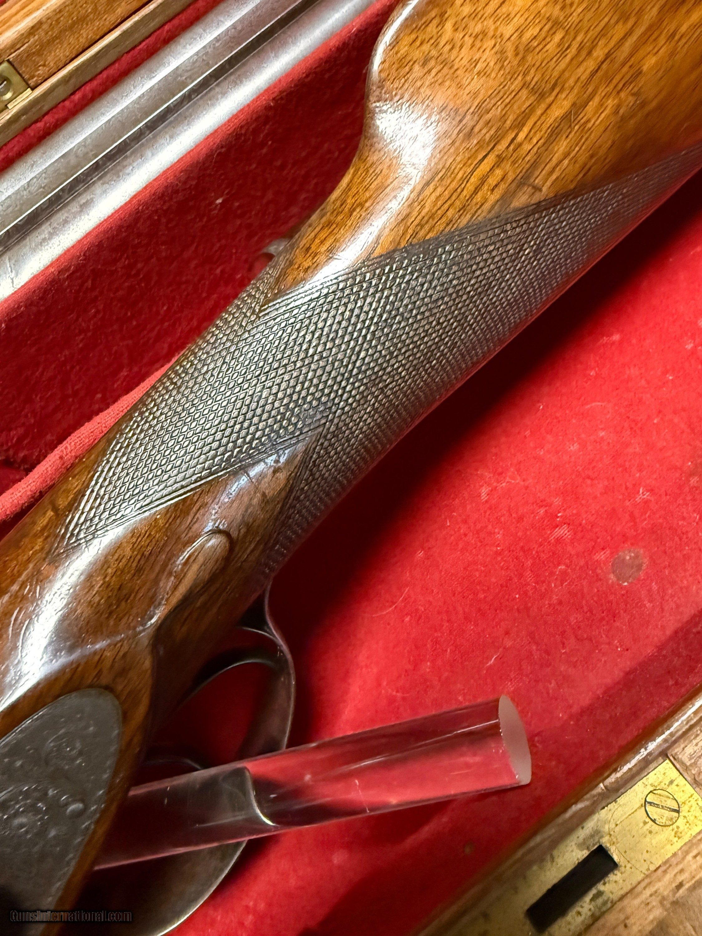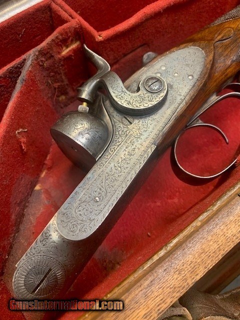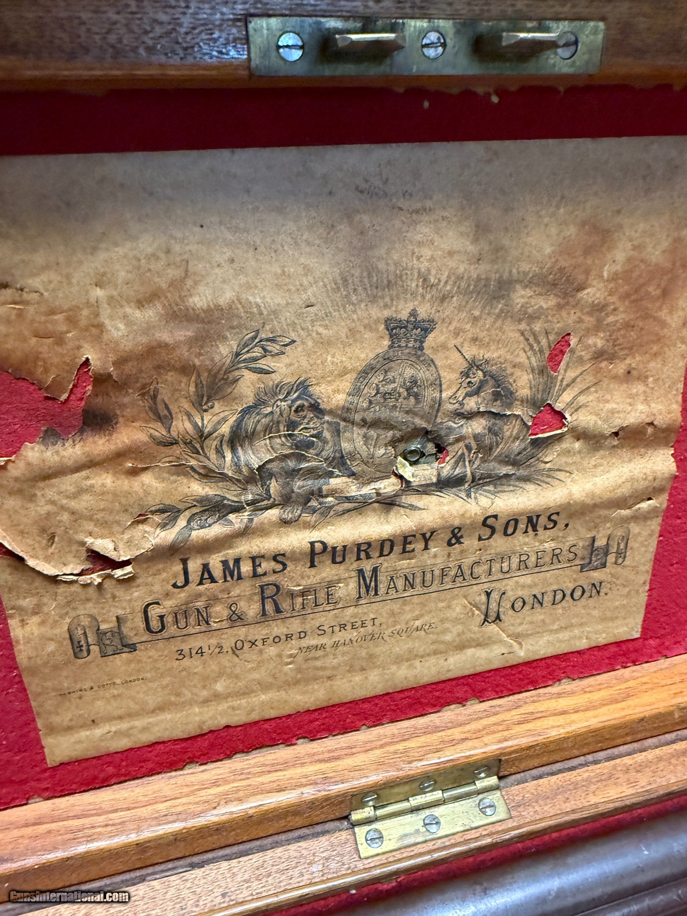 Description: JAMES PURDEY & SONS - 12-BORE HAMMER SHOTCUN with CASE Extremely Rare – original condition, 12 bore, 2-3/4” case, completed in 1878, top-lever bar-in-iron hammer pigeon gun, smooth case-hardened percussion fences, beautifully engraved side plates signed 'J. PURDEY & SONS', engraved trigger guard, retaining approx. 50% of color-hardening and finish. Trigger guard is also beautifully engraved, shows serial no. 10,358. All screws in good condition. Considering its age – its really nice. Damascus barrels with one small dent on each barrel (see pics), the rib is engraved “PURDEY & SONS 314 1/2 OXFORD STREET. LONDON”, barrels retain about 60-70 of original finish. Well-figured straight-grip stock with period-correct (Possibly the original) leather butt pad and what appears to be a gold inlaid disc or “medallion”. The fore-end wood and engraved metal are also in good condition with one very small chip in wood along edge. Fore-end has cross-pin / wedge release. Gun weight is reported (source Purdey) to be 7lb. 4oz. The case appears to be the gun’s original leather-covered wood case. It comes with original key, a turn screw, a firing pin wrench, two-barrel corks, misc. parts, and Directions booklet. The original James Purdey & Sons label is on the inside of case lid along with Charges label. Gun and gun case appear 100% original with no signs of structural damage. I have not test-fired but appears to function properly. I have attempted to provide sufficient photos to evaluate the condition but provide more upon request. Letter and Gun information is provided by Purdey of London. Firearm will only be shipped to an FFL, via Fed X and insured for 1.25 x purchase price. All shipping and handling costs will be added to purchase price. If paying with credit card add 4% to total purchase price. Contact me for additional photos. Steve (817) 205-6032 or stevemccunecompanies Provenance (Letter): Purdey has provided us with the following information (letter): Completed: 1878 For: E.D. Hunter Description: A top-lever bar-in-iron hammer pigeon gun Weight: 7 lb. 4 oz. Caliber: 12-bore (2-3/4” case) Barrels: 31 in. Choke: Both “Choke” Stock Length: 15 in. LOP: 14-1/8” Serial No.: 10358 Shotgun Gauge: 12 Gauge Price: $12,500.00 Shipping: $125.00 Contact Seller |
