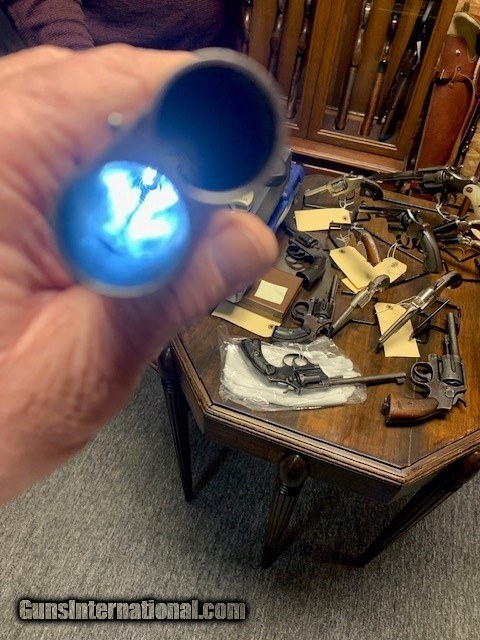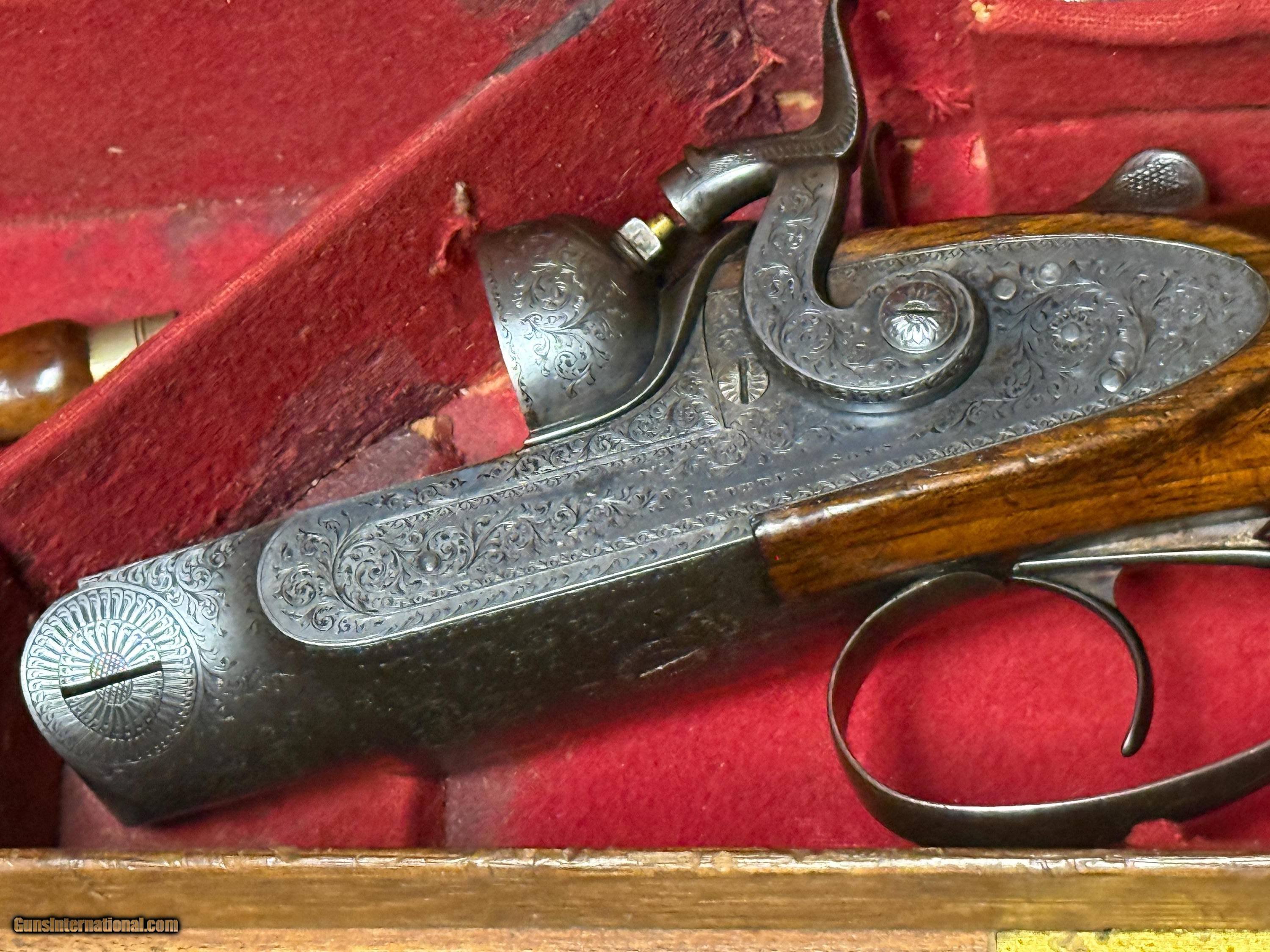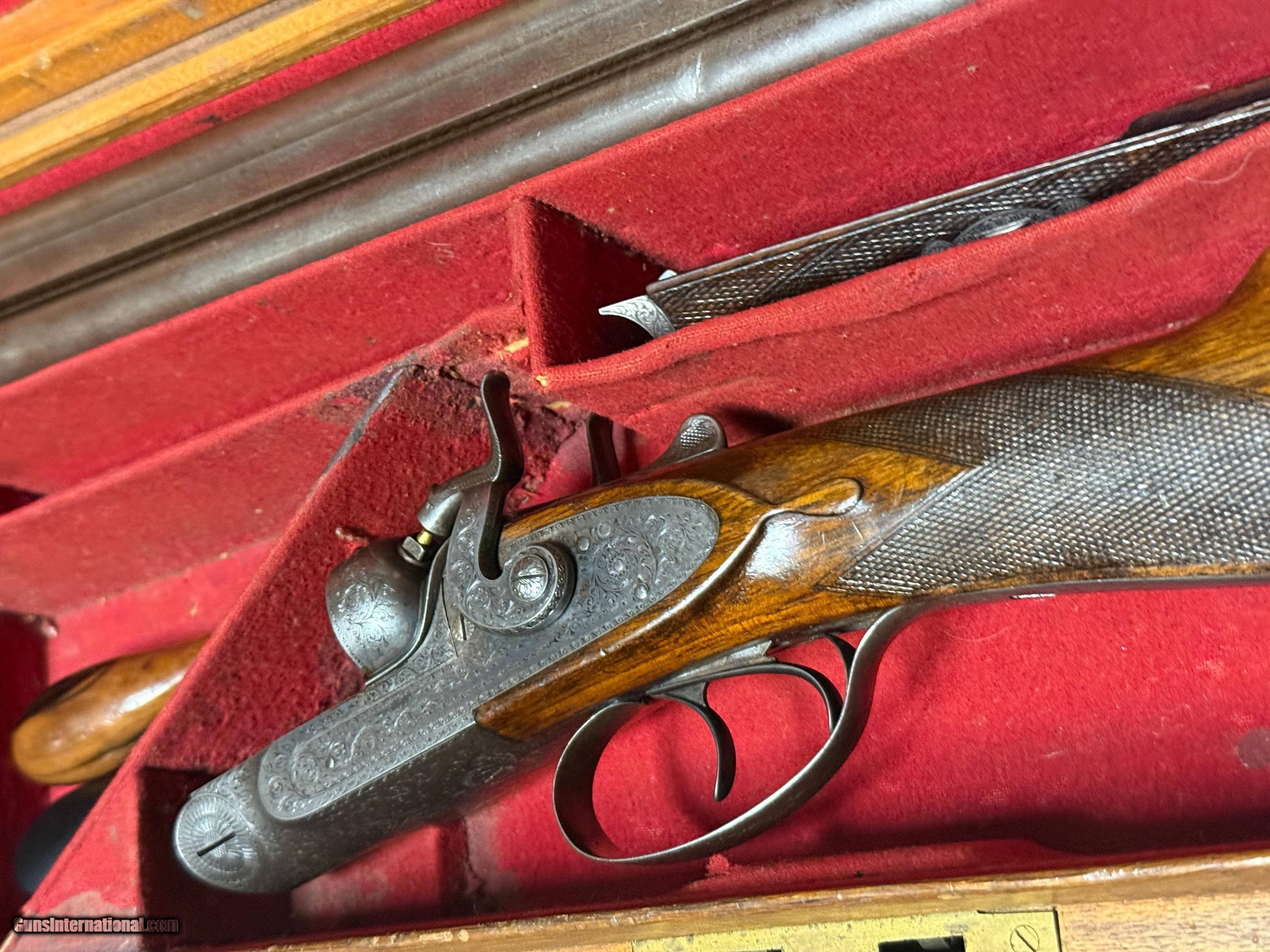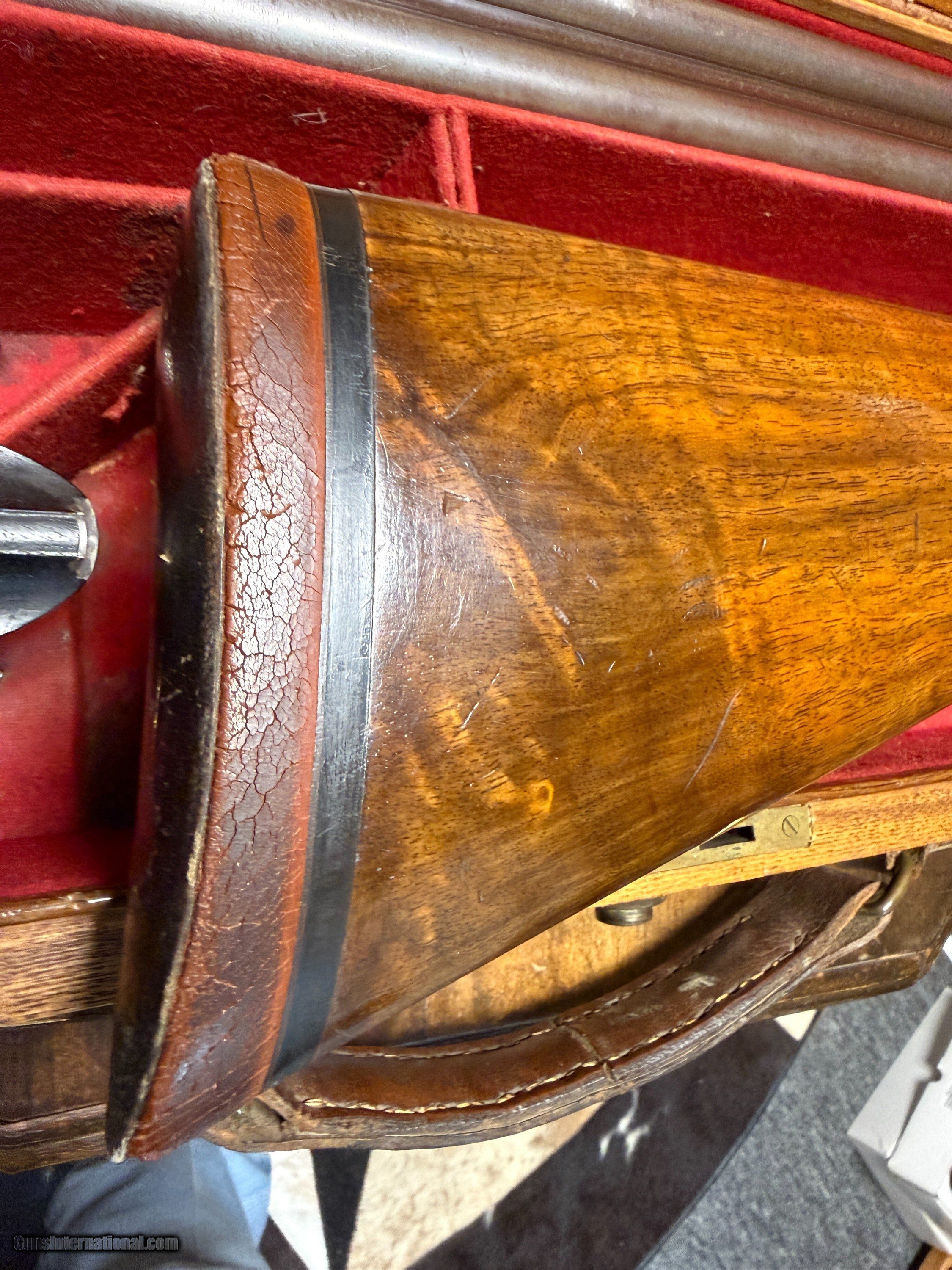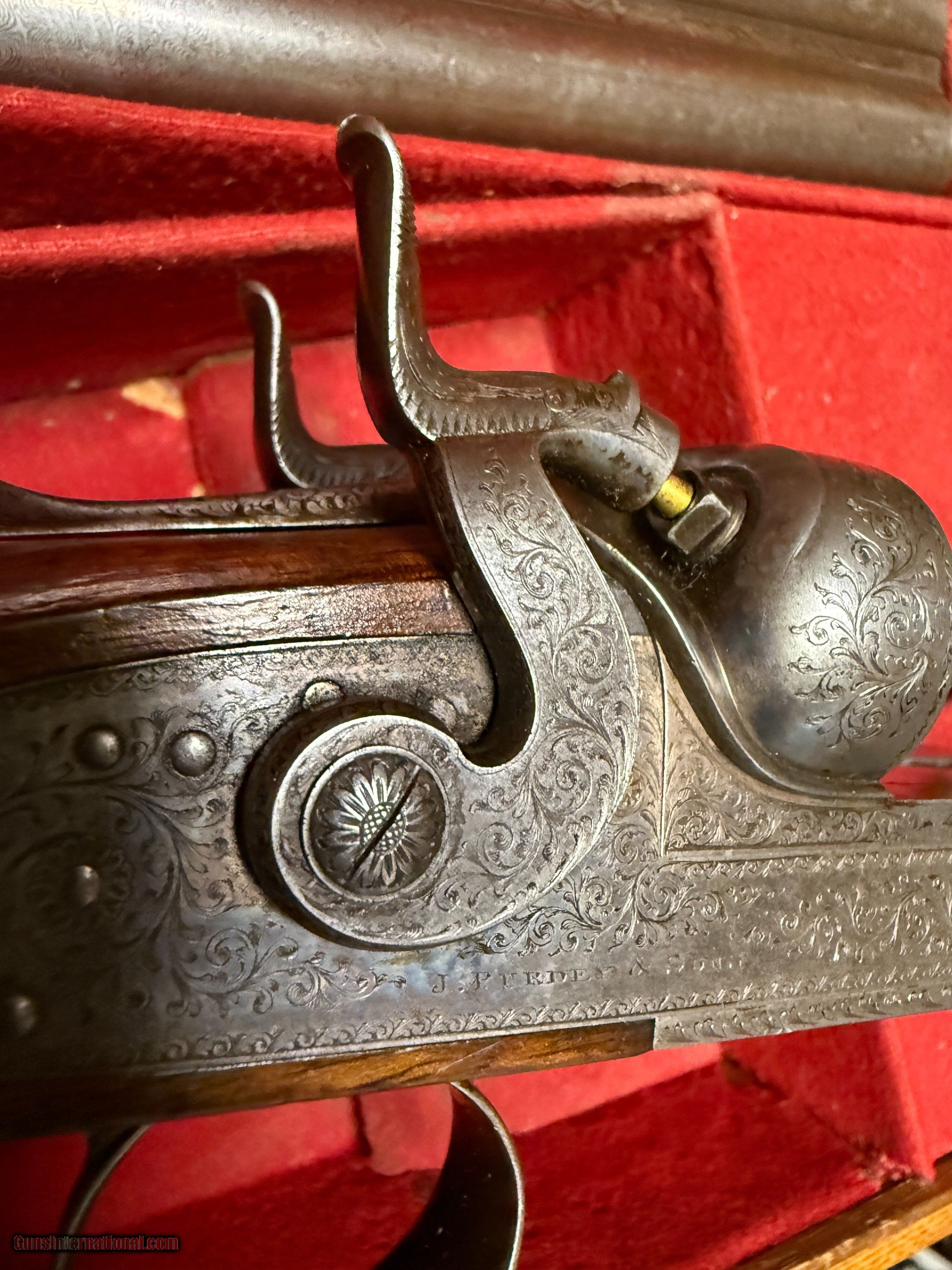Description: JAMES PURDEY & SONS - 12-BORE HAMMER SHOTCUN with CASE Extremely Rare – original condition, 12 bore, 2-3/4” case, completed in 1878, top-lever bar-in-iron hammer pigeon gun, smooth case-hardened percussion fences, beautifully engraved side plates signed 'J. PURDEY & SONS', engraved trigger guard, retaining approx. 50% of color-hardening and finish. Trigger guard is also beautifully engraved, shows serial no. 10,358. All screws in good condition. Considering its age – its really nice. Damascus barrels with one small dent on each barrel (see pics), the rib is engraved “PURDEY & SONS 314 1/2 OXFORD STREET. LONDON”, barrels retain about 60-70 of original finish. Well-figured straight-grip stock with period-correct (Possibly the original) leather butt pad and what appears to be a gold inlaid disc or “medallion”. The fore-end wood and engraved metal are also in good condition with one very small chip in wood along edge. Fore-end has cross-pin / wedge release. Gun weight is reported (source Purdey) to be 7lb. 4oz. The case appears to be the gun’s original leather-covered wood case. It comes with original key, a turn screw, a firing pin wrench, two-barrel corks, misc. parts, and Directions booklet. The original James Purdey & Sons label is on the inside of case lid along with Charges label. Gun and gun case appear 100% original with no signs of structural damage. I have not test-fired but appears to function properly. I have attempted to provide sufficient photos to evaluate the condition but provide more upon request. Letter and Gun information is provided by Purdey of London. Firearm will only be shipped to an FFL, via Fed X and insured for 1.25 x purchase price. All shipping and handling costs will be added to purchase price. If paying with credit card add 4% to total purchase price. Contact me for additional photos. Steve (817) 205-6032 or stevemccunecompanies Provenance (Letter): Purdey has provided us with the following information (letter): Completed: 1878 For: E.D. Hunter Description: A top-lever bar-in-iron hammer pigeon gun Weight: 7 lb. 4 oz. Caliber: 12-bore (2-3/4” case) Barrels: 31 in. Choke: Both “Choke” Stock Length: 15 in. LOP: 14-1/8” Serial No.: 10358 Shotgun Gauge: 12 Gauge Price: $12,500.00 Shipping: $125.00 Contact Seller |