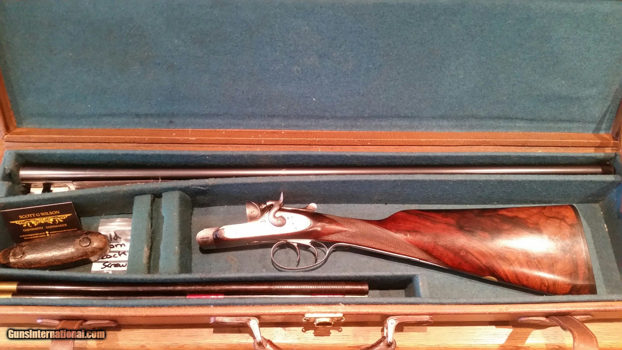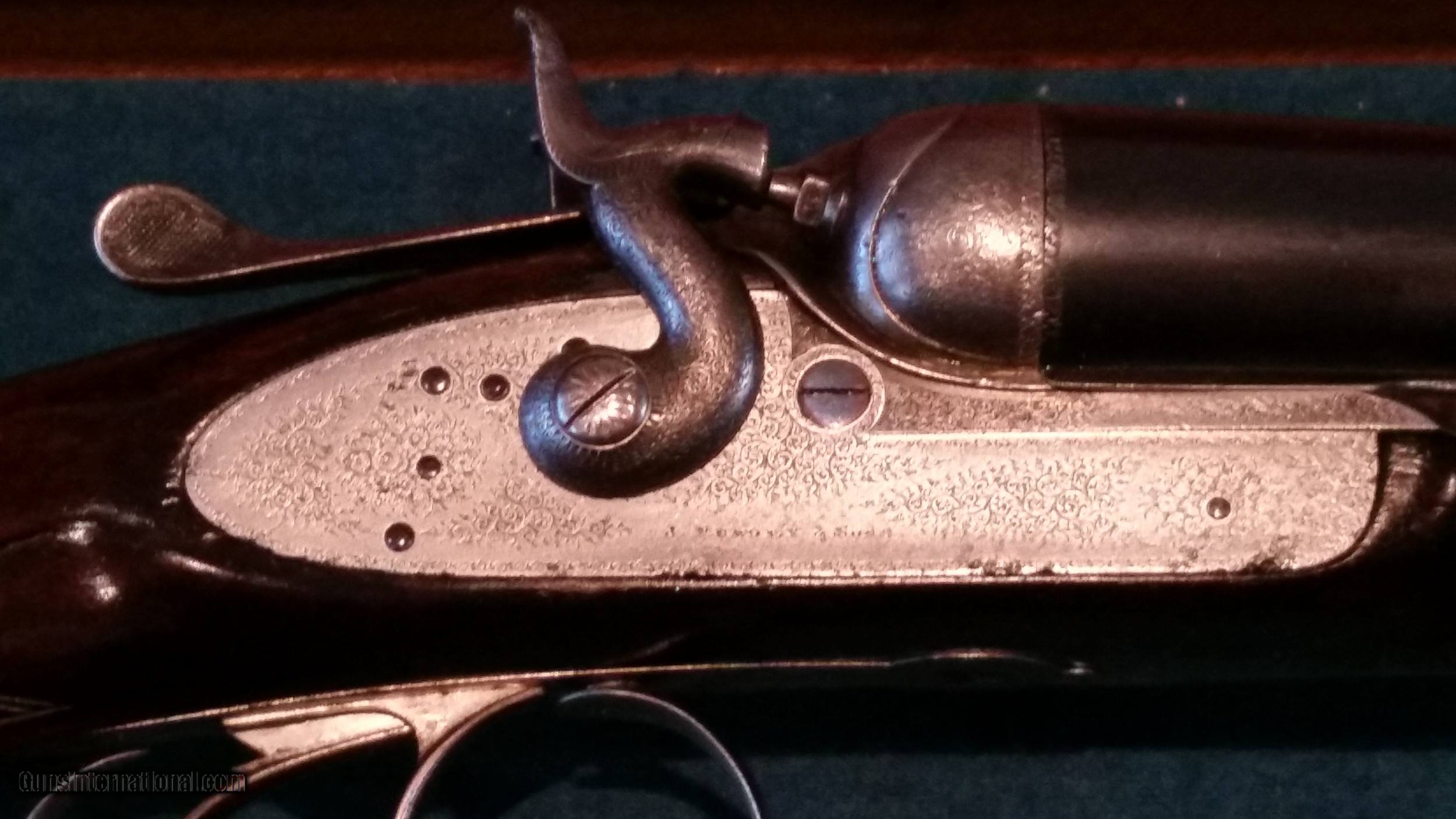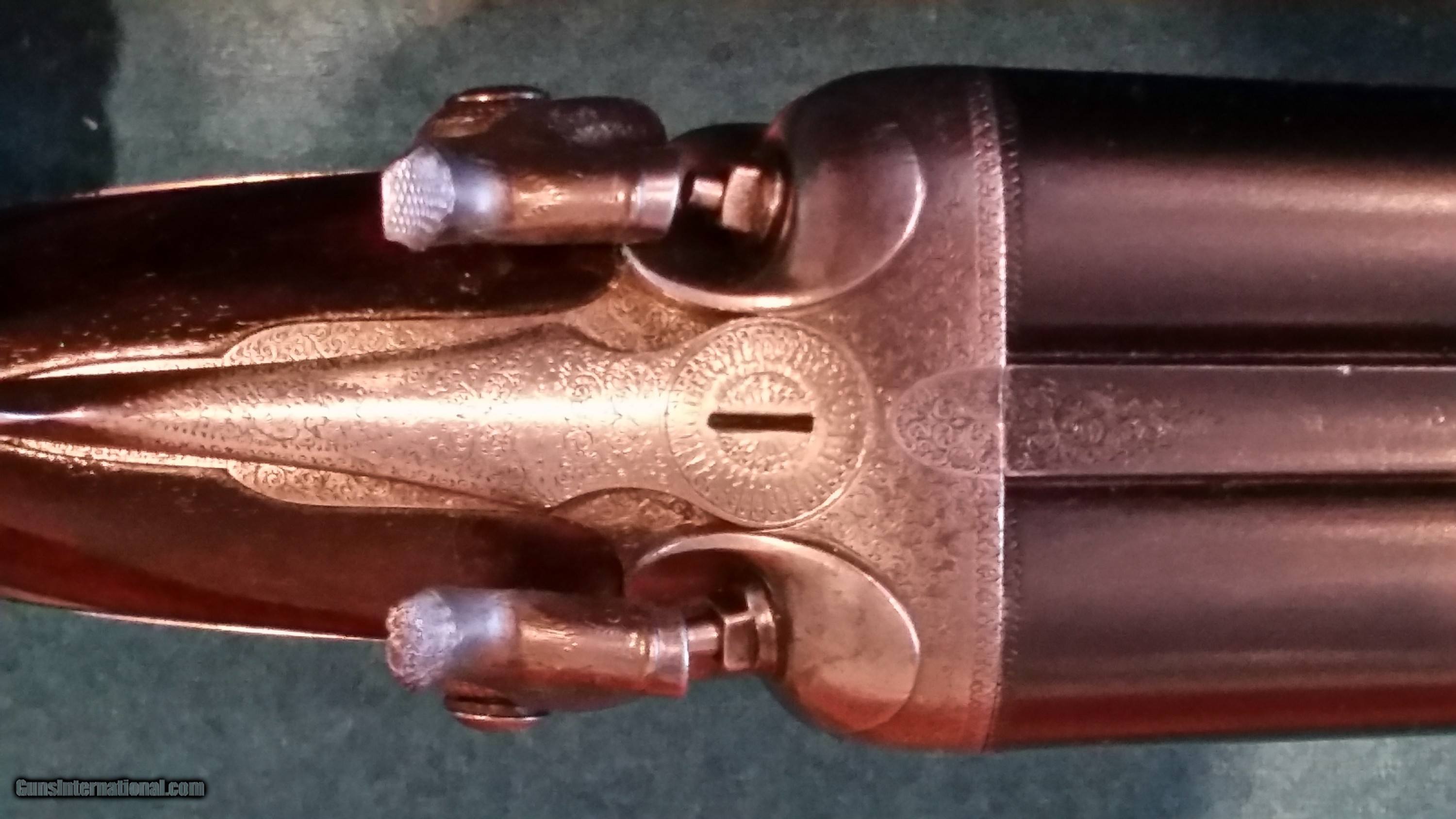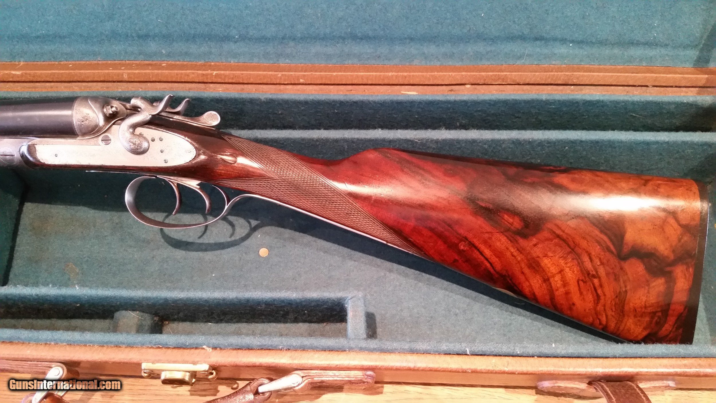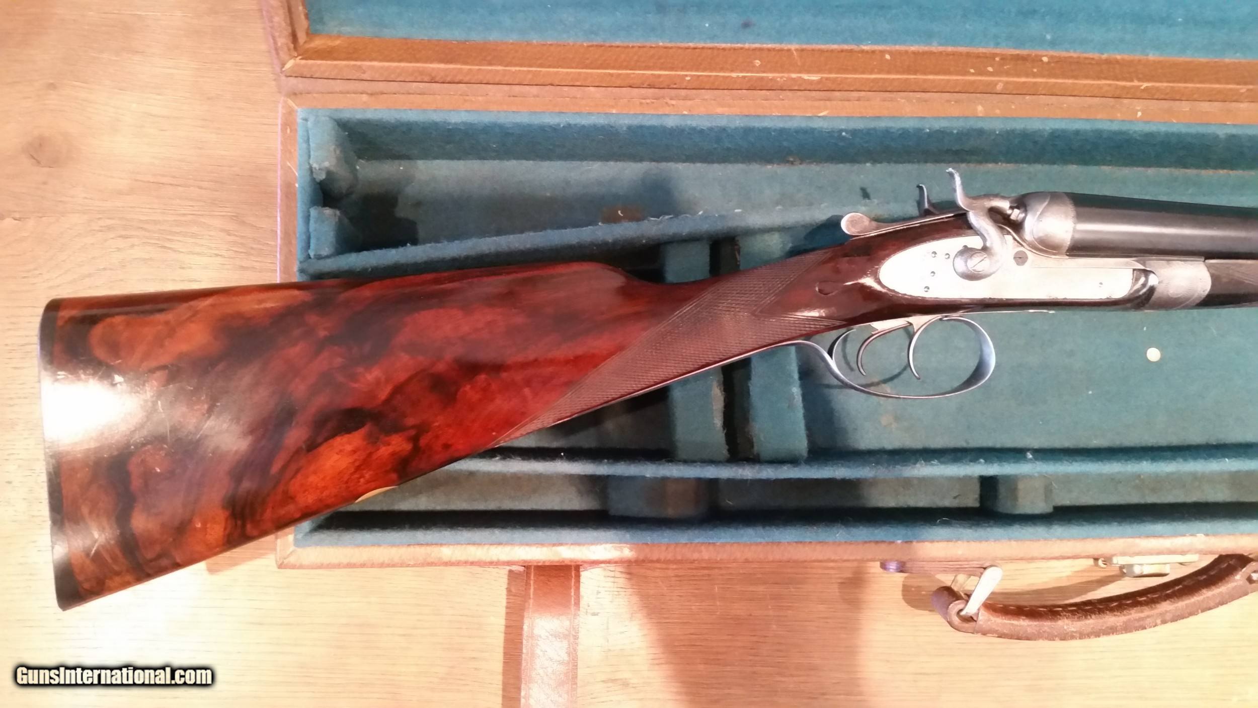 Description: Offers. Traditional upland wildfowling at its finest. This is a fully functional, in-proof, recently serviced antique masterpiece by one of the world’s best shotgun makers. James Purdey & Sons has confirmed that this 12 gauge toplever bar-in-wood hammergun (serial number 122xx) was manufactured in 1885 during the height of James Purdey the Younger’s supervision and innovations for the company. Terry Weiland, author of the reference “Vintage British Shotguns,” states that “James Purdey is the pre-eminent name in the British gun trade, regardless of claims (however legitimate and justified they may be) of other firms. In the public mind, whether they know anything about guns or not, a Purdey is simply the best – and not just the best in the United Kingdom, but the best in the world.” Noted British gun specialist Jack Rowe rates Purdeys as follows: “What can one say? On a par with Holland & Holland. Everyone knows the history. Best hammer guns. Best sidelocks. The best there is.” Expert George Caswell agrees and describes their “quality is always superb…and command a premium of 40 to 50 percent.” And renowned British gun expert Geoffrey Boothroyd confirms that “Purdey retain(s) their place in the forefront of British gunmakers.” What makes Purdey’s pedigree even more extraordinary is the fact that all shotgun manufacturing, engraving, fitting, etc., down to the thousandth of an inch, was hand-crafted without the assistance of automated machining, computer measurements, or electronic assistance. Absolute master craftsmen invested hundreds of hours into each shotgun they made by hand. In handsome condition, the action, locks, hammers, and top lever are hand-engraved in ornate and finely detailed patterns in typical Purdey fashion: acanthus scrollwork and floral bouquets on both locks and the floorplate; foliate scrollwork on the trigger guard; extremely fine scrollwork on the toplever and dolphin-style hammers; and floral and acanthus bouquets engraved on the fences. Although the left fence has some surface-level wear and two tiny abrasions, they are purely cosmetic and do not impact the fence or action. Hammers are non-rebounding, with exceptionally strong mainsprings, very minor wear to the top right hammer. The maker’s name “J. PURDEY & SONS” bolsters the bottom of each lock. Triple bite action, with hidden third bite inside the face. Minor wear to the locks’ edging (rear left & bottom right), but again cosmetic and does not affect the action. A gunsmith should be able to smooth any rough edges. Excellent condition on the interior of the action, with minimal powder marks on the face. Matching serial numbers “122xx” throughout the gun on both barrels, fore-end, and trigger guard, and matching number “xx” inside the action in the front bite. Purdey is renowned for the strength of their light and thin barrels offering responsive, lightweight guns unequaled by other makers. Invisible sleeving for these barrels is completely unnoticeable and may have been completed by a Purdey barrel maker; matching Purdey script serial numbers “122xx” are engraved on both barrels, and Purdey's details on the rib read “J. PURDEY & SONS, AUDLEY HOUSE, SOUTH AUDLEY STREET, LONDON. MADE OF SIR JOSEPH WHITWORTH’S FLUID-PRESSED STEEL.” This gun comes in at a featherweight 6 pounds 5 ounces. Antique proof marks on the barrel flats and action when it was originally black powder proof, including the original black powder London proof marks, starting with the definitive proof mark “GP” under a crown, view mark “V” under a crown, and the provisional proof mark lion rampant over intertwined letters “GP”. The barrels were subsequently reproofed for nitro shells as reflected by London proof house marks, and has undergone modern British Nitro Proof (“NP”) testing with the London arm dexter in armour holding a scimitar, confirming current nitro proof specifications / compliance and approved for contemporary loads at a pressure up to “850 BAR.” As Terry Wieland highlights in his book “Vintage British Shotguns,” he states “If you buy an English gun… and the proof marks show it has been nitro proofed – that is, proven with smokeless powder – you know it’s safe to shoot with loads of the length and gauge marked.” The 30” barrels with brass sight bead have strong measurements coming in at 33,000th thickness for the right wall and 36,000th left wall thickness, and a flawless mirrored interior – absolutely zero marks or pitting. With continued good care and cleaning after each shoot, this collector’s item should offer great future hunting well into the next century – a future family heirloom for generations to come. The chambers with extractors are sized for modern 2 & 3/4” (70 mm) shells, and has chokes of improved cylinder and ¼ choke. The interior of the bores are perfect mirrors, while the outer barrels have bluing with only the faintest of handling marks. The well figured stock has nice checkering throughout the hand and a handsome dark grain, dark horn buttplate, a brass oval on underside of stock suitable for engraving, and a 14 & 1/2” pull. Additional antique leather-covered butt pad (perhaps previously attached to a prior fitting) also included. There is the thinnest old hairline seam or scratch in the wood beneath the stock near the floorplate, but shows absolutely no separation or crack in the wood and no impact to the stock. The barrels lock up tight with absolutely no play in the action. Sharply checkered fore-end wood with engraved fore-end base and tip and Anson plunger release. Finally, the entire gun has undergone recent full inspection, servicing, re-jointing, stripping & cleaning by UK master gunmaker Scott Wilson of Norfolk, including complete disassembly of the action, boiling out all the mechanisms in oil, & reassembly with full lubrication. This collector’s item is housed in a beautiful oak a