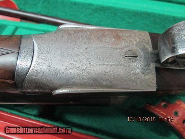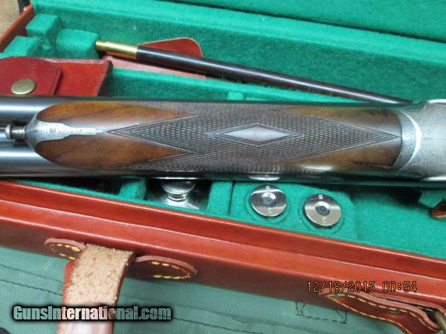 Description: JAMES PURDEY & SONS 16GA. SELF OPENER SIDELOCK DOUBLE SHOTGUN,CIRCA 1899, 26" CUT BARRELS WITH EXCELLENT BORES,CHOKED CYLINDER & CYLINDER.100% REBLACKEND BARRELS.EXCELLENT FIGURED FACTORY STOCKS WITH CRISP ORIGINAL CHECKERING,NO CRACKS OR OIL SOAKING,14 3/4" L.O.P. OVER DECELERATOR PAD(FACTORY LETTER STATED VULCANISED PAD) 1 1/2" DAC AND 2 1/4" DAH.AND 1/8" CAST OFF AT TOE,1/16 AT HEEL.RECEIVER SHOWS LIGHT MOTTLED CASE COLOR AND NO ENGRAVING WEAR,FULLY ENGRAVED PURDY TYPICAL ROSE AND SCROLL.FAST HANDLING GUN WITH GREAT MEASURMENTS AND FINE OVERALL CONDITION.VERY LIVELY TO THE HAND AND COMES WITH JAPANESE PURDEY CASE. THE BEST NAME IN THE GUN WORLD TODAY. 13950.00 PLUS 115.00 REGISTERED INSURED USPS SHIPPING.CHECKS TAKE 10 DAYS TO CLEAR,M/O'S TAKE 5 DAYS TO CLEAR,NO CREDIT CARDS TAKEN.CALL DANNY AT 828=698=8804.GOD BLESS AND MERRY CHRISTMAS! SOLD Curio/Relic: Yes |