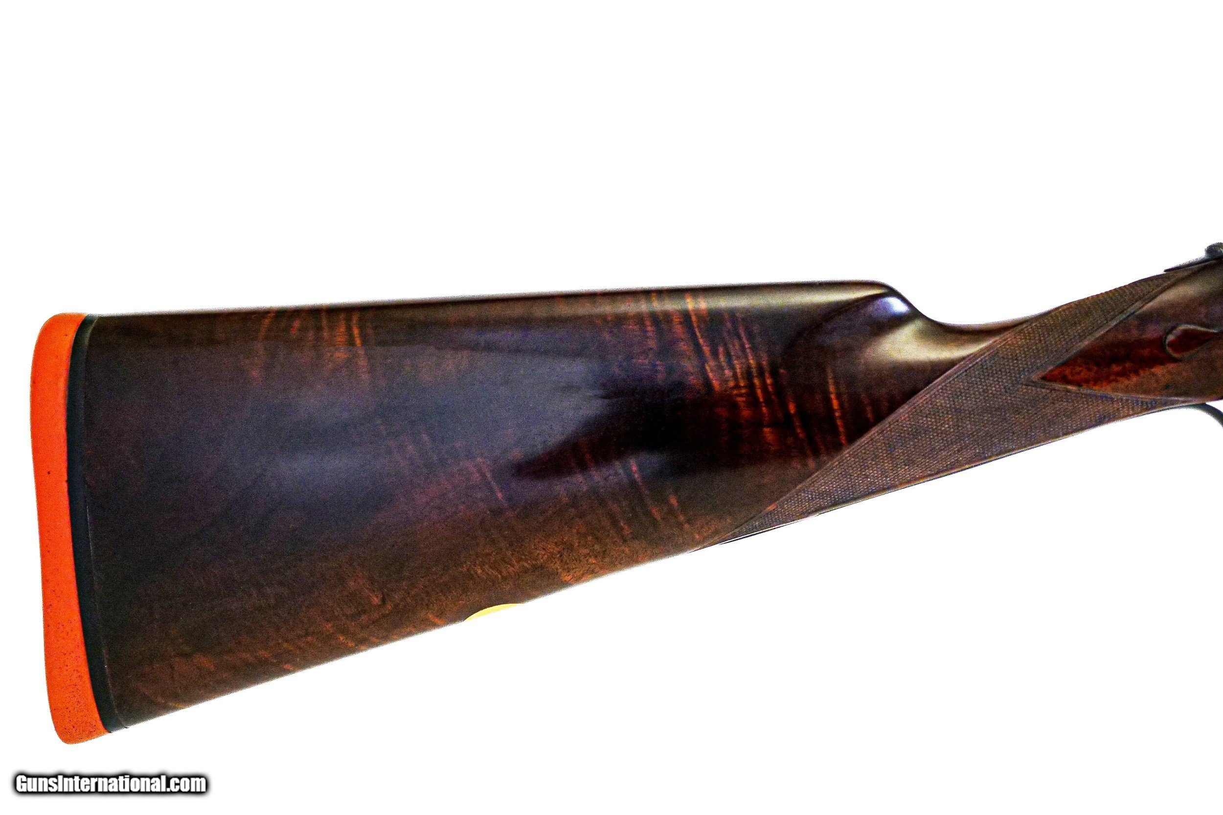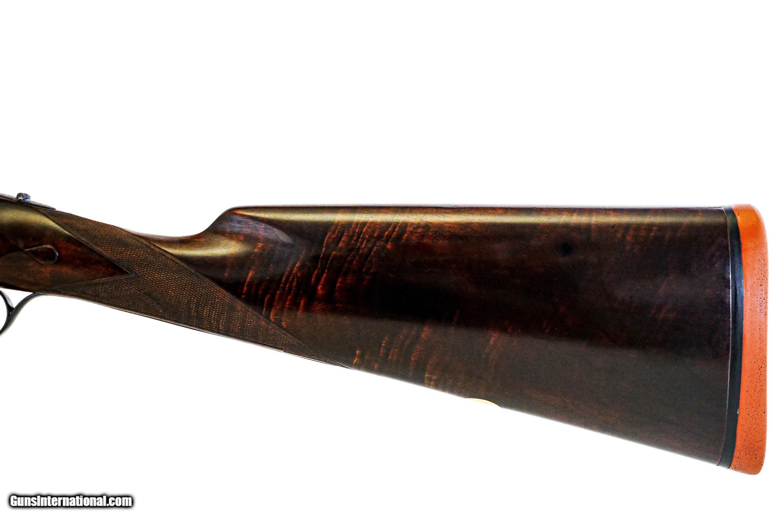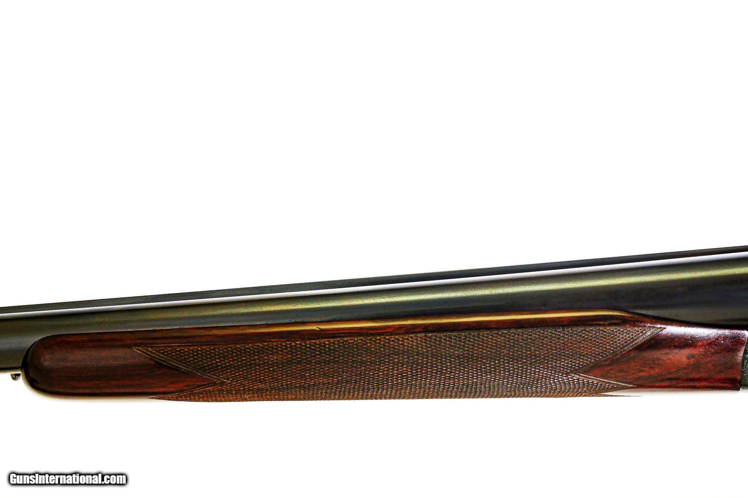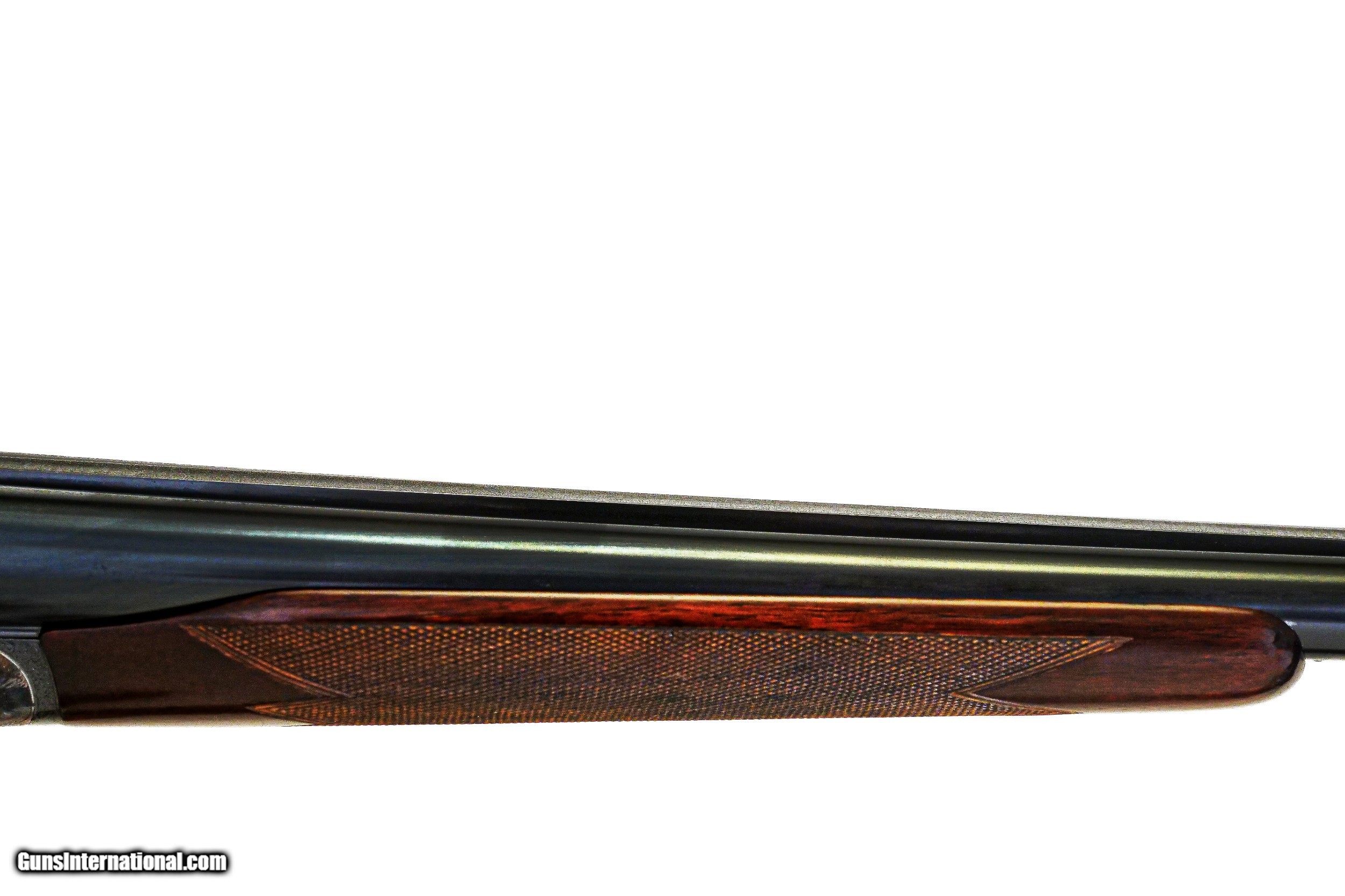 Description: James Purdey & Sons - Best, 12ga. Two Barrel Set, 29" IM/M & 31" F/F. 29” barrels choked Imp Cyl/Mod with 2 ¾” chambers and proofed for 1 ¼ oz. loads, 31” barrels chocked Full/Full with 3” chambers and proofed for 1 ½ oz. loads, double tiggers, straight grip stock, original Silvers pad, chopper lump barrels, one beavertail forend for both sets of barrels, side clips, hidden 3rd fastener, automatic ejectors, Beesley self opener, drop points, perfect barrels, perfect wood finish and checkering, perfect screws, virtually all the case coloring remaining, stunning full coverage rosette bouquet and scroll engraving, original leather case with canvas cover, includes extra firing pins in canister, outstanding prewar magnum that is very rare and as tight as the day that it was made, the ultimate pigeon gun, priced far below replacement cost, available for immediate delivery. Inv: 51344 7 lbs. 8 oz. 15” x 1 3/8” x 2 1/8” $38,995.00 SOLD |