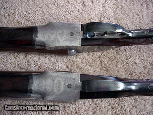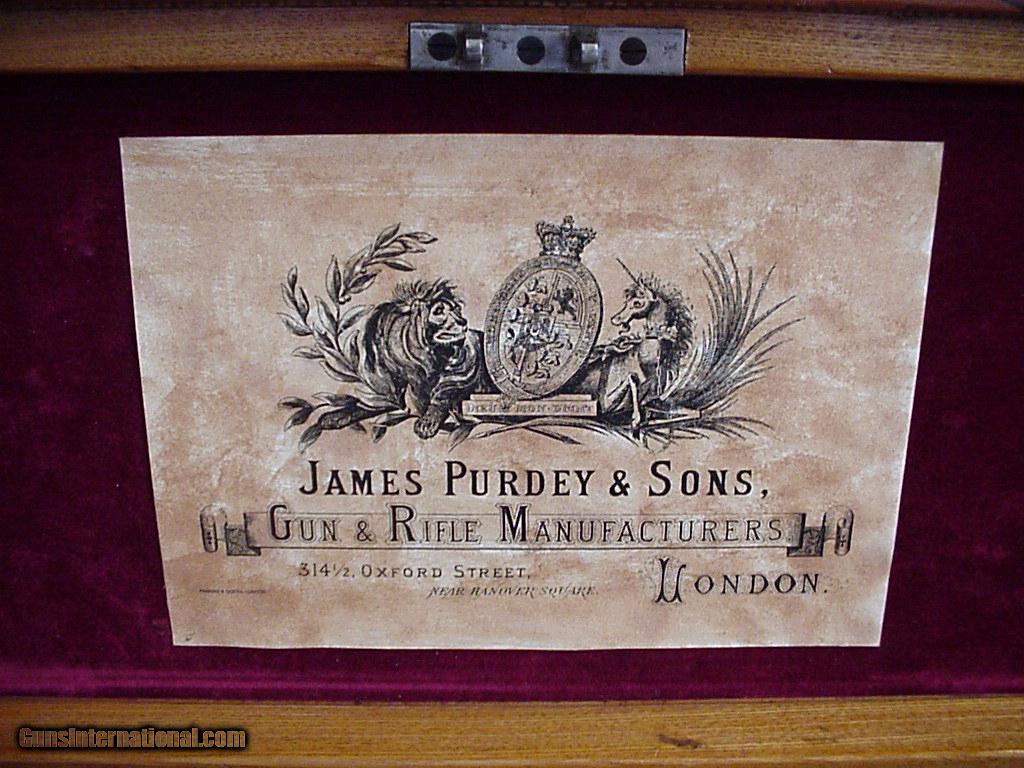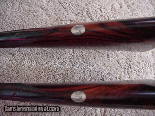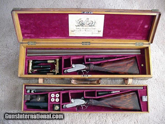 Description: This pair of Purdey Beasley self-openers was made at the end of 1881 and delivered to a gentleman named Mr. Howard in Feb. 1882, originally as extractor guns. Peter Blaine, of Purdey's told me that at that time this was fairly common, and at some point they were returned to Purdey's to add ejectors, which they retain today. In the 1960's they were both nitro proved at 3 tonnes. At some time between these two dates they ended up in the possession of The Earl of Guilford, Waldershare Park, Dover. This is borne out by the medallion on the case lid. Also in both butt-stocks are gold ovals with the initials "AJG". They are 12 gauge, still with 2 9/16 chambers. The damascus barrels measure 29 1/2 inches and are choked about .029" in each barrel. The weight of each gun is right at 6 pounds 8 ounces loaded. Length of pull on each is 14 1/4 inches and the drop is 1 3/16 inches each. They are cased with a full compliment of tools and are in extremely fine condition throughout. There is no evidence of any "gunsmithing" as is often found ond old guns. They both shoot perfectly and are a joy to carry in the field. Not to mention they are serious grouse killers. Please call for more details. Thank you. SOLD Antique: Yes Manufacturer: James Purdey & Sons Serial Number: 11095 &11096 |