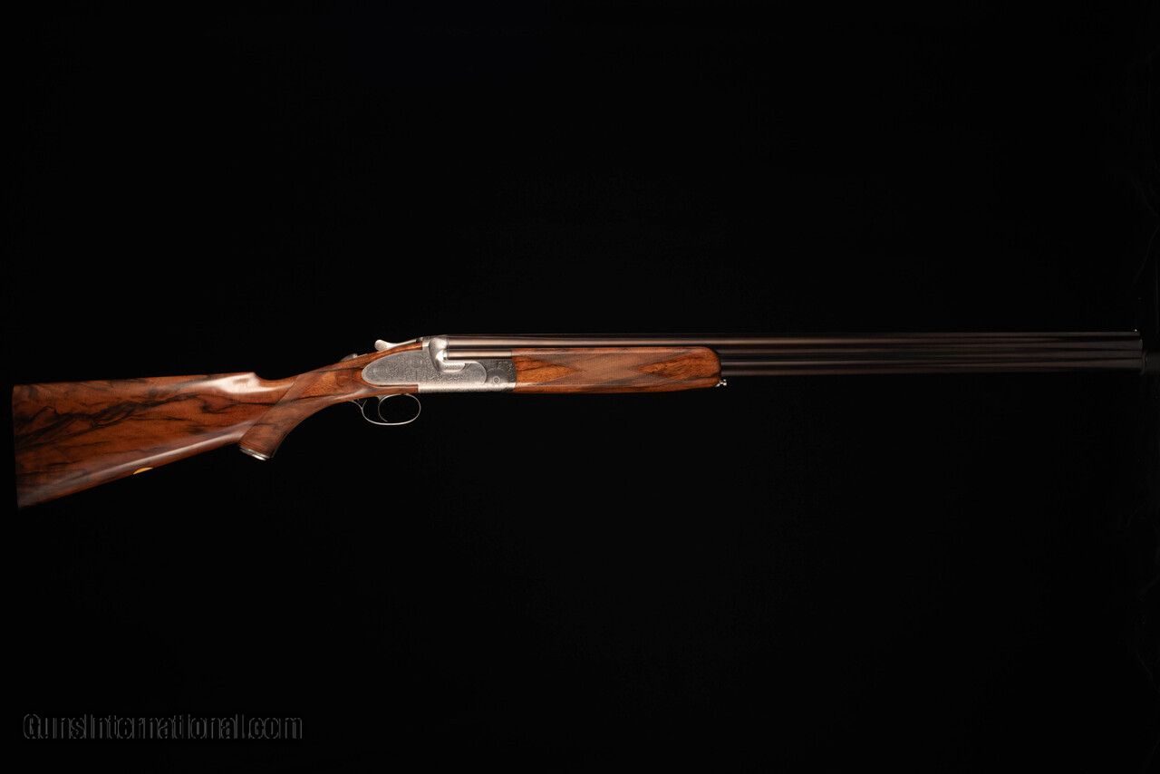 Paul Chung engraved and signed. Rose and scroll engraving. Silver finish action and furniture. Well figured, lighter colored, walnut stock. Top lever right of center, on face, and ejectors in time.