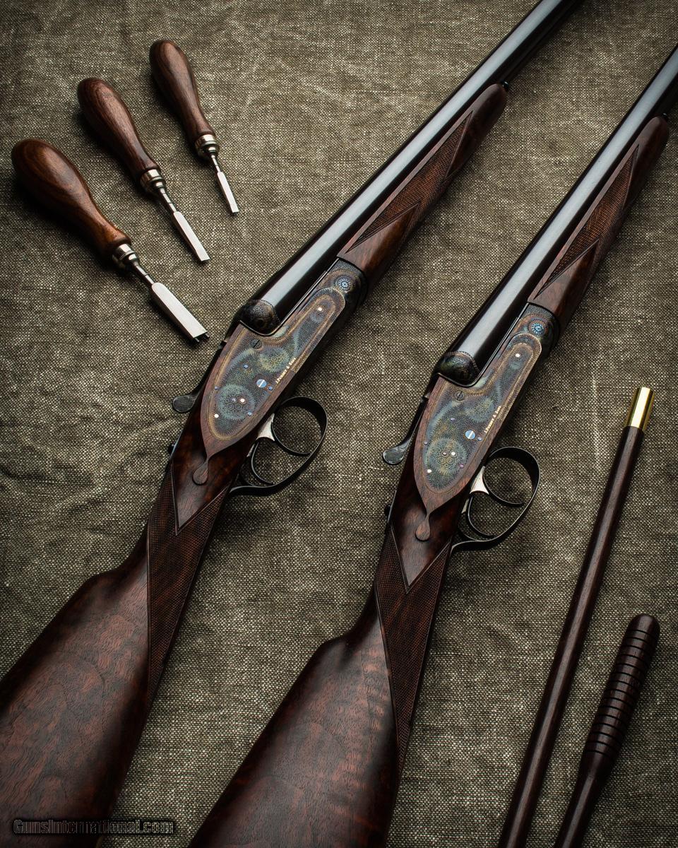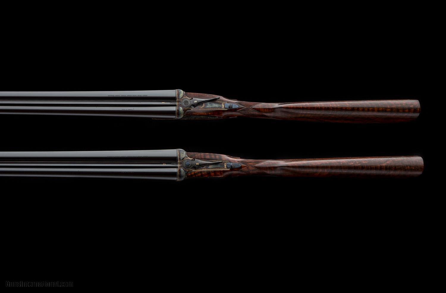 Description: Near new pair of Purdey 20 bore game guns in traditional rose & scroll engraving on case hardened action with side clips, gold lined cocking indicators and automatic safeties as well as disk set strikers, and articulated front triggers. Guns have 28” chopper lump barrels with hidden third bites and 1993 London proofs. Guns are exceptional and ready to hunt. Make: J. Purdey & Sons Caliber/Gauge: 20g Action: Sidelock Triggers: 2 Ejectors: Yes Barrel Length: 28" Rib: Concave Chamber: 2 3/4" Choke Right: IC Choke Left: 1/4 Stock: Straight LOP: 14 3/4" Weight: 5lbs 14.7oz Case: Motor Case SOLD |