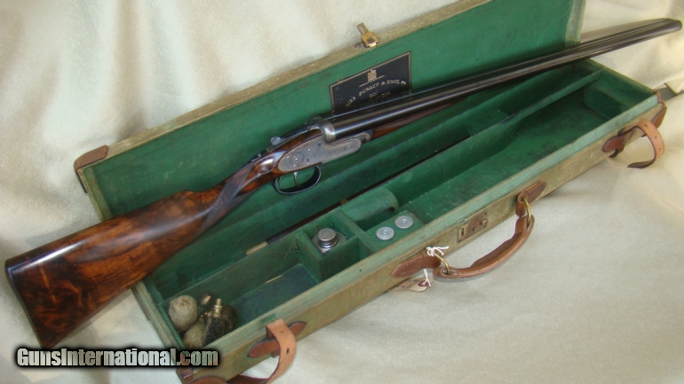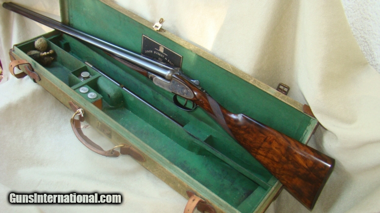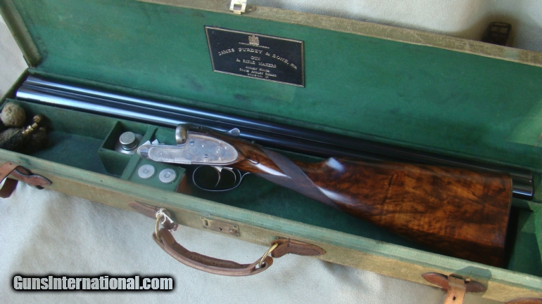 Description: Purdey 12 ga. pre-war best sidelock gamegun, 30" Sir Joseph Whitworth steel barrels, 2-1/2" chambers, choked improved cylinder and full (.010/.032). 1920s production features the finest Purdey scroll of the era, retains 75% case colors. Splinter forend, straight hand stock of highly figured true French walnut with extraordinary black figure and flame grain. Measures 1-1/2" comb, 2" heel, 14-1/2" LOP to a checkered butt. Fine example of Purdey's prime period. Ideal for those high pheasants! Weighs 6 lbs 10 oz. Cased in canvas case with leather corners and Purdey label. SOLD |