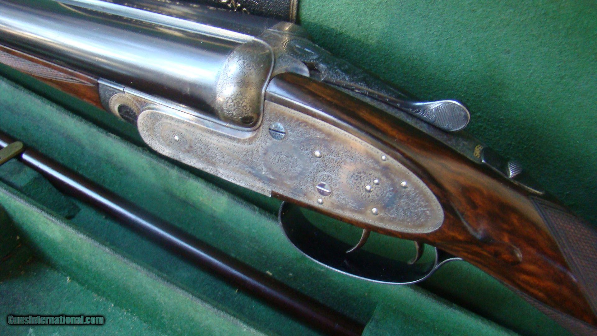 Description: Purdey 12 ga. pre-war best sidelock gamegun, 30" Sir Joseph Whitworth steel barrels, 2-1/2" chambers, choked improved cylinder and full (.010/.032). 1920s production features the finest Purdey scroll of the era, retains 75% case colors. Splinter forend, straight hand stock of highly figured true French walnut with extraordinary black figure and flame grain. Measures 1-1/2" comb, 2" heel, 14-1/2" LOP to a checkered butt. Fine example of Purdey's prime period. Ideal for those high pheasants! Weighs 6 lbs 10 oz. Cased in canvas case with leather corners and Purdey label. SOLD |