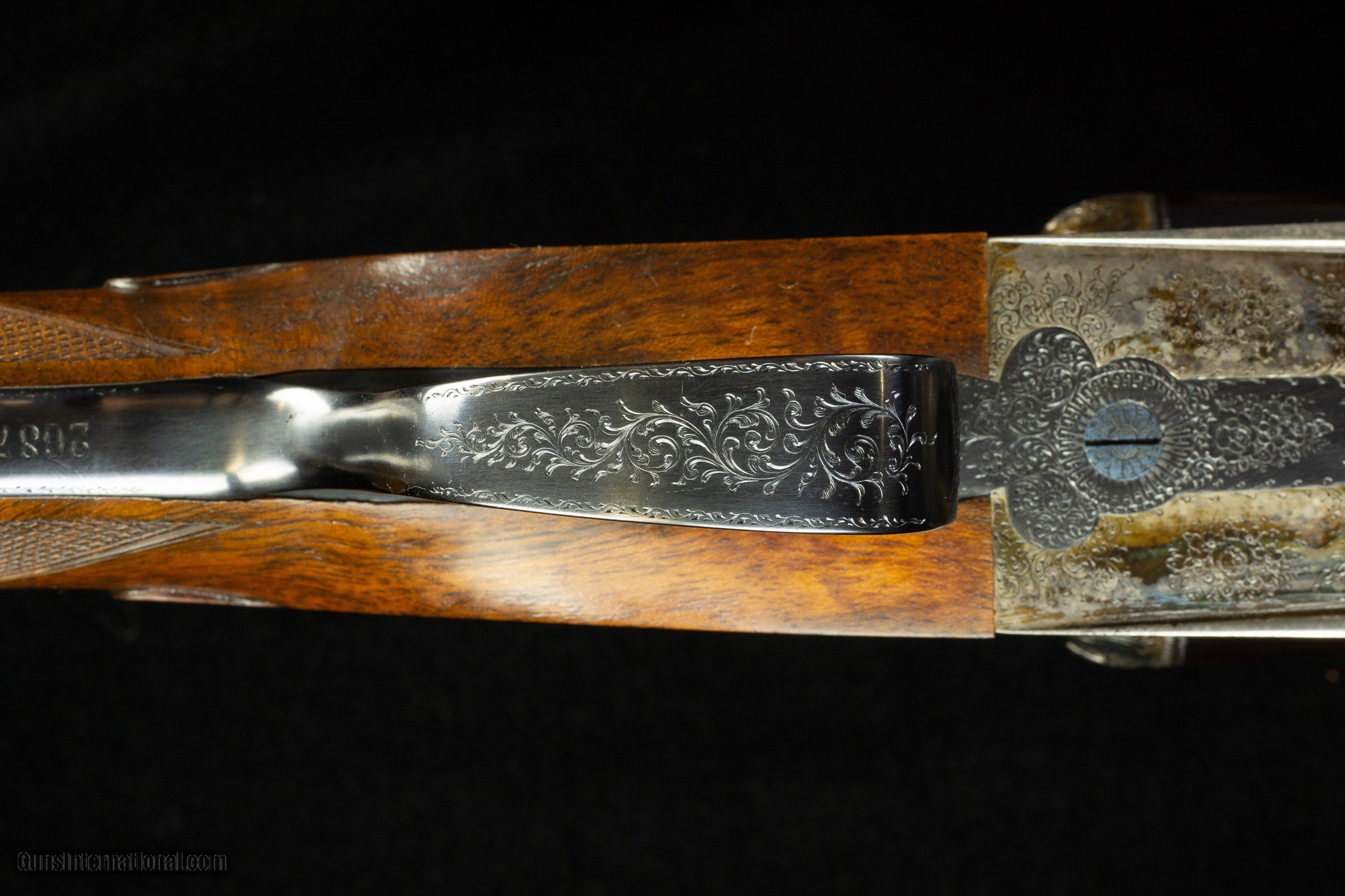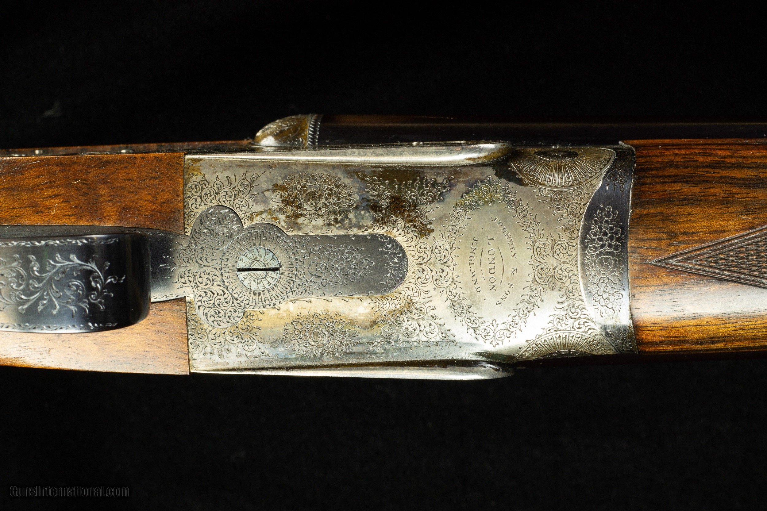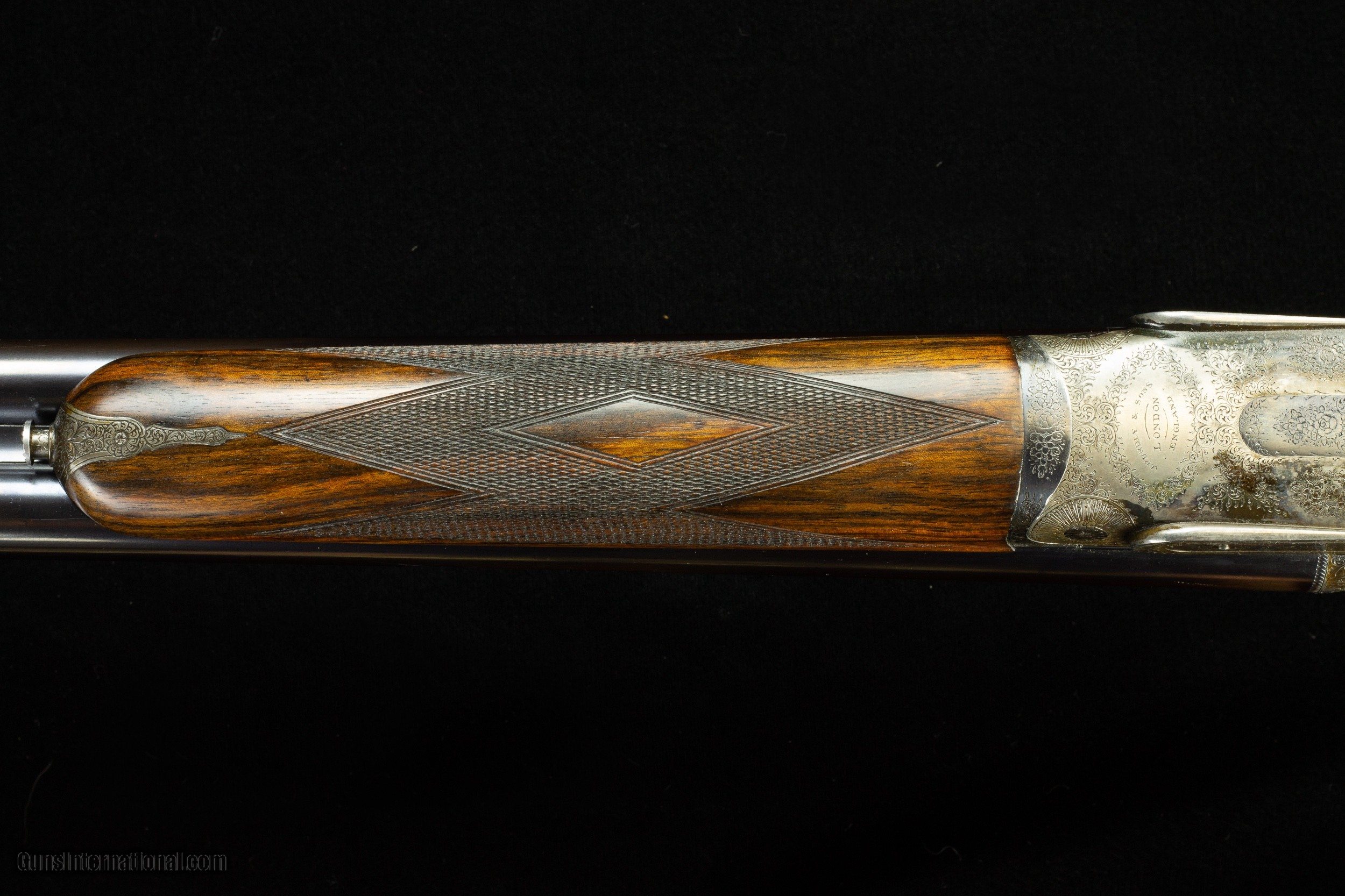 Description: James Purdey & Sons SxS 16 gauge. 28” bbl with solid raised rib, 2-3/4 chambers, and choked MOD/CYL. Single trigger, ejectors, with beautifully grained wood and equally impressive checkering. Engraved with traditional floral and scroll patterns. SOLD Stock Comb: 1-3/8 Stock Heel: 2-1/8 LOP: 14-7/8 Weight: 6lbs 4oz |