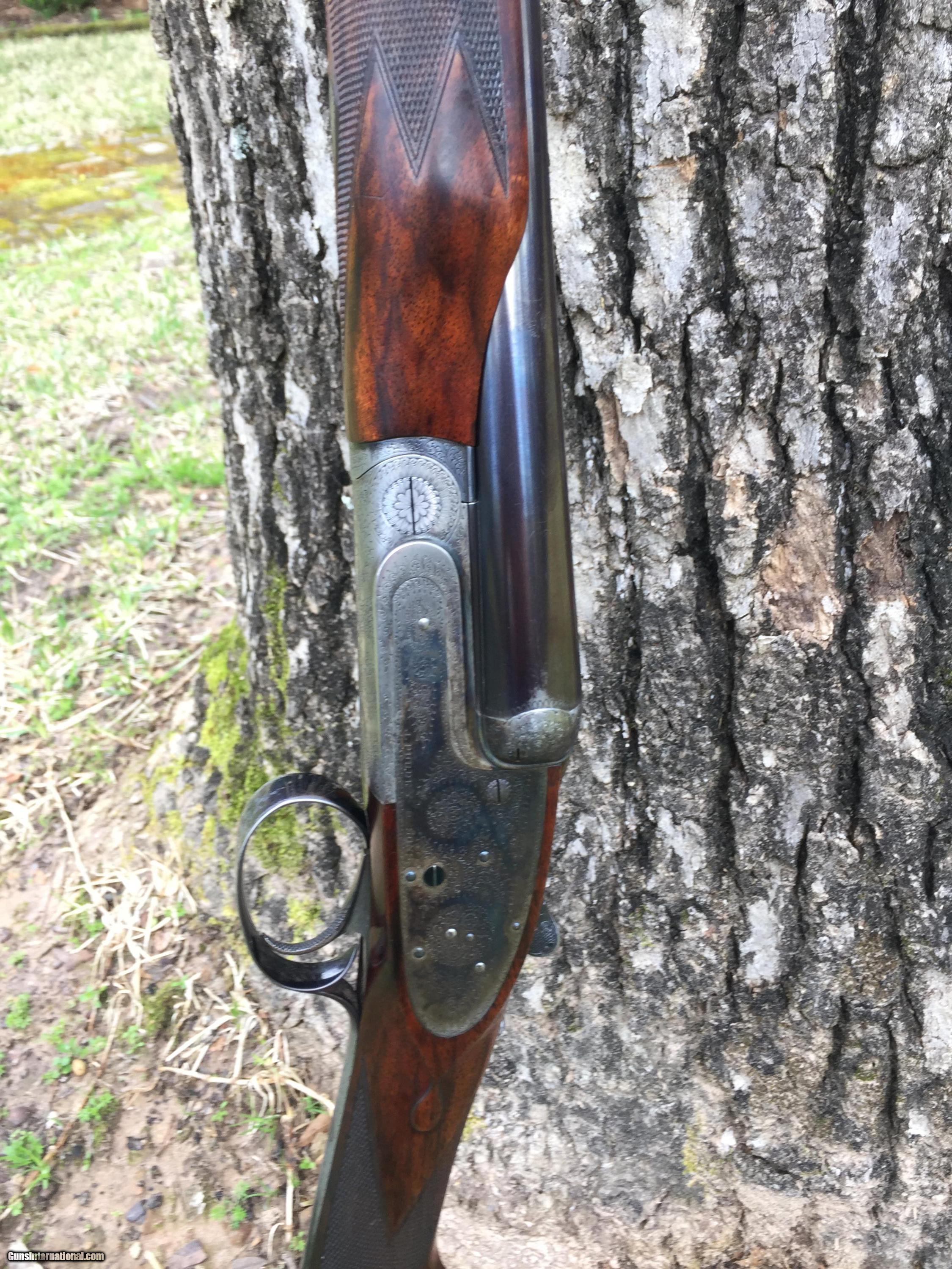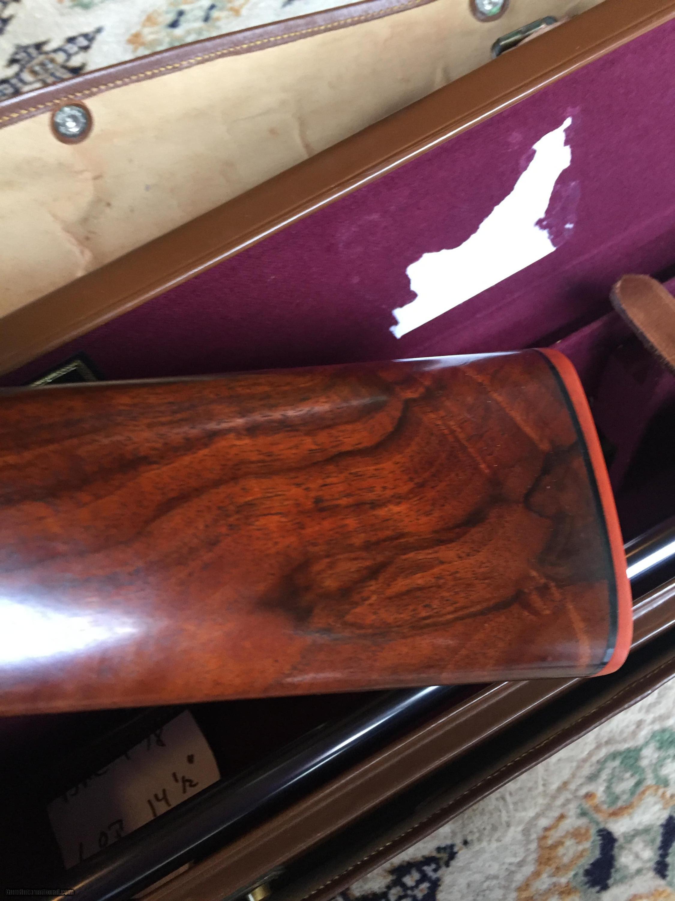 Description: Purdey .20 gauge circa 1970, a gun built to order for a family member and in the family's possession since taking delivery from Purdey. All original condition, 28" barrels M/F and 26" barrels IC/IC, silvers pad, self opener, non-auto safety, two gold beads per barrel, bluing shows some wear mostly on barrels under beaver tail forearm and trigger guard. Case colors estimated at 65%. Recently measured; LOP to center 15" DAC 1 5/8" DAH 1 5/8"; LOA 45", weight 5 lbs. 14 oz. Stock has hand rubbed oil finish and shows some minor handling marks. An expert English gunsmith inspected the gun this past week and reccommended against reconditioning the gun. He felt the gun was in too good of condition and would be more desirable unaltered. Nevertheless, if a buyer wanted the gun re-blued and case colors restored to 100%, he estimated a range of $2,500 to $5,000 and a time frame of less than 6 months to complete the work. From Purdey February 2017: On the matter of 27706. As you may already know this was built and sold in April 1971 with a set of 26 and 28 inch barrel. You will see on the underside of the barrel just in front of the hook, the initials GW, for George Wood a very senior Barrel makers at that time. On the forend iron you will see the initials BD although it may look more like PD. This was the Actioner Ben Delay, who was my old gun making master and so there is every chance I may have made parts of your gun. The gun was stocked by Harold Ben’s brother with the beaver tail forend. Engraving was done by my old pal Danny O’Brien. Mr Woolmer did the ejector work and Mr Swanson finished the gun on the 28th Jan 1971. It was stocked at 1 9/16” and 1 7/16” which is close to the usual 2” to 1 ½" . The LOP Length of pull or mid stock length was 15”. SOLD |