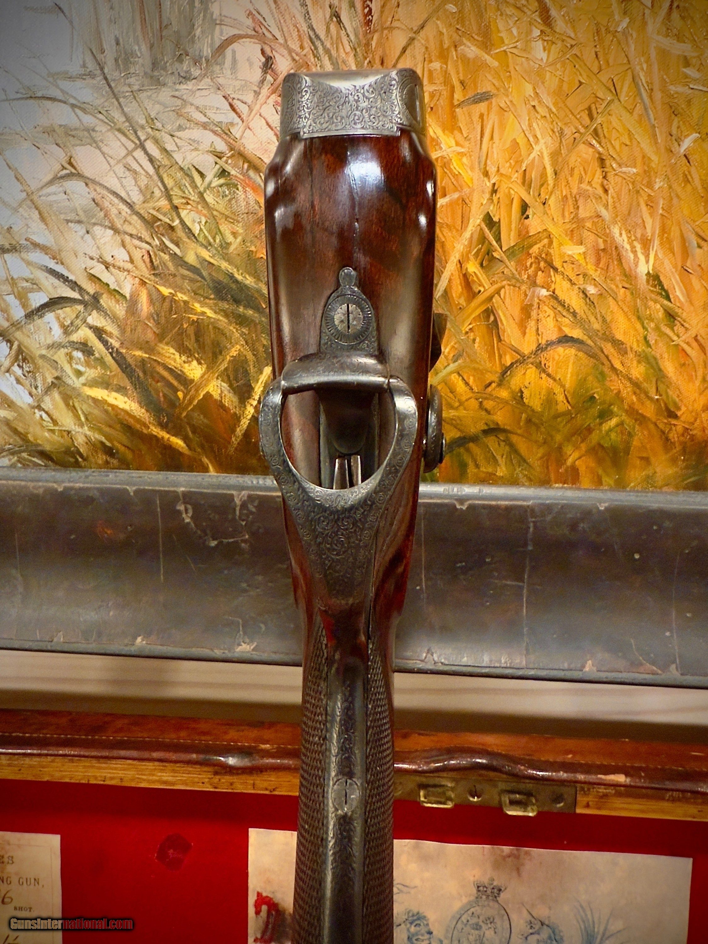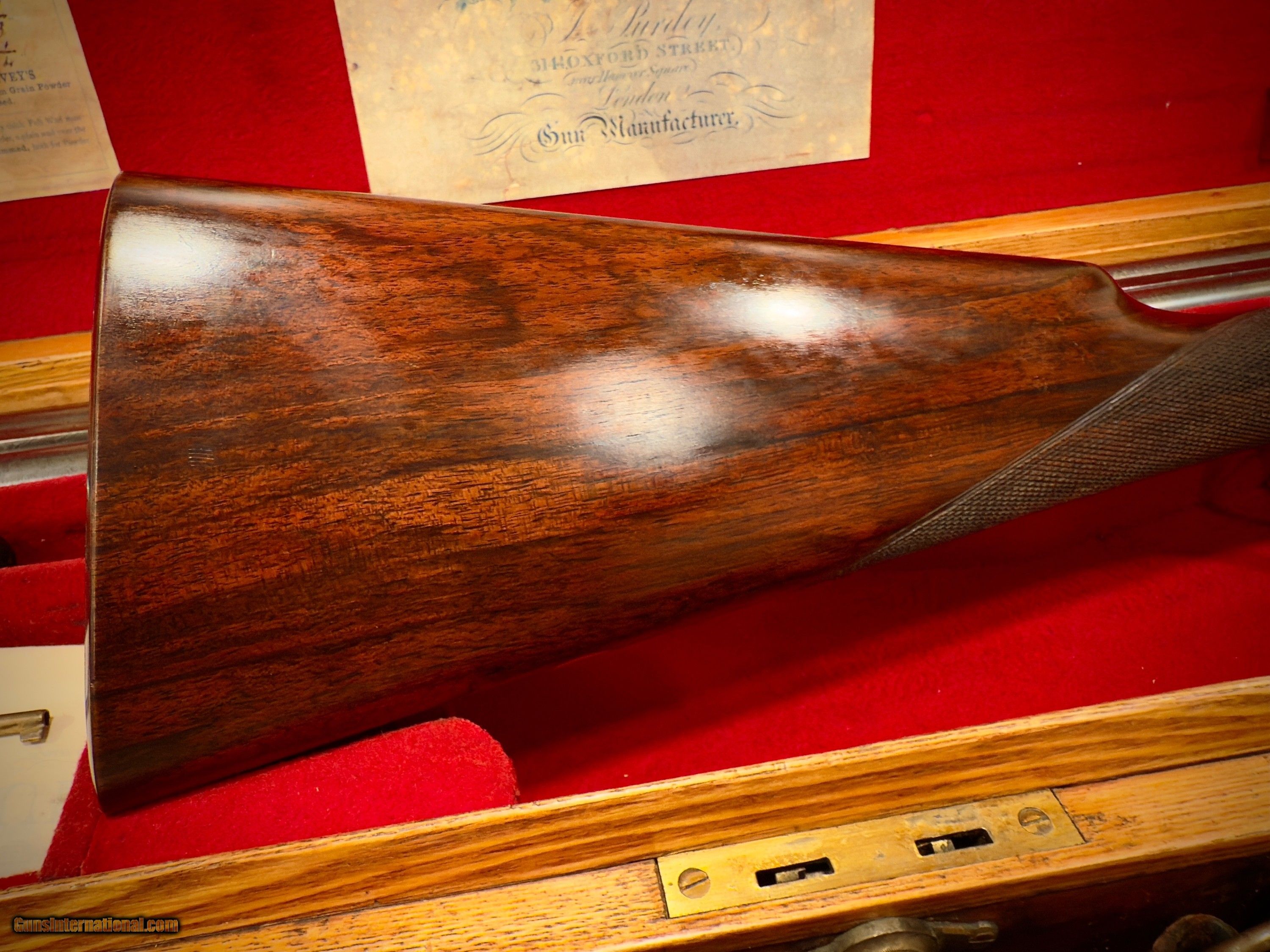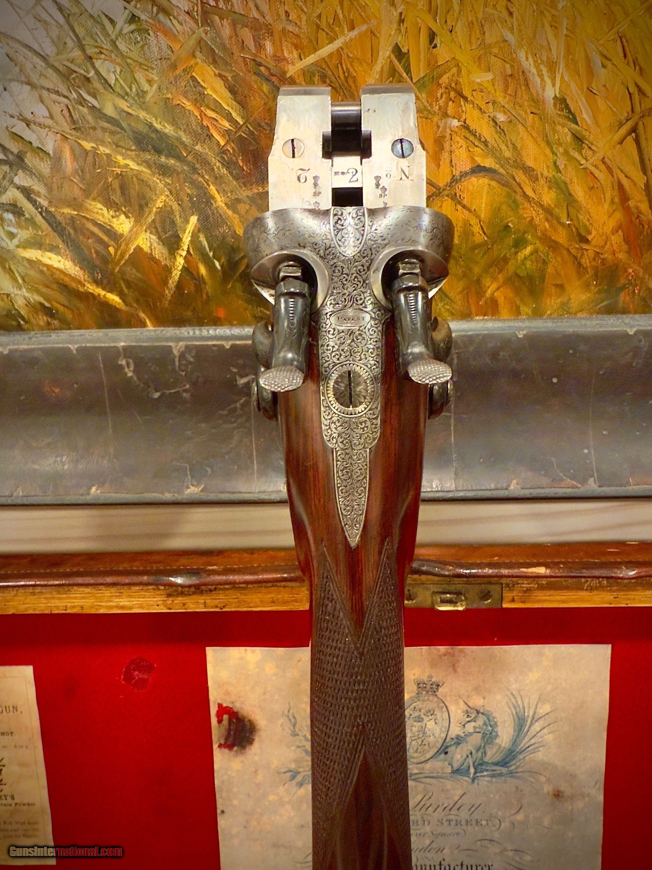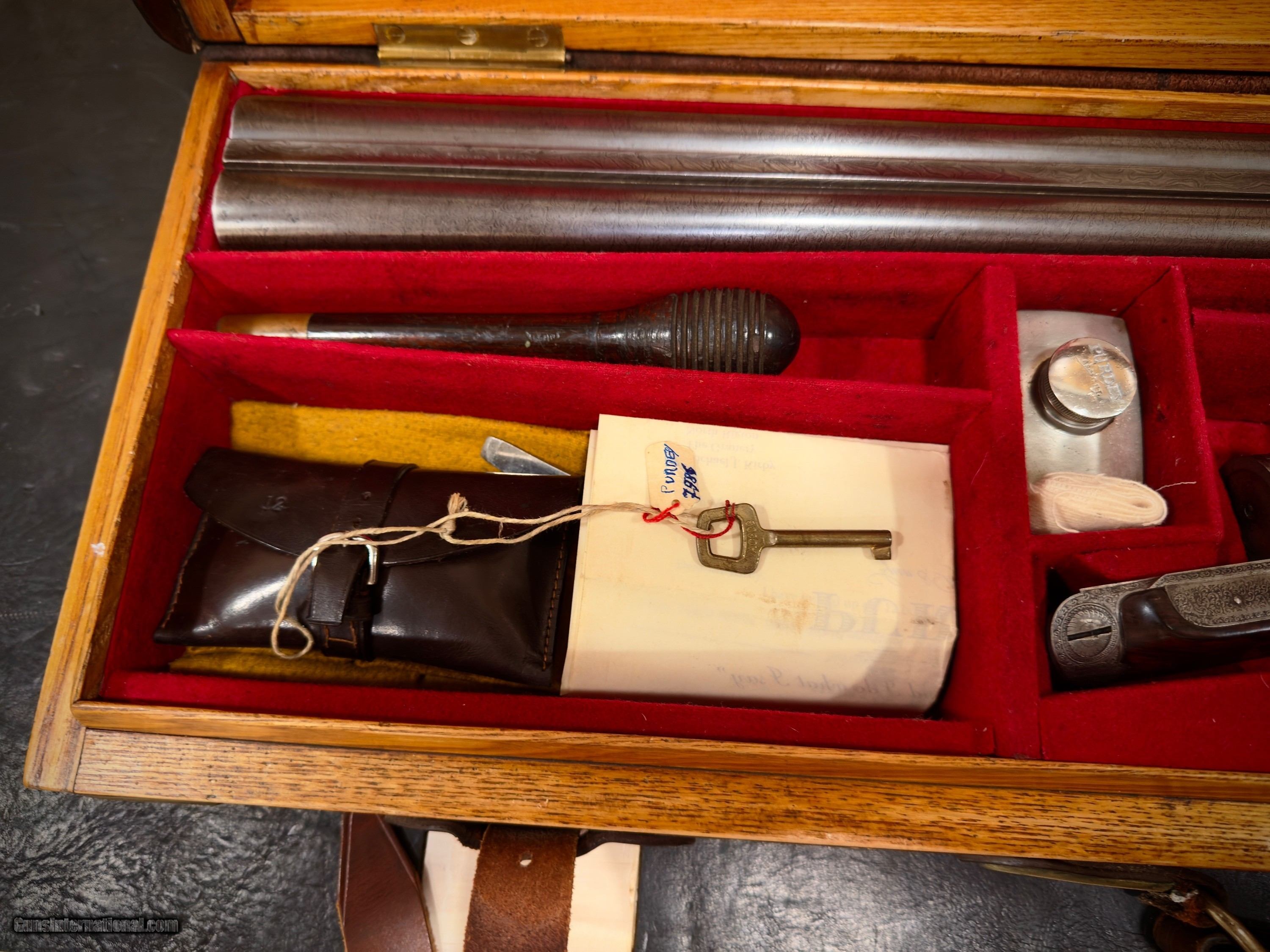 Description: James Purdey & Sons 12 gauge antique bar in wood hammergun, has been proofed for modern shells. This beautiful work of art has finally made it to the US and is available here at Selwood Farma. James Purdey & Sons has confirmed that this 12 gauge thumblever bar-in-wood hammergun (serial number 79xx) was manufactured in 1869. What makes Purdey’s pedigree even more extraordinary is the fact that all shotgun manufacturing, engraving, fitting, etc., down to the thousandth of an inch, was hand-crafted without the assistance of automated machining, computer measurements, or electronic assistance. Absolute master craftsmen invested hundreds of hours into each shotgun they made by hand, with hundreds of additional hours devoted to the engraving, fitting & finishing of each Best Quality piece. An unusual find with all original components, a thumb-lever release mechanism, and original numbered case with tools, No. 79xx’s handsome sidelocks are in keeping with the usage of 'Purdey' on each lock, as the '& Sons' was not added until the end of 1877. In beautiful condition, the action, locks, hammers, and top strap are hand-engraved in ornate and finely detailed patterns in typical Purdey fashion: acanthus scrollwork and spiral constellations on both locks and each side of the rounded action, with similar bold acanthus engraving on the floorplate; vine scrollwork on the trigger guard and thumb lever; extremely fine and bold scrollwork on the toplever and elongated dolphin-style non-rebounding hammers, with “PATENT” in an oval; and exceptional vinework detailing engraved on the fences. The maker’s name “PURDEY” bolsters the bottom of each lock. Double bite action. Excellent condition on the interior of the action, with minimal powder marks on the face. Matching serial numbers “79xx” throughout the gun on the barrels, fore-end, and trigger guard. The original antique London proof house black powder proof marks are on the left and right barrel flats, denoting the “definitive” proof mark with a script “GP” under a crown. The accompanying antique London “view” mark “V” under a crown is also on the barrel flats. These same original London accompanying proof marks are likewise on the action flats. The action flats are also marked “No. 2” as the second “Best Quality” piece in an original four gun set as annotated by Purdeys. This gun comes in at a lightweight 6 pounds 11 ounces. Barrels have undergone complete inspection and re-proofing, with the flats stamped to confirm their safety & compliance with modern testing standards. Contemporary Birmingham proof marks show that it has undergone British Nitro Proof (NP) testing with the contemporary “BP” under a crown indicating Birmingham Proof House measurements and standard “NITRO PROOF” compliance for 12 bore chambers (“12” in a diamond). Additional London proof marks show that it has undergone more recent British Nitro Proof (NP) testing, including the London heraldic marks of “NP” surmounted by an arm dexter in armor holding a scimitar. Later re-testing marks are also present, with the London script “R” under a crown denoting reproof, as well as post-2005 testing as confirmed by the “STD” under a crown, all indicating Proof House re-proofing measurements and standard nitro proof compliance to accommodate modern 2 & 3/4” shells (“70MM” annotated on the flats showing 70 mm metric measurement). As Terry Wieland highlights in his book “Vintage British Shotguns,” he states “If you buy an English gun… and the proof marks show it has been nitro proofed – that is, proven with smokeless powder – you know it’s safe to shoot with loads of the length and gauge marked.” Exceptional Damascus barrels with beautiful patterns and great measurements – rare to find a Purdey with original Damascus in such outstanding condition. The 30” barrels with brass sight bead have been well taken care of over the past century and a half, with seemingly little use, and outstanding strong measurements coming in at 25,000th thickness for the right wall and 30,000th left wall thickness, and a flawless mirrored interior – no marks or pitting. With continued good care and cleaning after each shoot, this collector’s item should offer great future hunting well into the next century – a future family heirloom for generations to come. The chambers with extractors are sized for 2 & 3/4” (70 mm) shells, and has chokes of approximately improved cylinder in both barrels. The interior of the bores are mirrors, while the outer barrels have handsome brown aged Damascus coloring with only the faintest of handling marks. The well figured stock has nice sharp checkering throughout the hand and a handsome dark grain, checkered buttplate, a brass oval on the underside of the stock suitable for engraving, and a 14 & 5/8” pull. There is the finest seam in the wood grain just in front of the trigger plate (not crack) but absolutely no break whatsoever in the grain and zero separation to the wood – looks to be original to the stock and quite old, but wanted to note any slight blemish for full disclosure. The barrels lock up tight with absolutely no play in the action. Beautifully patterned Damascus game rib is engraved with the maker’s details and reads “J. PURDEY, 314 ½ OXFORD STREET, LONDON.” Sharply checkered fore-end wood with engraved fore-end base and tip and crosspin release. Good overall length and fit to this gun with its slightly longer stock and 30” barrels provide for balanced shooting. This collector’s item is housed in its original Victorian beautiful oak and leather Purdey gun case with red felt interior, leather straps and leather handle all in good condition, with brass hardware, brass corners, lock and original key. The antique hammergun case has its original antique Purdey maker’s decals matched to this gun, showing some age-related staining and wear. There is also some 